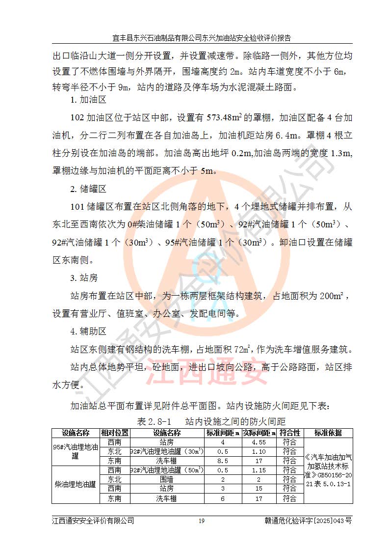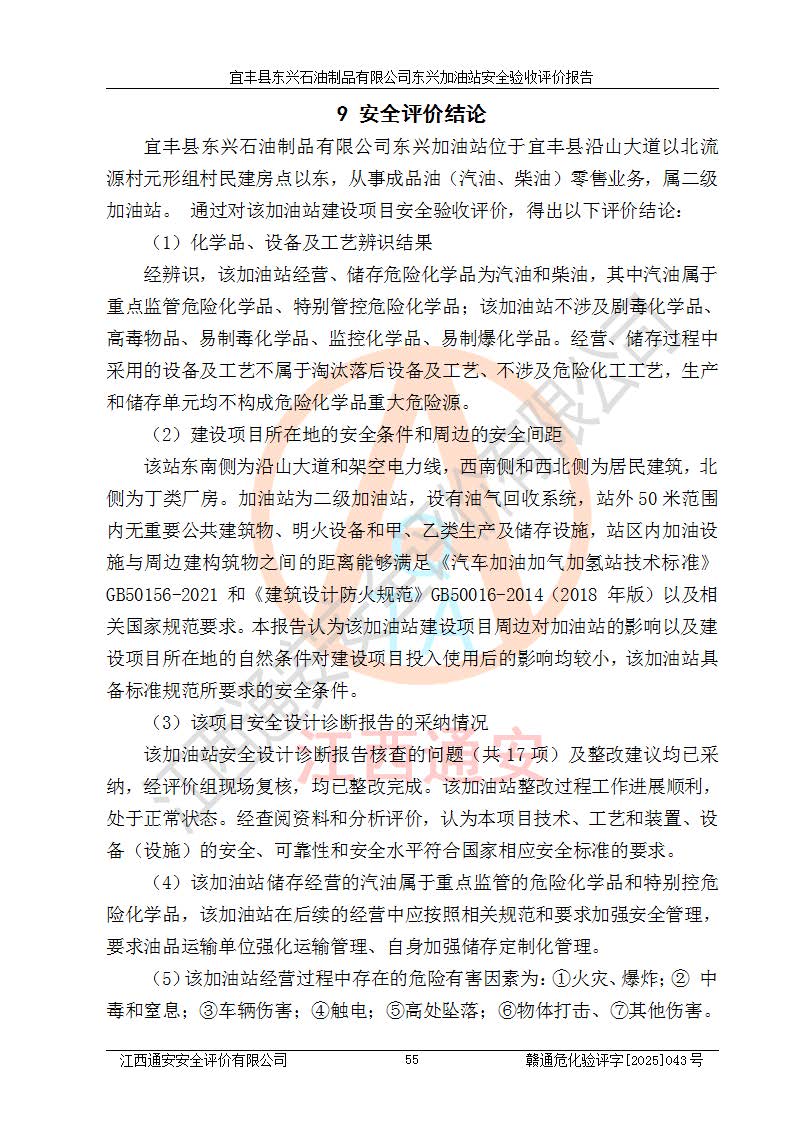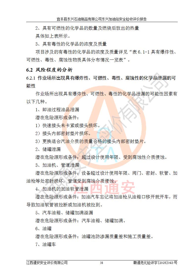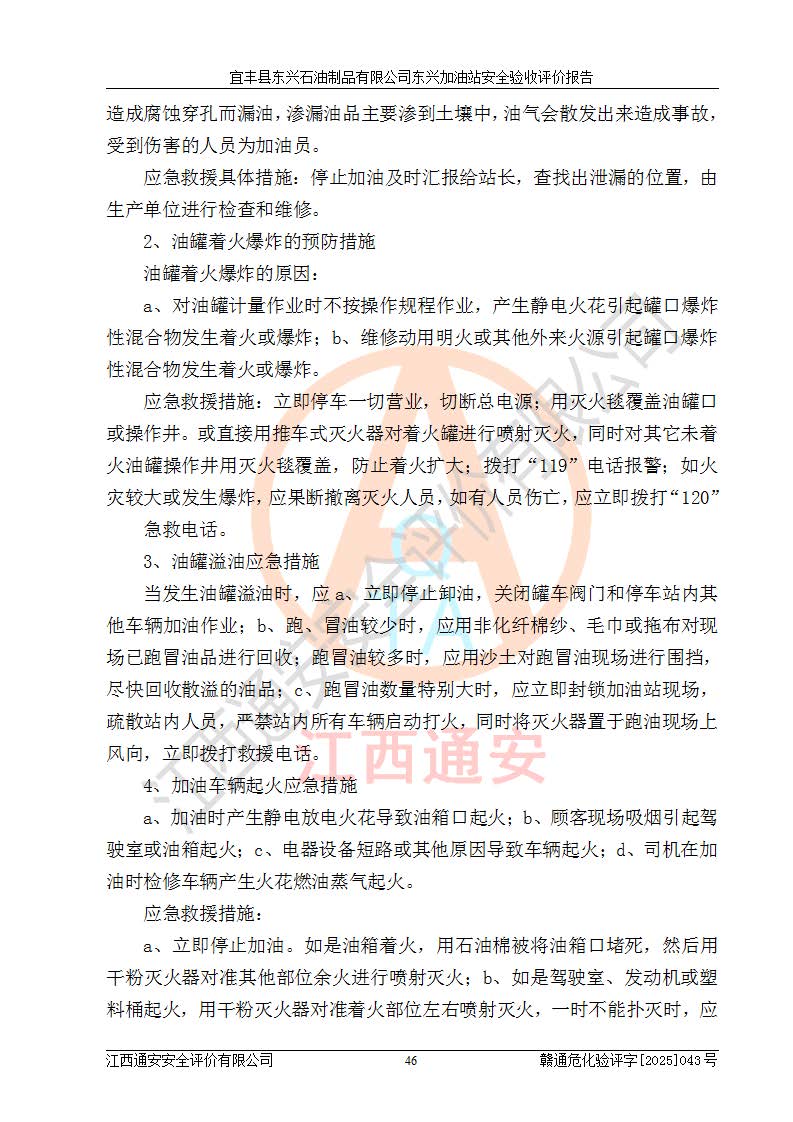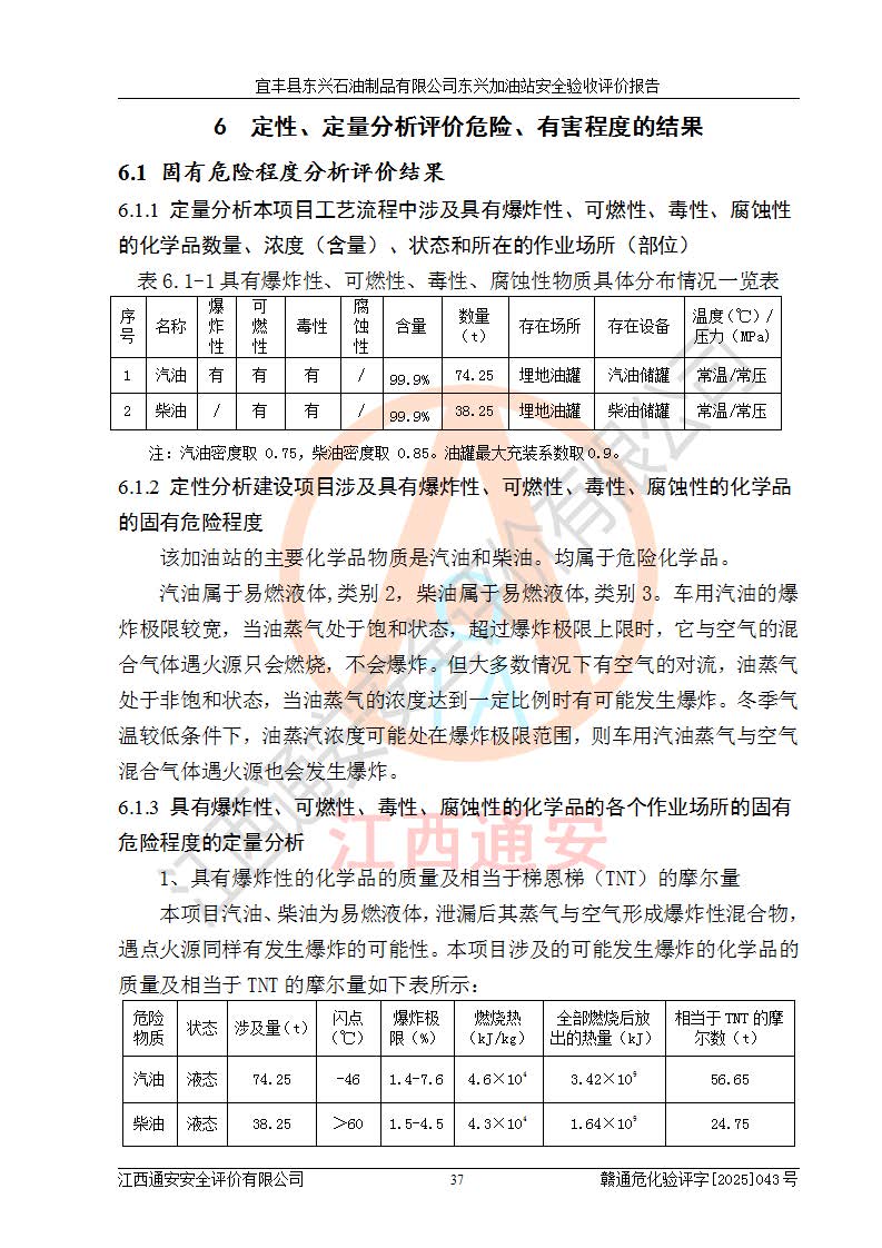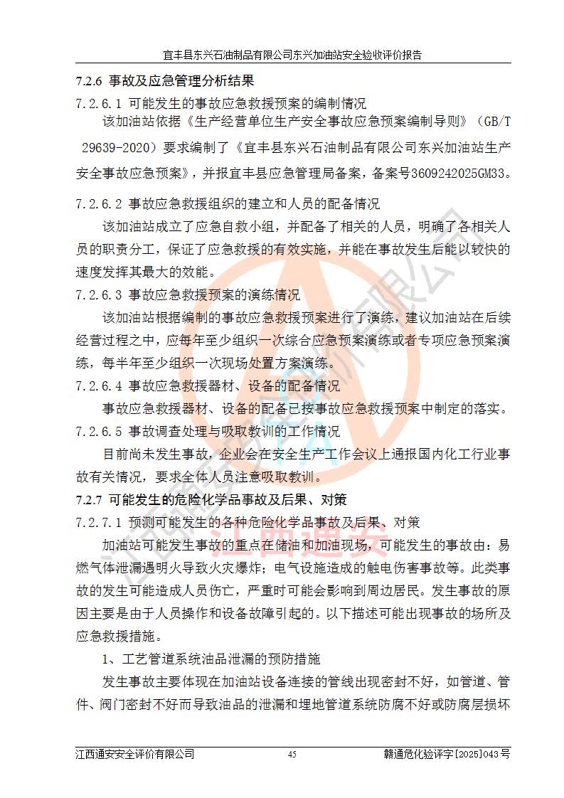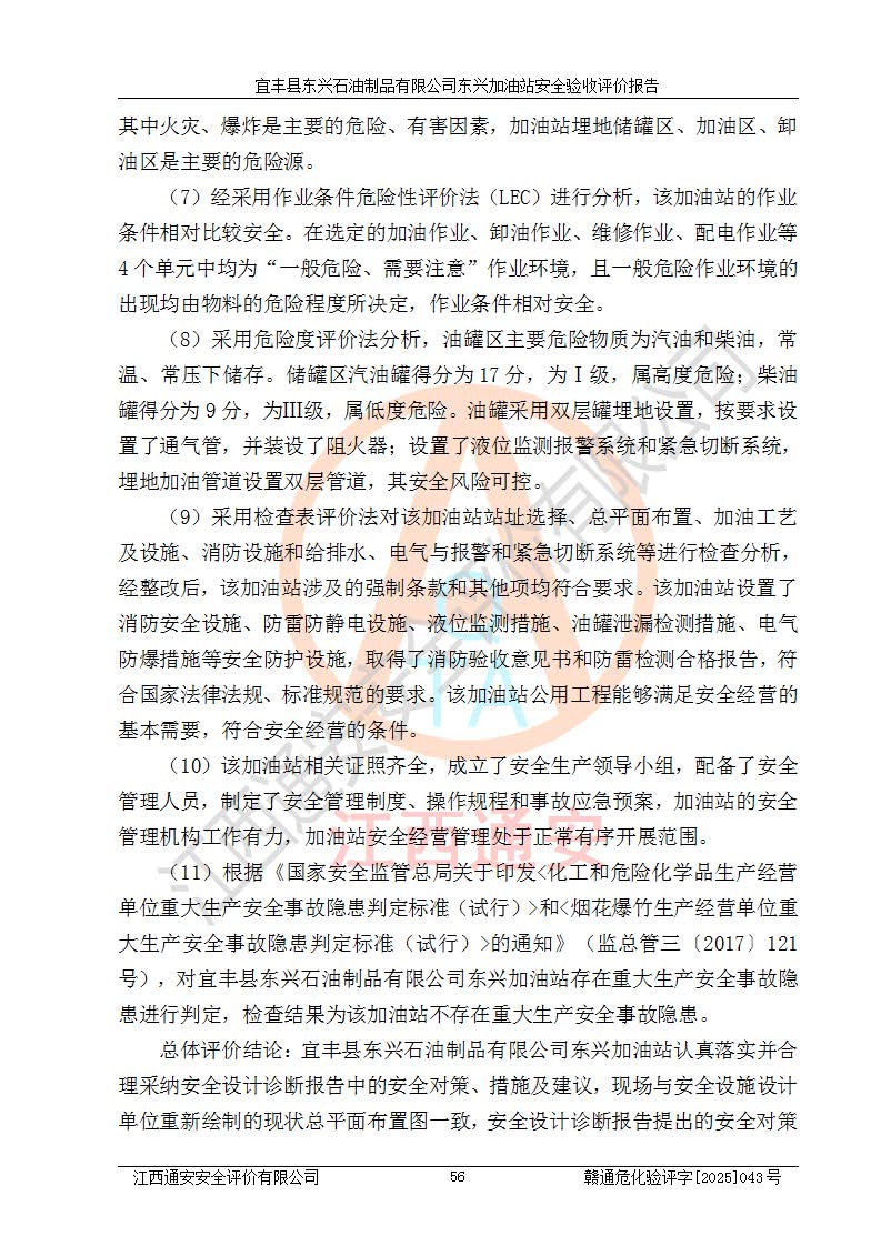 其它 | 一、安全狀況綜合評述 宜豐縣東興石油制品有限公司東興加油站位于宜豐縣沿山大道以北流源村元形組村民建房點(diǎn)以東,從事成品油(汽油、柴油)零售業(yè)務(wù),屬二級加油站。 通過對該加油站建設(shè)項(xiàng)目安全驗(yàn)收評價(jià),得出以下評價(jià)結(jié)論: (1)化學(xué)品、設(shè)備及工藝辨識結(jié)果 經(jīng)辨識,該加油站經(jīng)營、儲存危險(xiǎn)化學(xué)品為汽油和柴油,其中汽油屬于重點(diǎn)監(jiān)管危險(xiǎn)化學(xué)品、特別管控危險(xiǎn)化學(xué)品;該加油站不涉及劇毒化學(xué)品、高毒物品、易制毒化學(xué)品、監(jiān)控化學(xué)品、易制爆化學(xué)品。經(jīng)營、儲存過程中采用的設(shè)備及工藝不屬于淘汰落后設(shè)備及工藝、不涉及危險(xiǎn)化工工藝,生產(chǎn)和儲存單元均不構(gòu)成危險(xiǎn)化學(xué)品重大危險(xiǎn)源。 (2)建設(shè)項(xiàng)目所在地的安全條件和周邊的安全間距 該站東南側(cè)為沿山大道和架空電力線,西南側(cè)和西北側(cè)為居民建筑,北側(cè)為丁類廠房。加油站為二級加油站,設(shè)有油氣回收系統(tǒng),站外50米范圍內(nèi)無重要公共建筑物、明火設(shè)備和甲、乙類生產(chǎn)及儲存設(shè)施,站區(qū)內(nèi)加油設(shè)施與周邊建構(gòu)筑物之間的距離能夠滿足《汽車加油加氣加氫站技術(shù)標(biāo)準(zhǔn)》GB50156-2021 和《建筑設(shè)計(jì)防火規(guī)范》GB50016-2014(2018 年版)以及相關(guān)**規(guī)范要求。本報(bào)告認(rèn)為該加油站建設(shè)項(xiàng)目周邊對加油站的影響以及建設(shè)項(xiàng)目所在地的自然條件對建設(shè)項(xiàng)目投入使用后的影響均較小,該加油站具備標(biāo)準(zhǔn)規(guī)范所要求的安全條件。 (3)該項(xiàng)目安全設(shè)計(jì)診斷報(bào)告的采納情況 該加油站安全設(shè)計(jì)診斷報(bào)告核查的問題(共17項(xiàng))及整改建議均已采納,經(jīng)評價(jià)組現(xiàn)場復(fù)核,均已整改完成。該加油站整改過程工作進(jìn)展順利,處于正常狀態(tài)。經(jīng)查閱資料和分析評價(jià),認(rèn)為本項(xiàng)目技術(shù)、工藝和裝置、設(shè)備(設(shè)施)的安全、可靠性和安全水平符合**相應(yīng)安全標(biāo)準(zhǔn)的要求。 (4)該加油站儲存經(jīng)營的汽油屬于重點(diǎn)監(jiān)管的危險(xiǎn)化學(xué)品和特別控危險(xiǎn)化學(xué)品,該加油站在后續(xù)的經(jīng)營中應(yīng)按照相關(guān)規(guī)范和要求加強(qiáng)安全管理,要求油品運(yùn)輸單位強(qiáng)化運(yùn)輸管理、自身加強(qiáng)儲存定制化管理。 (5)該加油站經(jīng)營過程中存在的危險(xiǎn)有害因素為:①火災(zāi)、爆炸;② 中毒和窒息;③**傷害;④觸電;⑤高處墜落;⑥物體打擊、⑦其他傷害。 其中火災(zāi)、爆炸是主要的危險(xiǎn)、有害因素,加油站埋地儲罐區(qū)、加油區(qū)、卸 油區(qū)是主要的危險(xiǎn)源。 (7)經(jīng)采用作業(yè)條件危險(xiǎn)性評價(jià)法(LEC)進(jìn)行分析,該加油站的作業(yè)條件相對比較安全。在選定的加油作業(yè)、卸油作業(yè)、維修作業(yè)、配電作業(yè)等4個(gè)單元中均為“一般危險(xiǎn)、需要注意”作業(yè)環(huán)境,且一般危險(xiǎn)作業(yè)環(huán)境的出現(xiàn)均由物料的危險(xiǎn)程度所決定,作業(yè)條件相對安全。 (8)采用危險(xiǎn)度評價(jià)法分析,油罐區(qū)主要危險(xiǎn)物質(zhì)為汽油和柴油,常溫、常壓下儲存。儲罐區(qū)汽油罐為Ⅰ級,屬高度危險(xiǎn);柴油罐得分為Ⅲ級,屬低度危險(xiǎn)。油罐采用雙層罐埋地設(shè)置,按要求設(shè)置了通氣管,并裝設(shè)了阻火器;設(shè)置了液位監(jiān)測報(bào)警系統(tǒng)和緊急切斷系統(tǒng),埋地加油管道設(shè)置雙層管道,其安全風(fēng)險(xiǎn)可控。 (9)采用檢查表評價(jià)法對該加油站站址選擇、總平面布置、加油工藝及設(shè)施、消防設(shè)施和給排水、電氣與報(bào)警和緊急切斷系統(tǒng)等進(jìn)行檢查分析,經(jīng)整改后,該加油站涉及的強(qiáng)制條款和其他項(xiàng)均符合要求。該加油站設(shè)置了消防安全設(shè)施、防雷防靜電設(shè)施、液位監(jiān)測措施、油罐泄漏檢測措施、電氣防爆措施等安全防護(hù)設(shè)施,取得了消防驗(yàn)收意見書和防雷檢測合格報(bào)告,符合**法律法規(guī)、標(biāo)準(zhǔn)規(guī)范的要求。該加油站公用工程能夠滿足安全經(jīng)營的基本需要,符合安全經(jīng)營的條件。 (10)該加油站相關(guān)證照齊全,成立了安全生產(chǎn)**小組,配備了安全管理人員,制定了安全管理制度、操作規(guī)程和事故應(yīng)急預(yù)案,加油站的安全管理機(jī)構(gòu)工作有力,加油站安全經(jīng)營管理處于正常有序開展范圍。 (11)對宜豐縣東興石油制品有限公司東興加油站存在重大生產(chǎn)安全事故隱患進(jìn)行判定,檢查結(jié)果為該加油站不存在重大生產(chǎn)安全事故隱患。 總體評價(jià)結(jié)論:宜豐縣東興石油制品有限公司東興加油站認(rèn)真落實(shí)并合理采納安全設(shè)計(jì)診斷報(bào)告中的安全對策、措施及建議,現(xiàn)場與安全設(shè)施設(shè)計(jì)單位重新繪制的現(xiàn)狀總平面布置圖一致,安全設(shè)計(jì)診斷報(bào)告提出的安全對策措施已落實(shí)到位。對潛在的危險(xiǎn)、 有