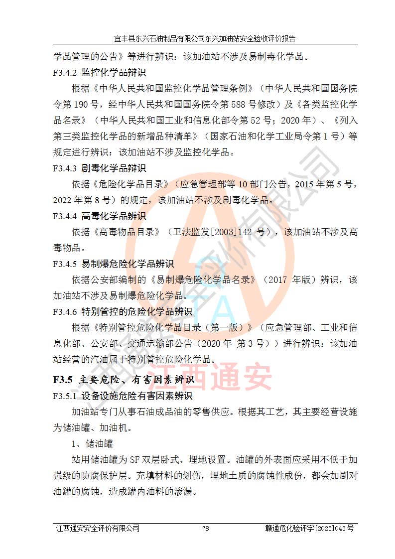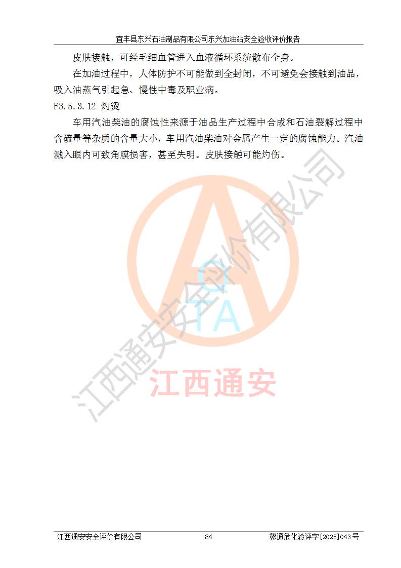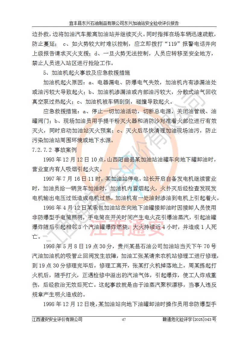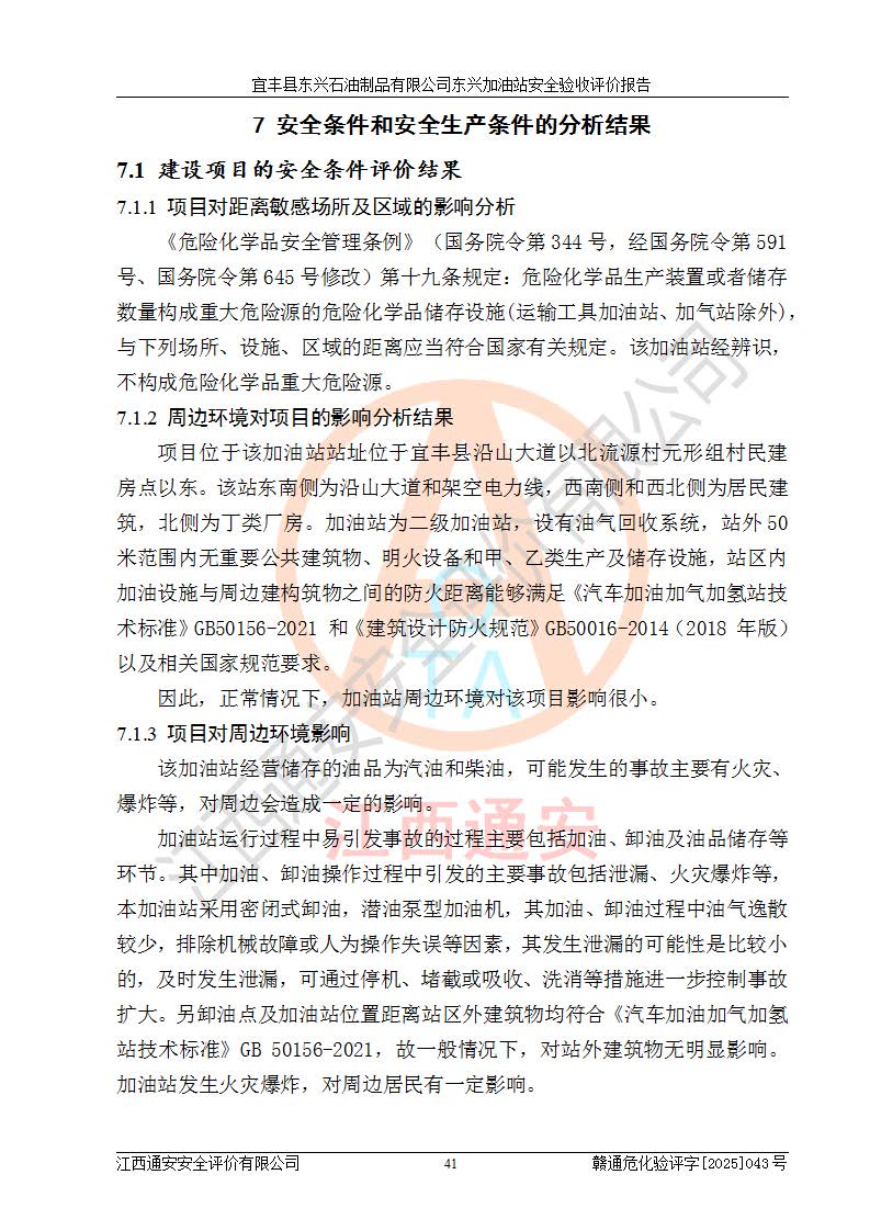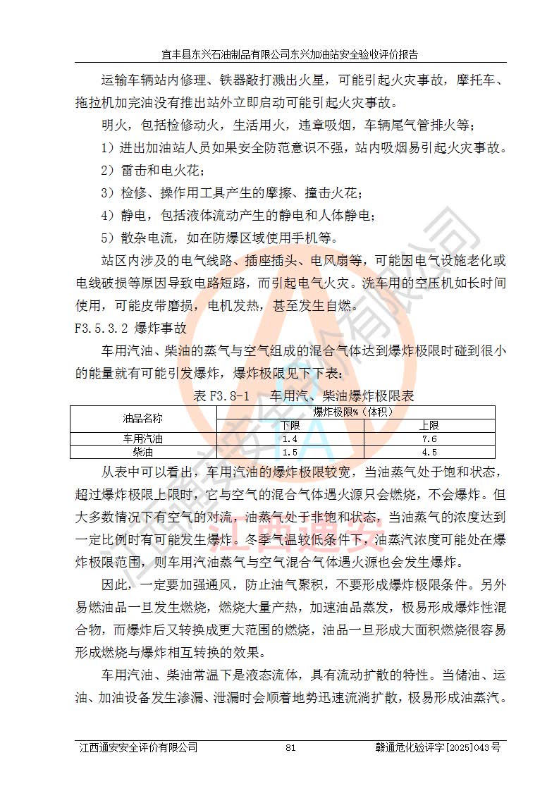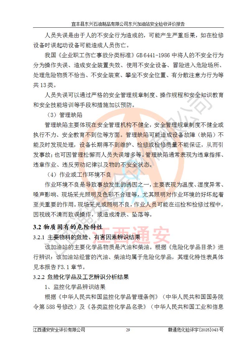 其它 | 一、安全狀況綜合評述 宜豐縣東興石油制品有限公司東興加油站位于宜豐縣沿山大道以北流源村元形組村民建房點(diǎn)以東,從事成品油(汽油、柴油)零售業(yè)務(wù),屬二級加油站。 通過對該加油站建設(shè)項(xiàng)目安全驗(yàn)收評價(jià),得出以下評價(jià)結(jié)論: (1)化學(xué)品、設(shè)備及工藝辨識結(jié)果 經(jīng)辨識,該加油站經(jīng)營、儲存危險(xiǎn)化學(xué)品為汽油和柴油,其中汽油屬于重點(diǎn)監(jiān)管危險(xiǎn)化學(xué)品、特別管控危險(xiǎn)化學(xué)品;該加油站不涉及劇毒化學(xué)品、高毒物品、易制毒化學(xué)品、監(jiān)控化學(xué)品、易制爆化學(xué)品。經(jīng)營、儲存過程中采用的設(shè)備及工藝不屬于淘汰落后設(shè)備及工藝、不涉及危險(xiǎn)化工工藝,生產(chǎn)和儲存單元均不構(gòu)成危險(xiǎn)化學(xué)品重大危險(xiǎn)源。 (2)建設(shè)項(xiàng)目所在地的安全條件和周邊的安全間距 該站東南側(cè)為沿山大道和架空電力線,西南側(cè)和西北側(cè)為居民建筑,北側(cè)為丁類廠房。加油站為二級加油站,設(shè)有油氣回收系統(tǒng),站外50米范圍內(nèi)無重要公共建筑物、明火設(shè)備和甲、乙類生產(chǎn)及儲存設(shè)施,站區(qū)內(nèi)加油設(shè)施與周邊建構(gòu)筑物之間的距離能夠滿足《汽車加油加氣加氫站技術(shù)標(biāo)準(zhǔn)》GB50156-2021 和《建筑設(shè)計(jì)防火規(guī)范》GB50016-2014(2018 年版)以及相關(guān)**規(guī)范要求。本報(bào)告認(rèn)為該加油站建設(shè)項(xiàng)目周邊對加油站的影響以及建設(shè)項(xiàng)目所在地的自然條件對建設(shè)項(xiàng)目投入使用后的影響均較小,該加油站具備標(biāo)準(zhǔn)規(guī)范所要求的安全條件。 (3)該項(xiàng)目安全設(shè)計(jì)診斷報(bào)告的采納情況 該加油站安全設(shè)計(jì)診斷報(bào)告核查的問題(共17項(xiàng))及整改建議均已采納,經(jīng)評價(jià)組現(xiàn)場復(fù)核,均已整改完成。該加油站整改過程工作進(jìn)展順利,處于正常狀態(tài)。經(jīng)查閱資料和分析評價(jià),認(rèn)為本項(xiàng)目技術(shù)、工藝和裝置、設(shè)備(設(shè)施)的安全、可靠性和安全水平符合**相應(yīng)安全標(biāo)準(zhǔn)的要求。 (4)該加油站儲存經(jīng)營的汽油屬于重點(diǎn)監(jiān)管的危險(xiǎn)化學(xué)品和特別控危險(xiǎn)化學(xué)品,該加油站在后續(xù)的經(jīng)營中應(yīng)按照相關(guān)規(guī)范和要求加強(qiáng)安全管理,要求油品運(yùn)輸單位強(qiáng)化運(yùn)輸管理、自身加強(qiáng)儲存定制化管理。 (5)該加油站經(jīng)營過程中存在的危險(xiǎn)有害因素為:①火災(zāi)、爆炸;② 中毒和窒息;③**傷害;④觸電;⑤高處墜落;⑥物體打擊、⑦其他傷害。 其中火災(zāi)、爆炸是主要的危險(xiǎn)、有害因素,加油站埋地儲罐區(qū)、加油區(qū)、卸 油區(qū)是主要的危險(xiǎn)源。 (7)經(jīng)采用作業(yè)條件危險(xiǎn)性評價(jià)法(LEC)進(jìn)行分析,該加油站的作業(yè)條件相對比較安全。在選定的加油作業(yè)、卸油作業(yè)、維修作業(yè)、配電作業(yè)等4個(gè)單元中均為“一般危險(xiǎn)、需要注意”作業(yè)環(huán)境,且一般危險(xiǎn)作業(yè)環(huán)境的出現(xiàn)均由物料的危險(xiǎn)程度所決定,作業(yè)條件相對安全。 (8)采用危險(xiǎn)度評價(jià)法分析,油罐區(qū)主要危險(xiǎn)物質(zhì)為汽油和柴油,常溫、常壓下儲存。儲罐區(qū)汽油罐為Ⅰ級,屬高度危險(xiǎn);柴油罐得分為Ⅲ級,屬低度危險(xiǎn)。油罐采用雙層罐埋地設(shè)置,按要求設(shè)置了通氣管,并裝設(shè)了阻火器;設(shè)置了液位監(jiān)測報(bào)警系統(tǒng)和緊急切斷系統(tǒng),埋地加油管道設(shè)置雙層管道,其安全風(fēng)險(xiǎn)可控。 (9)采用檢查表評價(jià)法對該加油站站址選擇、總平面布置、加油工藝及設(shè)施、消防設(shè)施和給排水、電氣與報(bào)警和緊急切斷系統(tǒng)等進(jìn)行檢查分析,經(jīng)整改后,該加油站涉及的強(qiáng)制條款和其他項(xiàng)均符合要求。該加油站設(shè)置了消防安全設(shè)施、防雷防靜電設(shè)施、液位監(jiān)測措施、油罐泄漏檢測措施、電氣防爆措施等安全防護(hù)設(shè)施,取得了消防驗(yàn)收意見書和防雷檢測合格報(bào)告,符合**法律法規(guī)、標(biāo)準(zhǔn)規(guī)范的要求。該加油站公用工程能夠滿足安全經(jīng)營的基本需要,符合安全經(jīng)營的條件。 (10)該加油站相關(guān)證照齊全,成立了安全生產(chǎn)**小組,配備了安全管理人員,制定了安全管理制度、操作規(guī)程和事故應(yīng)急預(yù)案,加油站的安全管理機(jī)構(gòu)工作有力,加油站安全經(jīng)營管理處于正常有序開展范圍。 (11)對宜豐縣東興石油制品有限公司東興加油站存在重大生產(chǎn)安全事故隱患進(jìn)行判定,檢查結(jié)果為該加油站不存在重大生產(chǎn)安全事故隱患。 總體評價(jià)結(jié)論:宜豐縣東興石油制品有限公司東興加油站認(rèn)真落實(shí)并合理采納安全設(shè)計(jì)診斷報(bào)告中的安全對策、措施及建議,現(xiàn)場與安全設(shè)施設(shè)計(jì)單位重新繪制的現(xiàn)狀總平面布置圖一致,安全設(shè)計(jì)診斷報(bào)告提出的安全對策措施已落實(shí)到位。對潛在的危險(xiǎn)、 有