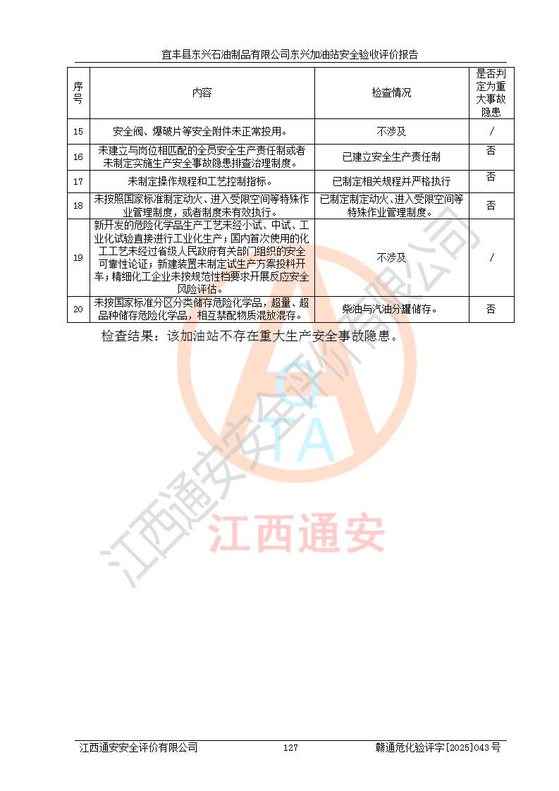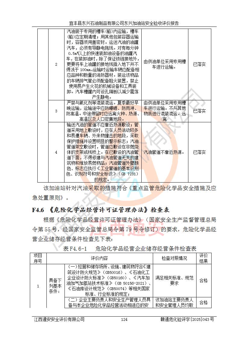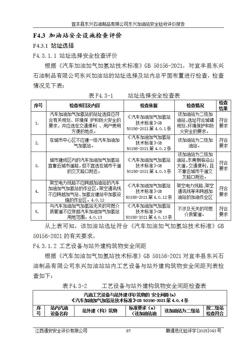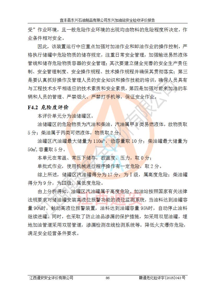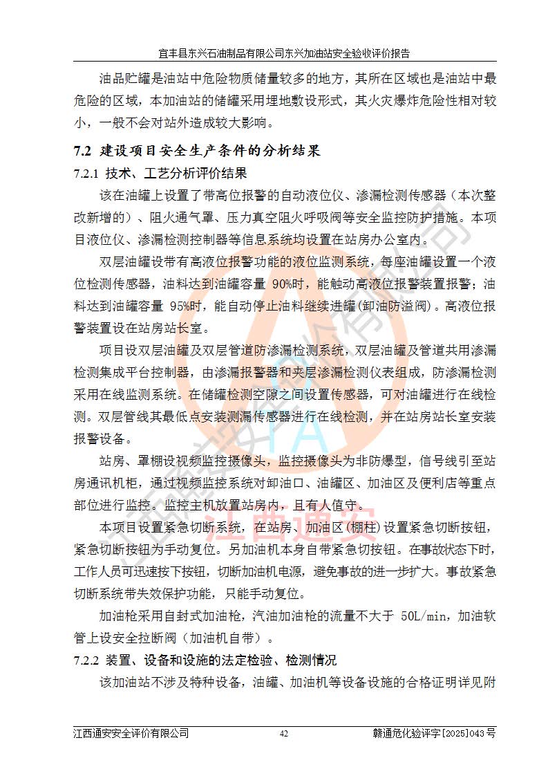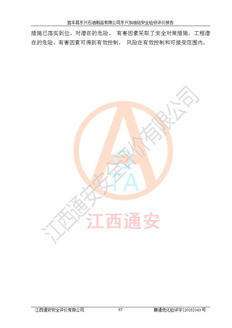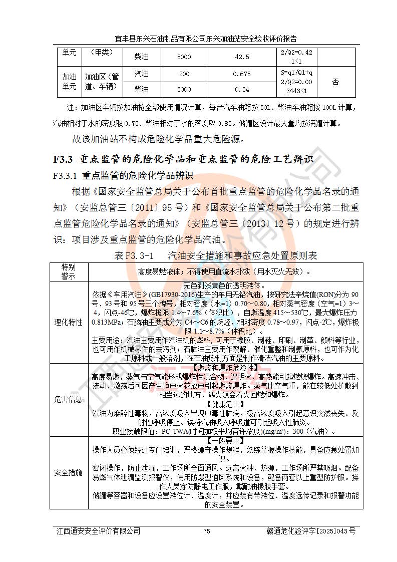 其它 | 一、安全狀況綜合評述 宜豐縣東興石油制品有限公司東興加油站位于宜豐縣沿山大道以北流源村元形組村民建房點(diǎn)以東,從事成品油(汽油、柴油)零售業(yè)務(wù),屬二級加油站。 通過對該加油站建設(shè)項(xiàng)目安全驗(yàn)收評價(jià),得出以下評價(jià)結(jié)論: (1)化學(xué)品、設(shè)備及工藝辨識結(jié)果 經(jīng)辨識,該加油站經(jīng)營、儲存危險(xiǎn)化學(xué)品為汽油和柴油,其中汽油屬于重點(diǎn)監(jiān)管危險(xiǎn)化學(xué)品、特別管控危險(xiǎn)化學(xué)品;該加油站不涉及劇毒化學(xué)品、高毒物品、易制毒化學(xué)品、監(jiān)控化學(xué)品、易制爆化學(xué)品。經(jīng)營、儲存過程中采用的設(shè)備及工藝不屬于淘汰落后設(shè)備及工藝、不涉及危險(xiǎn)化工工藝,生產(chǎn)和儲存單元均不構(gòu)成危險(xiǎn)化學(xué)品重大危險(xiǎn)源。 (2)建設(shè)項(xiàng)目所在地的安全條件和周邊的安全間距 該站東南側(cè)為沿山大道和架空電力線,西南側(cè)和西北側(cè)為居民建筑,北側(cè)為丁類廠房。加油站為二級加油站,設(shè)有油氣回收系統(tǒng),站外50米范圍內(nèi)無重要公共建筑物、明火設(shè)備和甲、乙類生產(chǎn)及儲存設(shè)施,站區(qū)內(nèi)加油設(shè)施與周邊建構(gòu)筑物之間的距離能夠滿足《汽車加油加氣加氫站技術(shù)標(biāo)準(zhǔn)》GB50156-2021 和《建筑設(shè)計(jì)防火規(guī)范》GB50016-2014(2018 年版)以及相關(guān)**規(guī)范要求。本報(bào)告認(rèn)為該加油站建設(shè)項(xiàng)目周邊對加油站的影響以及建設(shè)項(xiàng)目所在地的自然條件對建設(shè)項(xiàng)目投入使用后的影響均較小,該加油站具備標(biāo)準(zhǔn)規(guī)范所要求的安全條件。 (3)該項(xiàng)目安全設(shè)計(jì)診斷報(bào)告的采納情況 該加油站安全設(shè)計(jì)診斷報(bào)告核查的問題(共17項(xiàng))及整改建議均已采納,經(jīng)評價(jià)組現(xiàn)場復(fù)核,均已整改完成。該加油站整改過程工作進(jìn)展順利,處于正常狀態(tài)。經(jīng)查閱資料和分析評價(jià),認(rèn)為本項(xiàng)目技術(shù)、工藝和裝置、設(shè)備(設(shè)施)的安全、可靠性和安全水平符合**相應(yīng)安全標(biāo)準(zhǔn)的要求。 (4)該加油站儲存經(jīng)營的汽油屬于重點(diǎn)監(jiān)管的危險(xiǎn)化學(xué)品和特別控危險(xiǎn)化學(xué)品,該加油站在后續(xù)的經(jīng)營中應(yīng)按照相關(guān)規(guī)范和要求加強(qiáng)安全管理,要求油品運(yùn)輸單位強(qiáng)化運(yùn)輸管理、自身加強(qiáng)儲存定制化管理。 (5)該加油站經(jīng)營過程中存在的危險(xiǎn)有害因素為:①火災(zāi)、爆炸;② 中毒和窒息;③**傷害;④觸電;⑤高處墜落;⑥物體打擊、⑦其他傷害。 其中火災(zāi)、爆炸是主要的危險(xiǎn)、有害因素,加油站埋地儲罐區(qū)、加油區(qū)、卸 油區(qū)是主要的危險(xiǎn)源。 (7)經(jīng)采用作業(yè)條件危險(xiǎn)性評價(jià)法(LEC)進(jìn)行分析,該加油站的作業(yè)條件相對比較安全。在選定的加油作業(yè)、卸油作業(yè)、維修作業(yè)、配電作業(yè)等4個(gè)單元中均為“一般危險(xiǎn)、需要注意”作業(yè)環(huán)境,且一般危險(xiǎn)作業(yè)環(huán)境的出現(xiàn)均由物料的危險(xiǎn)程度所決定,作業(yè)條件相對安全。 (8)采用危險(xiǎn)度評價(jià)法分析,油罐區(qū)主要危險(xiǎn)物質(zhì)為汽油和柴油,常溫、常壓下儲存。儲罐區(qū)汽油罐為Ⅰ級,屬高度危險(xiǎn);柴油罐得分為Ⅲ級,屬低度危險(xiǎn)。油罐采用雙層罐埋地設(shè)置,按要求設(shè)置了通氣管,并裝設(shè)了阻火器;設(shè)置了液位監(jiān)測報(bào)警系統(tǒng)和緊急切斷系統(tǒng),埋地加油管道設(shè)置雙層管道,其安全風(fēng)險(xiǎn)可控。 (9)采用檢查表評價(jià)法對該加油站站址選擇、總平面布置、加油工藝及設(shè)施、消防設(shè)施和給排水、電氣與報(bào)警和緊急切斷系統(tǒng)等進(jìn)行檢查分析,經(jīng)整改后,該加油站涉及的強(qiáng)制條款和其他項(xiàng)均符合要求。該加油站設(shè)置了消防安全設(shè)施、防雷防靜電設(shè)施、液位監(jiān)測措施、油罐泄漏檢測措施、電氣防爆措施等安全防護(hù)設(shè)施,取得了消防驗(yàn)收意見書和防雷檢測合格報(bào)告,符合**法律法規(guī)、標(biāo)準(zhǔn)規(guī)范的要求。該加油站公用工程能夠滿足安全經(jīng)營的基本需要,符合安全經(jīng)營的條件。 (10)該加油站相關(guān)證照齊全,成立了安全生產(chǎn)**小組,配備了安全管理人員,制定了安全管理制度、操作規(guī)程和事故應(yīng)急預(yù)案,加油站的安全管理機(jī)構(gòu)工作有力,加油站安全經(jīng)營管理處于正常有序開展范圍。 (11)對宜豐縣東興石油制品有限公司東興加油站存在重大生產(chǎn)安全事故隱患進(jìn)行判定,檢查結(jié)果為該加油站不存在重大生產(chǎn)安全事故隱患。 總體評價(jià)結(jié)論:宜豐縣東興石油制品有限公司東興加油站認(rèn)真落實(shí)并合理采納安全設(shè)計(jì)診斷報(bào)告中的安全對策、措施及建議,現(xiàn)場與安全設(shè)施設(shè)計(jì)單位重新繪制的現(xiàn)狀總平面布置圖一致,安全設(shè)計(jì)診斷報(bào)告提出的安全對策措施已落實(shí)到位。對潛在的危險(xiǎn)、 有