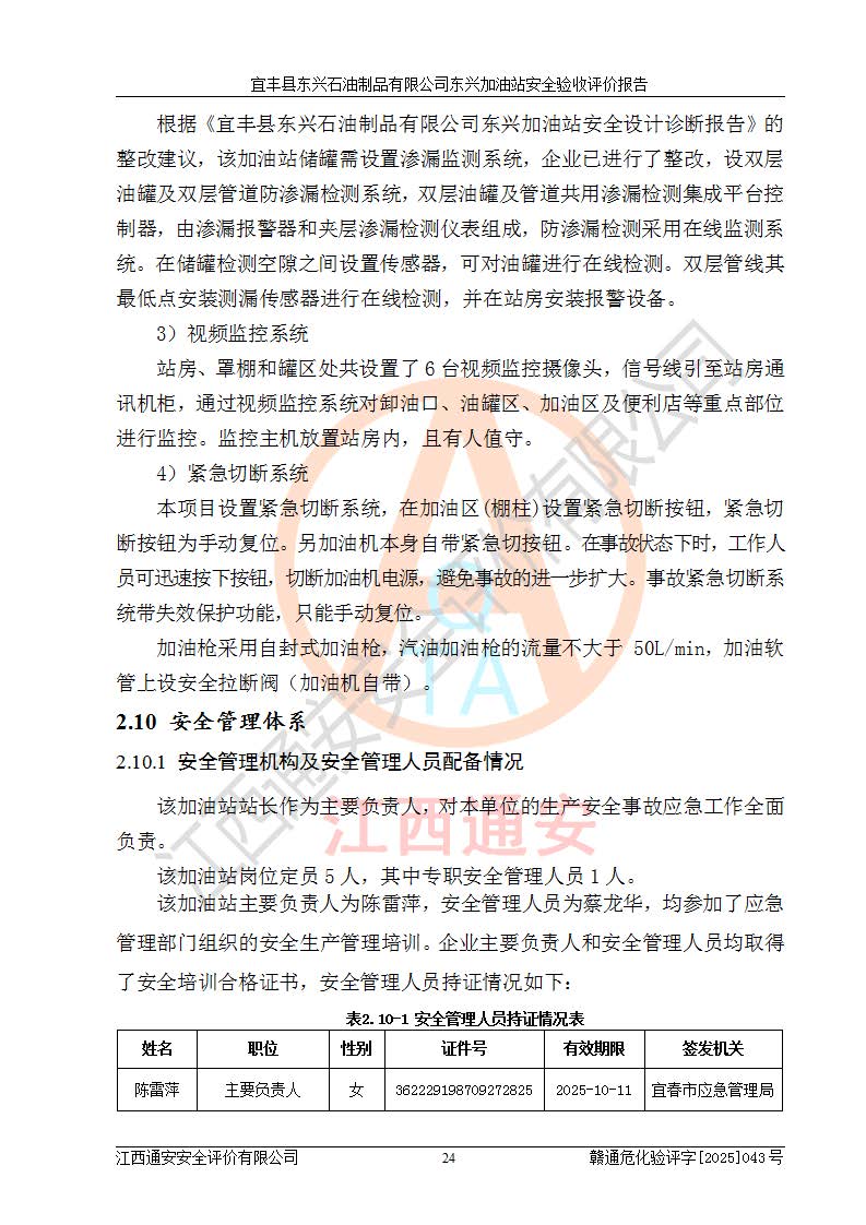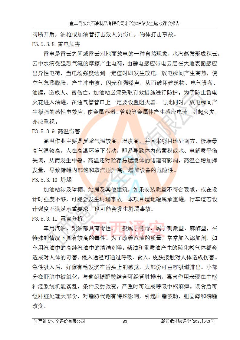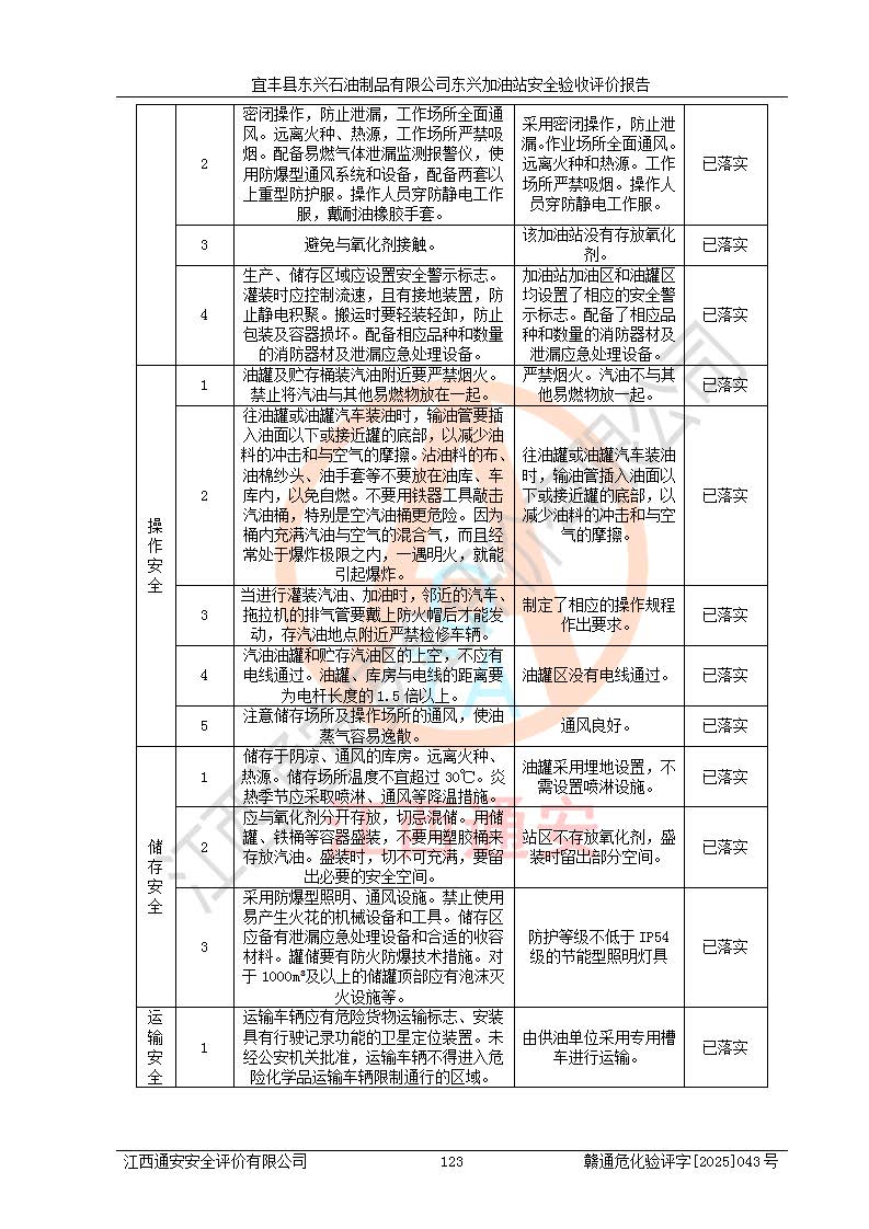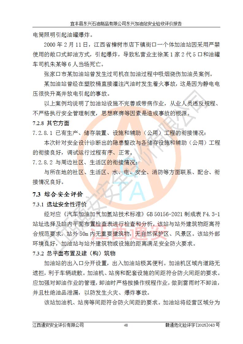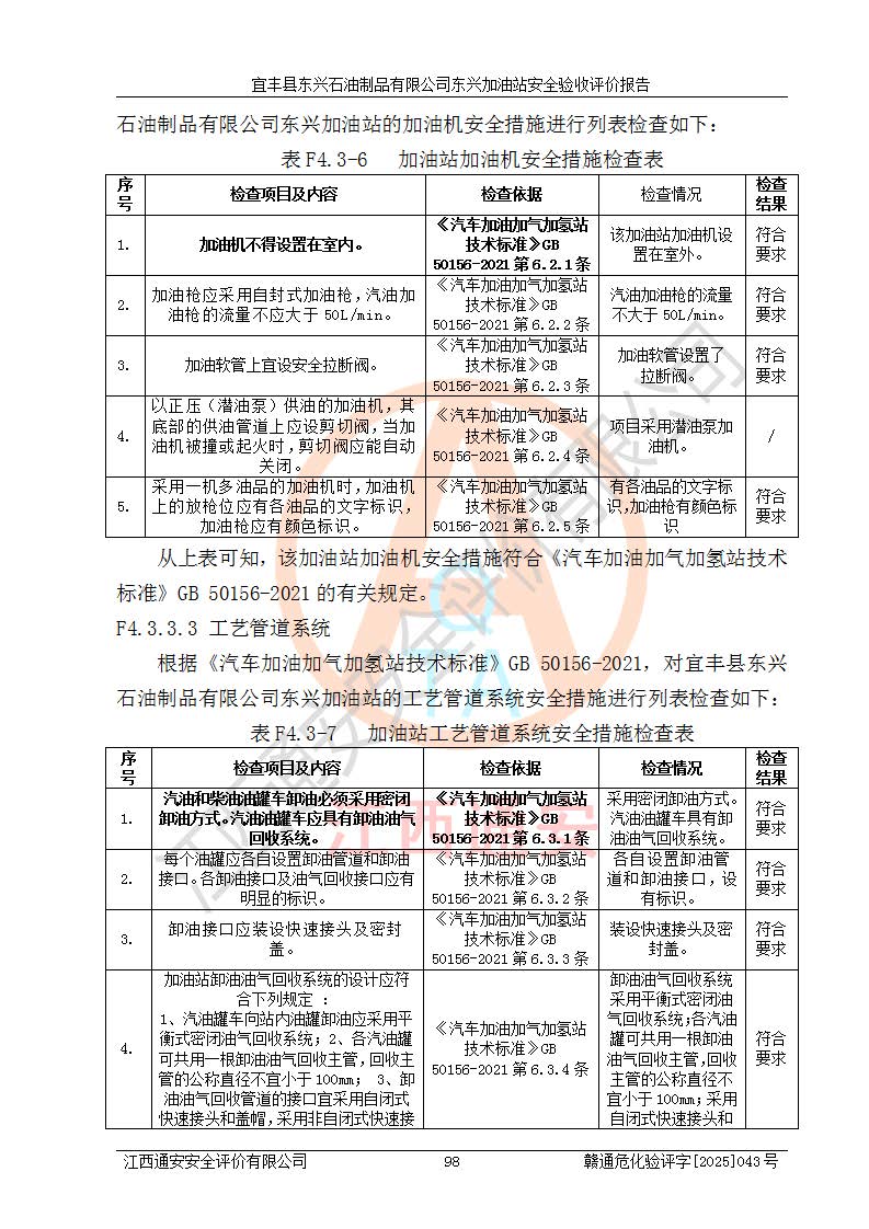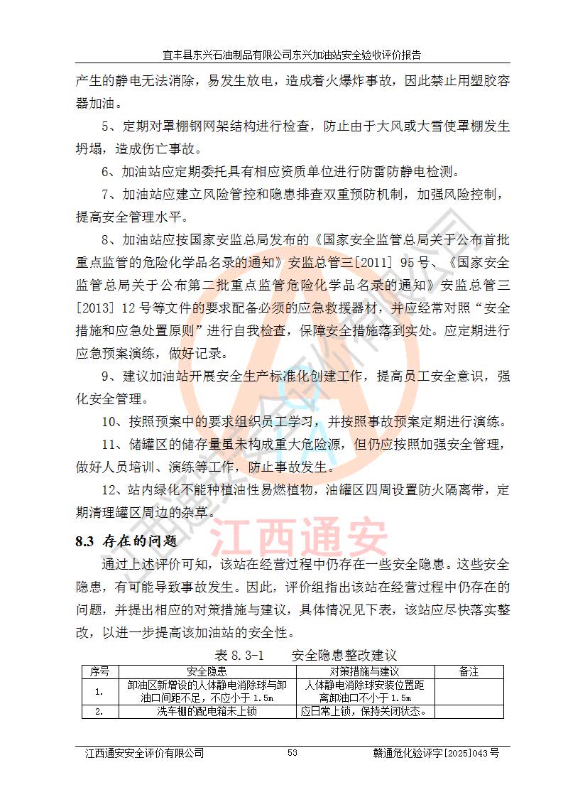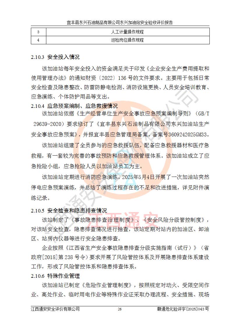 其它 | 一、安全狀況綜合評述 宜豐縣東興石油制品有限公司東興加油站位于宜豐縣沿山大道以北流源村元形組村民建房點(diǎn)以東,從事成品油(汽油、柴油)零售業(yè)務(wù),屬二級加油站。 通過對該加油站建設(shè)項(xiàng)目安全驗(yàn)收評價(jià),得出以下評價(jià)結(jié)論: (1)化學(xué)品、設(shè)備及工藝辨識結(jié)果 經(jīng)辨識,該加油站經(jīng)營、儲存危險(xiǎn)化學(xué)品為汽油和柴油,其中汽油屬于重點(diǎn)監(jiān)管危險(xiǎn)化學(xué)品、特別管控危險(xiǎn)化學(xué)品;該加油站不涉及劇毒化學(xué)品、高毒物品、易制毒化學(xué)品、監(jiān)控化學(xué)品、易制爆化學(xué)品。經(jīng)營、儲存過程中采用的設(shè)備及工藝不屬于淘汰落后設(shè)備及工藝、不涉及危險(xiǎn)化工工藝,生產(chǎn)和儲存單元均不構(gòu)成危險(xiǎn)化學(xué)品重大危險(xiǎn)源。 (2)建設(shè)項(xiàng)目所在地的安全條件和周邊的安全間距 該站東南側(cè)為沿山大道和架空電力線,西南側(cè)和西北側(cè)為居民建筑,北側(cè)為丁類廠房。加油站為二級加油站,設(shè)有油氣回收系統(tǒng),站外50米范圍內(nèi)無重要公共建筑物、明火設(shè)備和甲、乙類生產(chǎn)及儲存設(shè)施,站區(qū)內(nèi)加油設(shè)施與周邊建構(gòu)筑物之間的距離能夠滿足《汽車加油加氣加氫站技術(shù)標(biāo)準(zhǔn)》GB50156-2021 和《建筑設(shè)計(jì)防火規(guī)范》GB50016-2014(2018 年版)以及相關(guān)**規(guī)范要求。本報(bào)告認(rèn)為該加油站建設(shè)項(xiàng)目周邊對加油站的影響以及建設(shè)項(xiàng)目所在地的自然條件對建設(shè)項(xiàng)目投入使用后的影響均較小,該加油站具備標(biāo)準(zhǔn)規(guī)范所要求的安全條件。 (3)該項(xiàng)目安全設(shè)計(jì)診斷報(bào)告的采納情況 該加油站安全設(shè)計(jì)診斷報(bào)告核查的問題(共17項(xiàng))及整改建議均已采納,經(jīng)評價(jià)組現(xiàn)場復(fù)核,均已整改完成。該加油站整改過程工作進(jìn)展順利,處于正常狀態(tài)。經(jīng)查閱資料和分析評價(jià),認(rèn)為本項(xiàng)目技術(shù)、工藝和裝置、設(shè)備(設(shè)施)的安全、可靠性和安全水平符合**相應(yīng)安全標(biāo)準(zhǔn)的要求。 (4)該加油站儲存經(jīng)營的汽油屬于重點(diǎn)監(jiān)管的危險(xiǎn)化學(xué)品和特別控危險(xiǎn)化學(xué)品,該加油站在后續(xù)的經(jīng)營中應(yīng)按照相關(guān)規(guī)范和要求加強(qiáng)安全管理,要求油品運(yùn)輸單位強(qiáng)化運(yùn)輸管理、自身加強(qiáng)儲存定制化管理。 (5)該加油站經(jīng)營過程中存在的危險(xiǎn)有害因素為:①火災(zāi)、爆炸;② 中毒和窒息;③**傷害;④觸電;⑤高處墜落;⑥物體打擊、⑦其他傷害。 其中火災(zāi)、爆炸是主要的危險(xiǎn)、有害因素,加油站埋地儲罐區(qū)、加油區(qū)、卸 油區(qū)是主要的危險(xiǎn)源。 (7)經(jīng)采用作業(yè)條件危險(xiǎn)性評價(jià)法(LEC)進(jìn)行分析,該加油站的作業(yè)條件相對比較安全。在選定的加油作業(yè)、卸油作業(yè)、維修作業(yè)、配電作業(yè)等4個(gè)單元中均為“一般危險(xiǎn)、需要注意”作業(yè)環(huán)境,且一般危險(xiǎn)作業(yè)環(huán)境的出現(xiàn)均由物料的危險(xiǎn)程度所決定,作業(yè)條件相對安全。 (8)采用危險(xiǎn)度評價(jià)法分析,油罐區(qū)主要危險(xiǎn)物質(zhì)為汽油和柴油,常溫、常壓下儲存。儲罐區(qū)汽油罐為Ⅰ級,屬高度危險(xiǎn);柴油罐得分為Ⅲ級,屬低度危險(xiǎn)。油罐采用雙層罐埋地設(shè)置,按要求設(shè)置了通氣管,并裝設(shè)了阻火器;設(shè)置了液位監(jiān)測報(bào)警系統(tǒng)和緊急切斷系統(tǒng),埋地加油管道設(shè)置雙層管道,其安全風(fēng)險(xiǎn)可控。 (9)采用檢查表評價(jià)法對該加油站站址選擇、總平面布置、加油工藝及設(shè)施、消防設(shè)施和給排水、電氣與報(bào)警和緊急切斷系統(tǒng)等進(jìn)行檢查分析,經(jīng)整改后,該加油站涉及的強(qiáng)制條款和其他項(xiàng)均符合要求。該加油站設(shè)置了消防安全設(shè)施、防雷防靜電設(shè)施、液位監(jiān)測措施、油罐泄漏檢測措施、電氣防爆措施等安全防護(hù)設(shè)施,取得了消防驗(yàn)收意見書和防雷檢測合格報(bào)告,符合**法律法規(guī)、標(biāo)準(zhǔn)規(guī)范的要求。該加油站公用工程能夠滿足安全經(jīng)營的基本需要,符合安全經(jīng)營的條件。 (10)該加油站相關(guān)證照齊全,成立了安全生產(chǎn)**小組,配備了安全管理人員,制定了安全管理制度、操作規(guī)程和事故應(yīng)急預(yù)案,加油站的安全管理機(jī)構(gòu)工作有力,加油站安全經(jīng)營管理處于正常有序開展范圍。 (11)對宜豐縣東興石油制品有限公司東興加油站存在重大生產(chǎn)安全事故隱患進(jìn)行判定,檢查結(jié)果為該加油站不存在重大生產(chǎn)安全事故隱患。 總體評價(jià)結(jié)論:宜豐縣東興石油制品有限公司東興加油站認(rèn)真落實(shí)并合理采納安全設(shè)計(jì)診斷報(bào)告中的安全對策、措施及建議,現(xiàn)場與安全設(shè)施設(shè)計(jì)單位重新繪制的現(xiàn)狀總平面布置圖一致,安全設(shè)計(jì)診斷報(bào)告提出的安全對策措施已落實(shí)到位。對潛在的危險(xiǎn)、 有