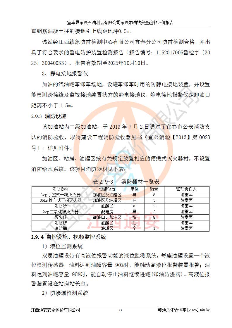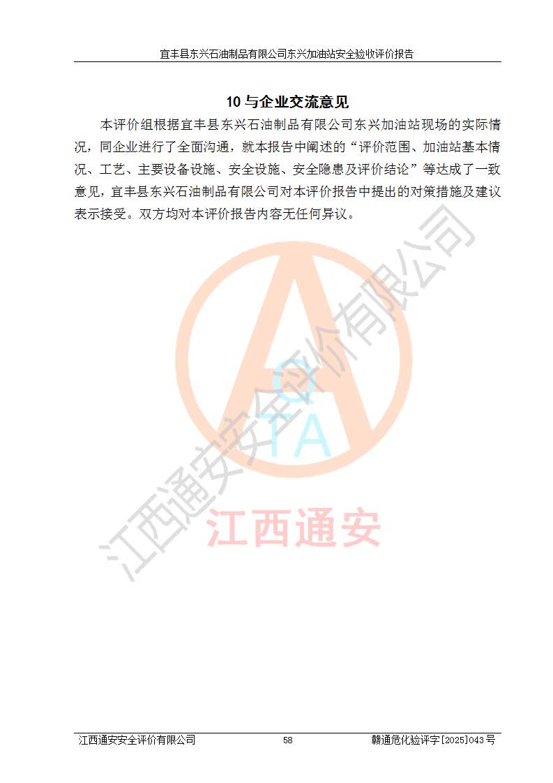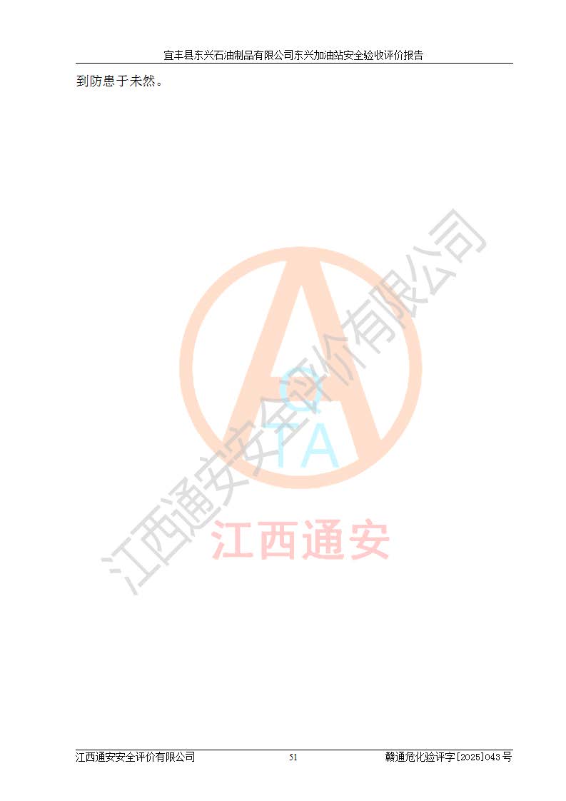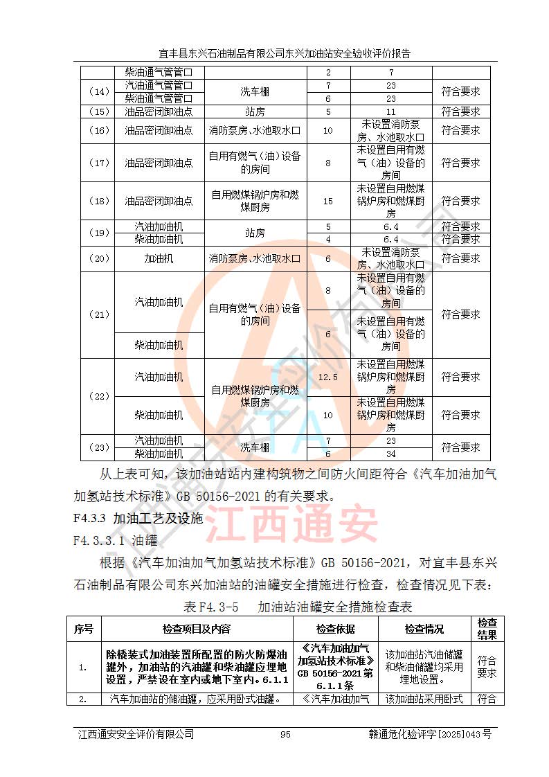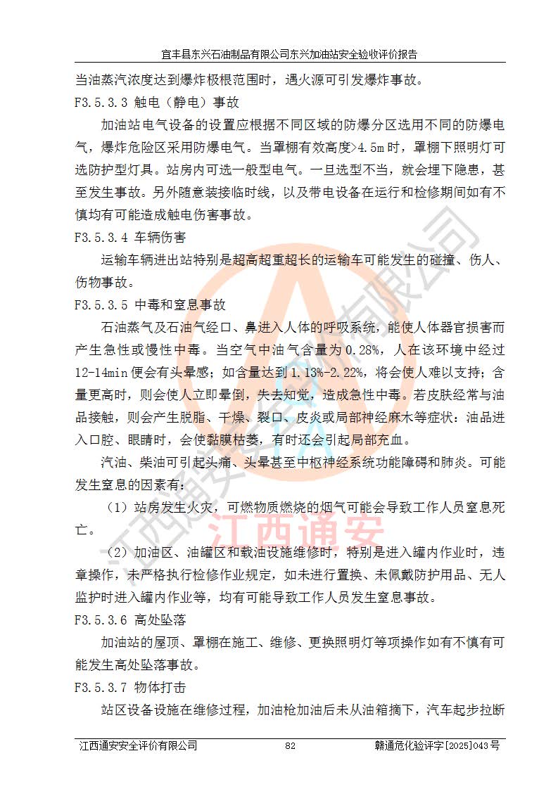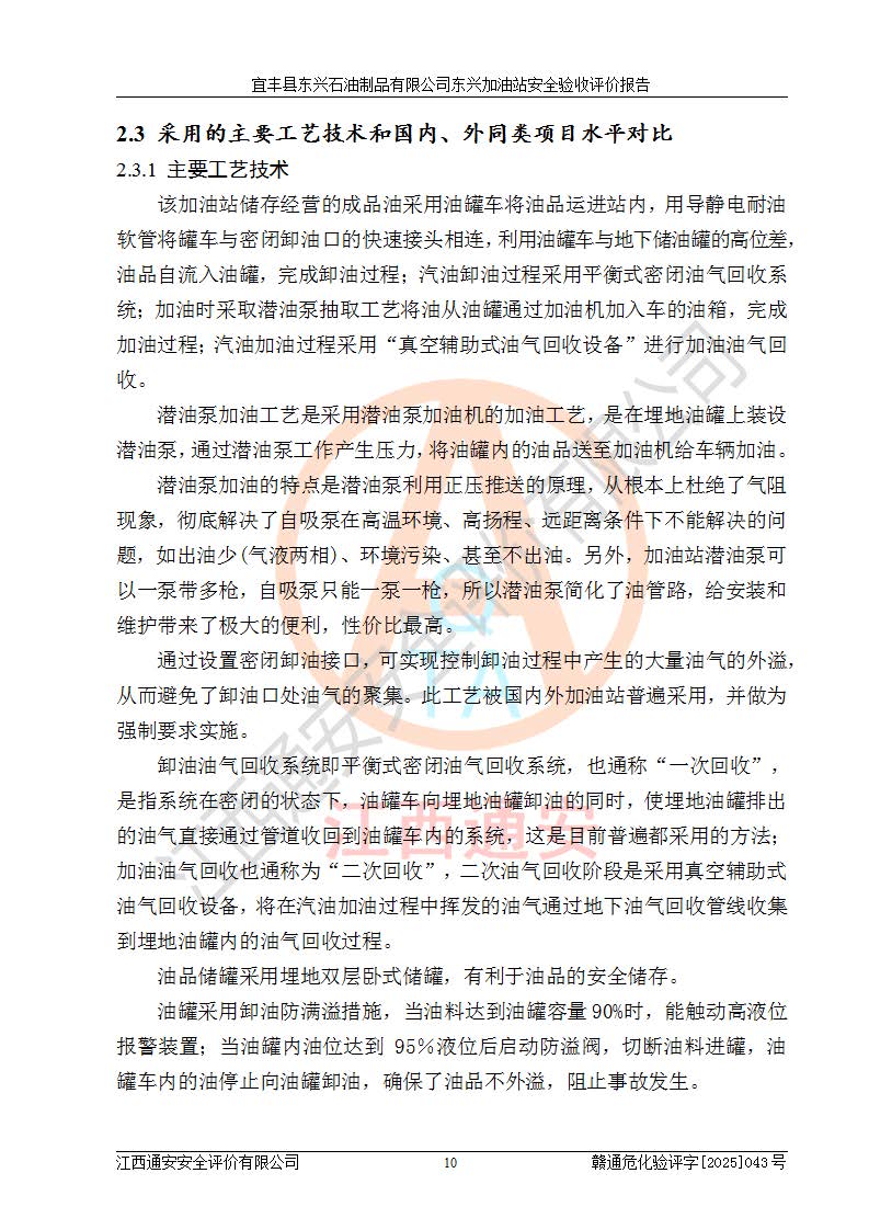 其它 | 一、安全狀況綜合評述 宜豐縣東興石油制品有限公司東興加油站位于宜豐縣沿山大道以北流源村元形組村民建房點(diǎn)以東,從事成品油(汽油、柴油)零售業(yè)務(wù),屬二級加油站。 通過對該加油站建設(shè)項(xiàng)目安全驗(yàn)收評價(jià),得出以下評價(jià)結(jié)論: (1)化學(xué)品、設(shè)備及工藝辨識結(jié)果 經(jīng)辨識,該加油站經(jīng)營、儲存危險(xiǎn)化學(xué)品為汽油和柴油,其中汽油屬于重點(diǎn)監(jiān)管危險(xiǎn)化學(xué)品、特別管控危險(xiǎn)化學(xué)品;該加油站不涉及劇毒化學(xué)品、高毒物品、易制毒化學(xué)品、監(jiān)控化學(xué)品、易制爆化學(xué)品。經(jīng)營、儲存過程中采用的設(shè)備及工藝不屬于淘汰落后設(shè)備及工藝、不涉及危險(xiǎn)化工工藝,生產(chǎn)和儲存單元均不構(gòu)成危險(xiǎn)化學(xué)品重大危險(xiǎn)源。 (2)建設(shè)項(xiàng)目所在地的安全條件和周邊的安全間距 該站東南側(cè)為沿山大道和架空電力線,西南側(cè)和西北側(cè)為居民建筑,北側(cè)為丁類廠房。加油站為二級加油站,設(shè)有油氣回收系統(tǒng),站外50米范圍內(nèi)無重要公共建筑物、明火設(shè)備和甲、乙類生產(chǎn)及儲存設(shè)施,站區(qū)內(nèi)加油設(shè)施與周邊建構(gòu)筑物之間的距離能夠滿足《汽車加油加氣加氫站技術(shù)標(biāo)準(zhǔn)》GB50156-2021 和《建筑設(shè)計(jì)防火規(guī)范》GB50016-2014(2018 年版)以及相關(guān)**規(guī)范要求。本報(bào)告認(rèn)為該加油站建設(shè)項(xiàng)目周邊對加油站的影響以及建設(shè)項(xiàng)目所在地的自然條件對建設(shè)項(xiàng)目投入使用后的影響均較小,該加油站具備標(biāo)準(zhǔn)規(guī)范所要求的安全條件。 (3)該項(xiàng)目安全設(shè)計(jì)診斷報(bào)告的采納情況 該加油站安全設(shè)計(jì)診斷報(bào)告核查的問題(共17項(xiàng))及整改建議均已采納,經(jīng)評價(jià)組現(xiàn)場復(fù)核,均已整改完成。該加油站整改過程工作進(jìn)展順利,處于正常狀態(tài)。經(jīng)查閱資料和分析評價(jià),認(rèn)為本項(xiàng)目技術(shù)、工藝和裝置、設(shè)備(設(shè)施)的安全、可靠性和安全水平符合**相應(yīng)安全標(biāo)準(zhǔn)的要求。 (4)該加油站儲存經(jīng)營的汽油屬于重點(diǎn)監(jiān)管的危險(xiǎn)化學(xué)品和特別控危險(xiǎn)化學(xué)品,該加油站在后續(xù)的經(jīng)營中應(yīng)按照相關(guān)規(guī)范和要求加強(qiáng)安全管理,要求油品運(yùn)輸單位強(qiáng)化運(yùn)輸管理、自身加強(qiáng)儲存定制化管理。 (5)該加油站經(jīng)營過程中存在的危險(xiǎn)有害因素為:①火災(zāi)、爆炸;② 中毒和窒息;③**傷害;④觸電;⑤高處墜落;⑥物體打擊、⑦其他傷害。 其中火災(zāi)、爆炸是主要的危險(xiǎn)、有害因素,加油站埋地儲罐區(qū)、加油區(qū)、卸 油區(qū)是主要的危險(xiǎn)源。 (7)經(jīng)采用作業(yè)條件危險(xiǎn)性評價(jià)法(LEC)進(jìn)行分析,該加油站的作業(yè)條件相對比較安全。在選定的加油作業(yè)、卸油作業(yè)、維修作業(yè)、配電作業(yè)等4個(gè)單元中均為“一般危險(xiǎn)、需要注意”作業(yè)環(huán)境,且一般危險(xiǎn)作業(yè)環(huán)境的出現(xiàn)均由物料的危險(xiǎn)程度所決定,作業(yè)條件相對安全。 (8)采用危險(xiǎn)度評價(jià)法分析,油罐區(qū)主要危險(xiǎn)物質(zhì)為汽油和柴油,常溫、常壓下儲存。儲罐區(qū)汽油罐為Ⅰ級,屬高度危險(xiǎn);柴油罐得分為Ⅲ級,屬低度危險(xiǎn)。油罐采用雙層罐埋地設(shè)置,按要求設(shè)置了通氣管,并裝設(shè)了阻火器;設(shè)置了液位監(jiān)測報(bào)警系統(tǒng)和緊急切斷系統(tǒng),埋地加油管道設(shè)置雙層管道,其安全風(fēng)險(xiǎn)可控。 (9)采用檢查表評價(jià)法對該加油站站址選擇、總平面布置、加油工藝及設(shè)施、消防設(shè)施和給排水、電氣與報(bào)警和緊急切斷系統(tǒng)等進(jìn)行檢查分析,經(jīng)整改后,該加油站涉及的強(qiáng)制條款和其他項(xiàng)均符合要求。該加油站設(shè)置了消防安全設(shè)施、防雷防靜電設(shè)施、液位監(jiān)測措施、油罐泄漏檢測措施、電氣防爆措施等安全防護(hù)設(shè)施,取得了消防驗(yàn)收意見書和防雷檢測合格報(bào)告,符合**法律法規(guī)、標(biāo)準(zhǔn)規(guī)范的要求。該加油站公用工程能夠滿足安全經(jīng)營的基本需要,符合安全經(jīng)營的條件。 (10)該加油站相關(guān)證照齊全,成立了安全生產(chǎn)**小組,配備了安全管理人員,制定了安全管理制度、操作規(guī)程和事故應(yīng)急預(yù)案,加油站的安全管理機(jī)構(gòu)工作有力,加油站安全經(jīng)營管理處于正常有序開展范圍。 (11)對宜豐縣東興石油制品有限公司東興加油站存在重大生產(chǎn)安全事故隱患進(jìn)行判定,檢查結(jié)果為該加油站不存在重大生產(chǎn)安全事故隱患。 總體評價(jià)結(jié)論:宜豐縣東興石油制品有限公司東興加油站認(rèn)真落實(shí)并合理采納安全設(shè)計(jì)診斷報(bào)告中的安全對策、措施及建議,現(xiàn)場與安全設(shè)施設(shè)計(jì)單位重新繪制的現(xiàn)狀總平面布置圖一致,安全設(shè)計(jì)診斷報(bào)告提出的安全對策措施已落實(shí)到位。對潛在的危險(xiǎn)、 有