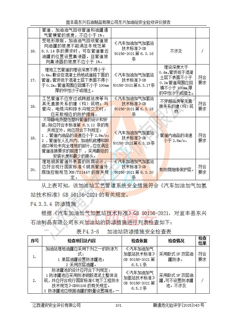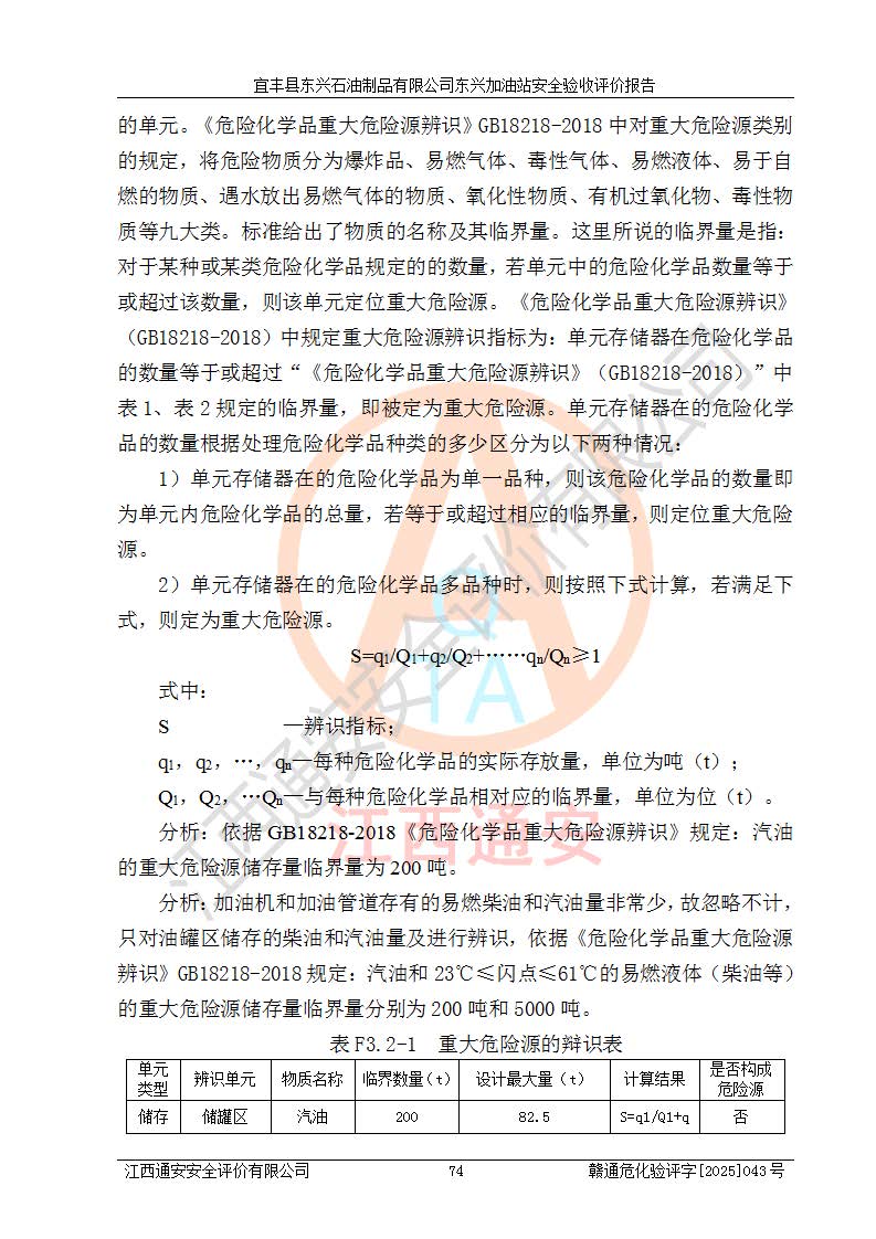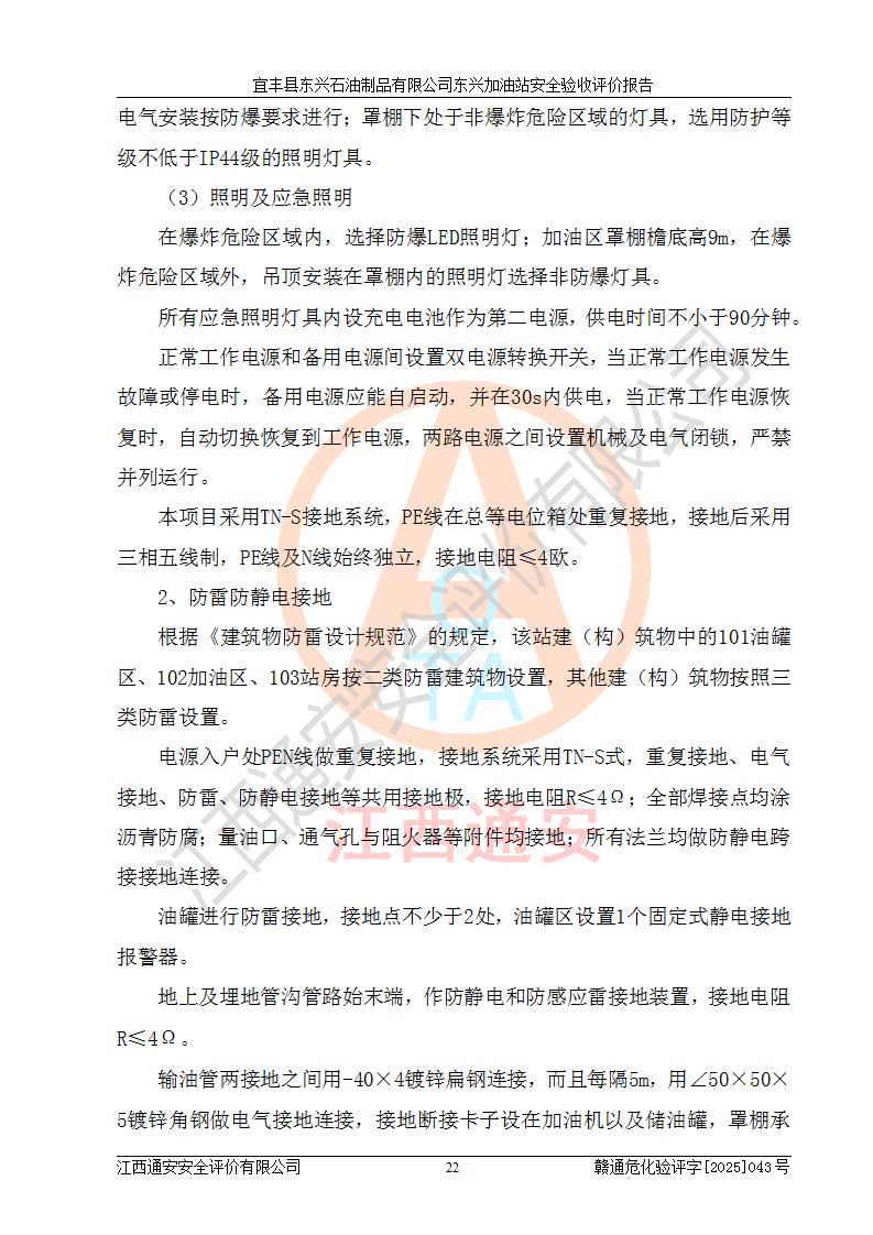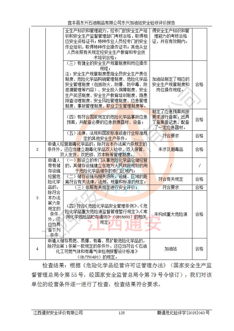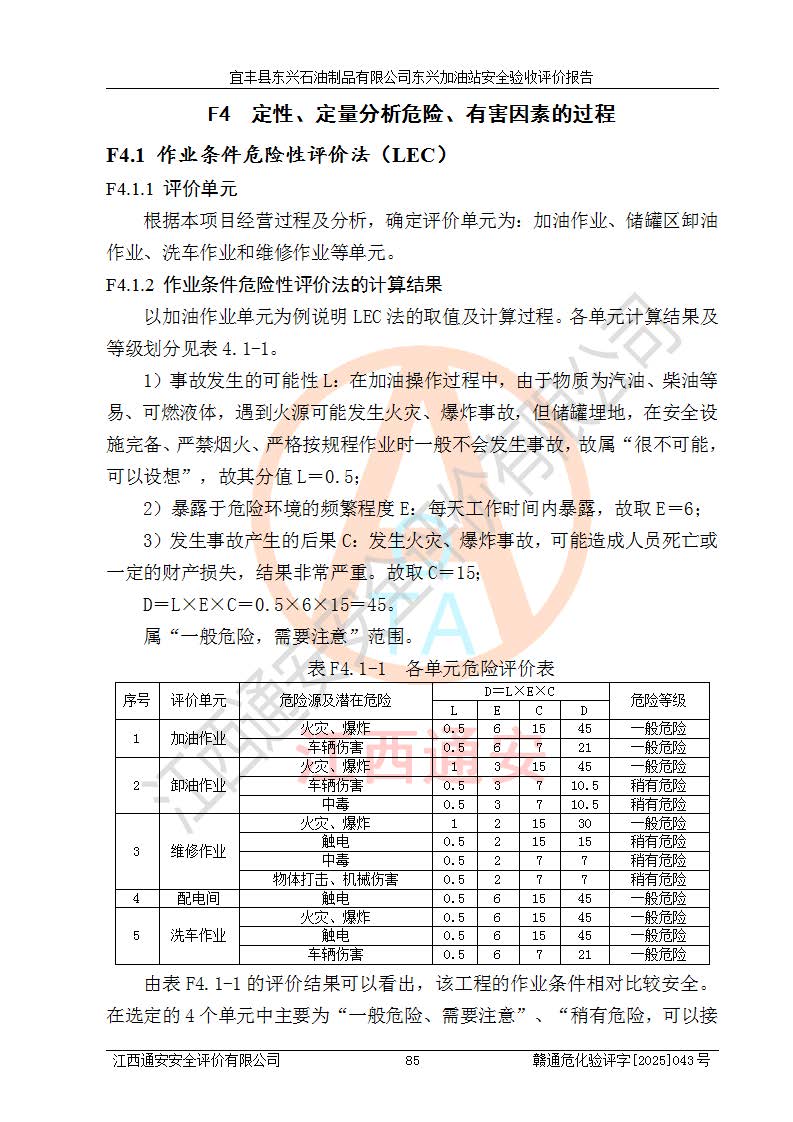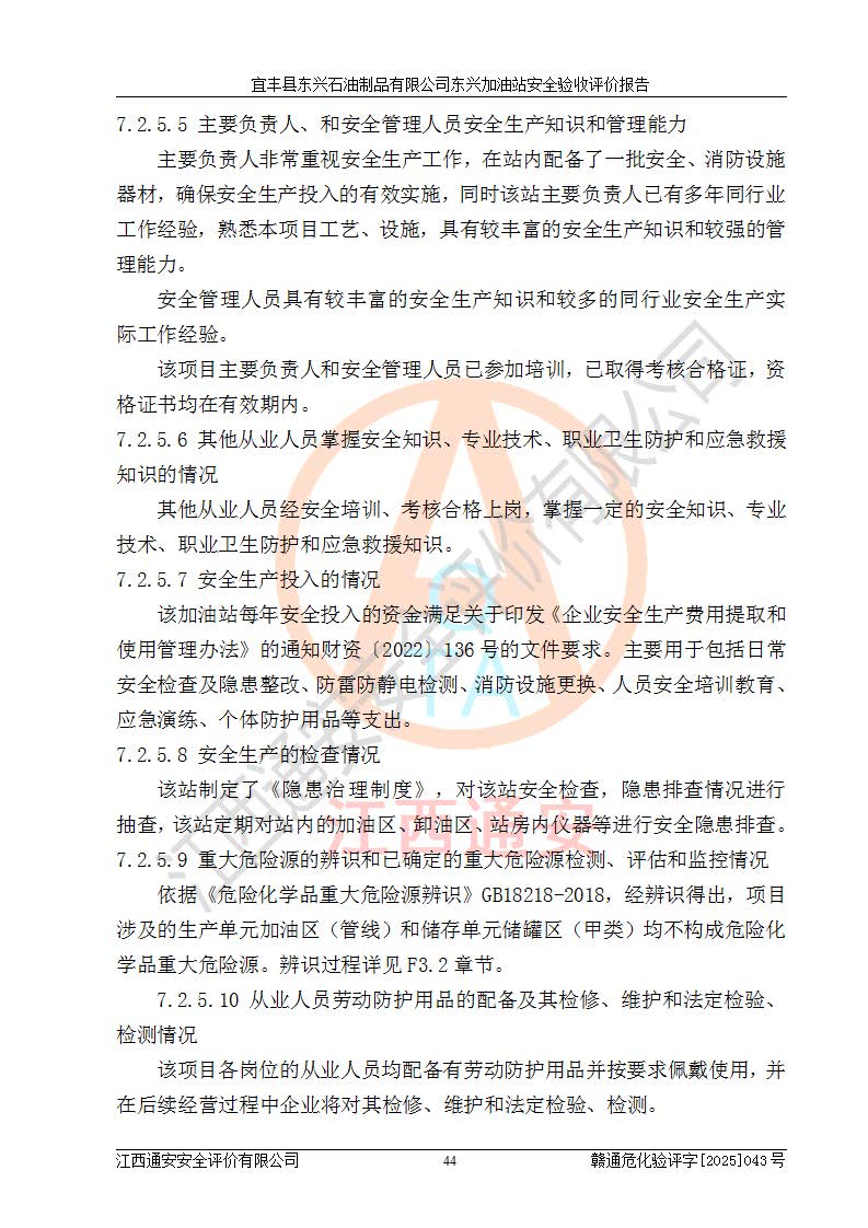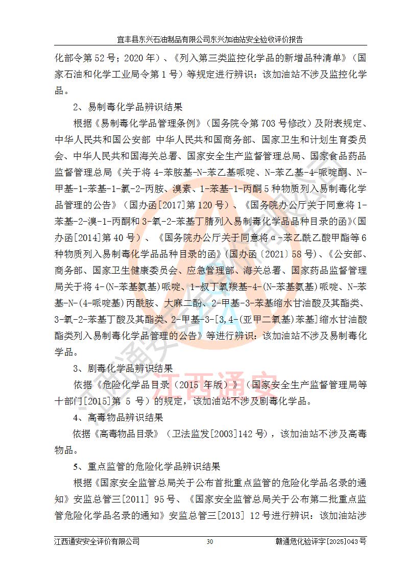 其它 | 一、安全狀況綜合評述 宜豐縣東興石油制品有限公司東興加油站位于宜豐縣沿山大道以北流源村元形組村民建房點(diǎn)以東,從事成品油(汽油、柴油)零售業(yè)務(wù),屬二級加油站。 通過對該加油站建設(shè)項(xiàng)目安全驗(yàn)收評價(jià),得出以下評價(jià)結(jié)論: (1)化學(xué)品、設(shè)備及工藝辨識結(jié)果 經(jīng)辨識,該加油站經(jīng)營、儲存危險(xiǎn)化學(xué)品為汽油和柴油,其中汽油屬于重點(diǎn)監(jiān)管危險(xiǎn)化學(xué)品、特別管控危險(xiǎn)化學(xué)品;該加油站不涉及劇毒化學(xué)品、高毒物品、易制毒化學(xué)品、監(jiān)控化學(xué)品、易制爆化學(xué)品。經(jīng)營、儲存過程中采用的設(shè)備及工藝不屬于淘汰落后設(shè)備及工藝、不涉及危險(xiǎn)化工工藝,生產(chǎn)和儲存單元均不構(gòu)成危險(xiǎn)化學(xué)品重大危險(xiǎn)源。 (2)建設(shè)項(xiàng)目所在地的安全條件和周邊的安全間距 該站東南側(cè)為沿山大道和架空電力線,西南側(cè)和西北側(cè)為居民建筑,北側(cè)為丁類廠房。加油站為二級加油站,設(shè)有油氣回收系統(tǒng),站外50米范圍內(nèi)無重要公共建筑物、明火設(shè)備和甲、乙類生產(chǎn)及儲存設(shè)施,站區(qū)內(nèi)加油設(shè)施與周邊建構(gòu)筑物之間的距離能夠滿足《汽車加油加氣加氫站技術(shù)標(biāo)準(zhǔn)》GB50156-2021 和《建筑設(shè)計(jì)防火規(guī)范》GB50016-2014(2018 年版)以及相關(guān)**規(guī)范要求。本報(bào)告認(rèn)為該加油站建設(shè)項(xiàng)目周邊對加油站的影響以及建設(shè)項(xiàng)目所在地的自然條件對建設(shè)項(xiàng)目投入使用后的影響均較小,該加油站具備標(biāo)準(zhǔn)規(guī)范所要求的安全條件。 (3)該項(xiàng)目安全設(shè)計(jì)診斷報(bào)告的采納情況 該加油站安全設(shè)計(jì)診斷報(bào)告核查的問題(共17項(xiàng))及整改建議均已采納,經(jīng)評價(jià)組現(xiàn)場復(fù)核,均已整改完成。該加油站整改過程工作進(jìn)展順利,處于正常狀態(tài)。經(jīng)查閱資料和分析評價(jià),認(rèn)為本項(xiàng)目技術(shù)、工藝和裝置、設(shè)備(設(shè)施)的安全、可靠性和安全水平符合**相應(yīng)安全標(biāo)準(zhǔn)的要求。 (4)該加油站儲存經(jīng)營的汽油屬于重點(diǎn)監(jiān)管的危險(xiǎn)化學(xué)品和特別控危險(xiǎn)化學(xué)品,該加油站在后續(xù)的經(jīng)營中應(yīng)按照相關(guān)規(guī)范和要求加強(qiáng)安全管理,要求油品運(yùn)輸單位強(qiáng)化運(yùn)輸管理、自身加強(qiáng)儲存定制化管理。 (5)該加油站經(jīng)營過程中存在的危險(xiǎn)有害因素為:①火災(zāi)、爆炸;② 中毒和窒息;③**傷害;④觸電;⑤高處墜落;⑥物體打擊、⑦其他傷害。 其中火災(zāi)、爆炸是主要的危險(xiǎn)、有害因素,加油站埋地儲罐區(qū)、加油區(qū)、卸 油區(qū)是主要的危險(xiǎn)源。 (7)經(jīng)采用作業(yè)條件危險(xiǎn)性評價(jià)法(LEC)進(jìn)行分析,該加油站的作業(yè)條件相對比較安全。在選定的加油作業(yè)、卸油作業(yè)、維修作業(yè)、配電作業(yè)等4個(gè)單元中均為“一般危險(xiǎn)、需要注意”作業(yè)環(huán)境,且一般危險(xiǎn)作業(yè)環(huán)境的出現(xiàn)均由物料的危險(xiǎn)程度所決定,作業(yè)條件相對安全。 (8)采用危險(xiǎn)度評價(jià)法分析,油罐區(qū)主要危險(xiǎn)物質(zhì)為汽油和柴油,常溫、常壓下儲存。儲罐區(qū)汽油罐為Ⅰ級,屬高度危險(xiǎn);柴油罐得分為Ⅲ級,屬低度危險(xiǎn)。油罐采用雙層罐埋地設(shè)置,按要求設(shè)置了通氣管,并裝設(shè)了阻火器;設(shè)置了液位監(jiān)測報(bào)警系統(tǒng)和緊急切斷系統(tǒng),埋地加油管道設(shè)置雙層管道,其安全風(fēng)險(xiǎn)可控。 (9)采用檢查表評價(jià)法對該加油站站址選擇、總平面布置、加油工藝及設(shè)施、消防設(shè)施和給排水、電氣與報(bào)警和緊急切斷系統(tǒng)等進(jìn)行檢查分析,經(jīng)整改后,該加油站涉及的強(qiáng)制條款和其他項(xiàng)均符合要求。該加油站設(shè)置了消防安全設(shè)施、防雷防靜電設(shè)施、液位監(jiān)測措施、油罐泄漏檢測措施、電氣防爆措施等安全防護(hù)設(shè)施,取得了消防驗(yàn)收意見書和防雷檢測合格報(bào)告,符合**法律法規(guī)、標(biāo)準(zhǔn)規(guī)范的要求。該加油站公用工程能夠滿足安全經(jīng)營的基本需要,符合安全經(jīng)營的條件。 (10)該加油站相關(guān)證照齊全,成立了安全生產(chǎn)**小組,配備了安全管理人員,制定了安全管理制度、操作規(guī)程和事故應(yīng)急預(yù)案,加油站的安全管理機(jī)構(gòu)工作有力,加油站安全經(jīng)營管理處于正常有序開展范圍。 (11)對宜豐縣東興石油制品有限公司東興加油站存在重大生產(chǎn)安全事故隱患進(jìn)行判定,檢查結(jié)果為該加油站不存在重大生產(chǎn)安全事故隱患。 總體評價(jià)結(jié)論:宜豐縣東興石油制品有限公司東興加油站認(rèn)真落實(shí)并合理采納安全設(shè)計(jì)診斷報(bào)告中的安全對策、措施及建議,現(xiàn)場與安全設(shè)施設(shè)計(jì)單位重新繪制的現(xiàn)狀總平面布置圖一致,安全設(shè)計(jì)診斷報(bào)告提出的安全對策措施已落實(shí)到位。對潛在的危險(xiǎn)、 有