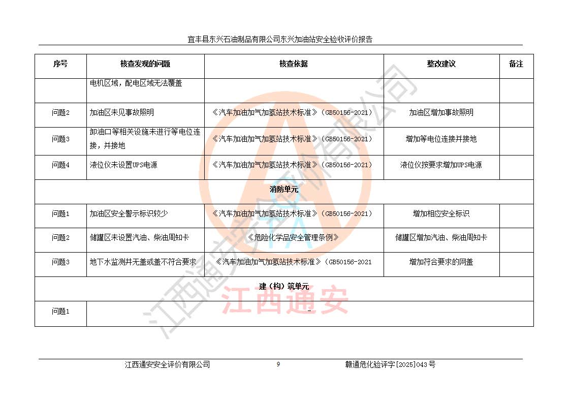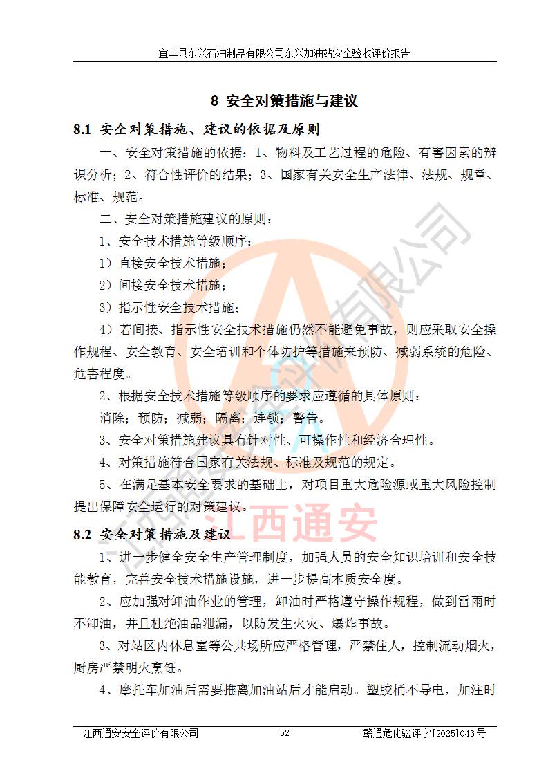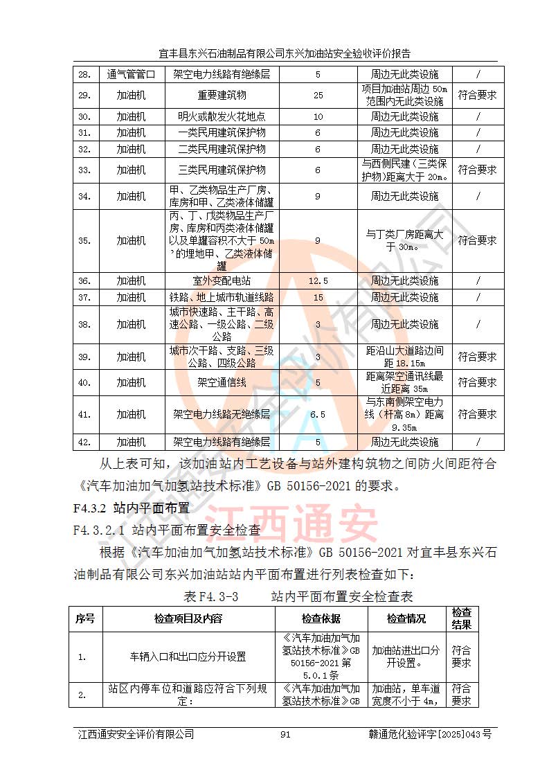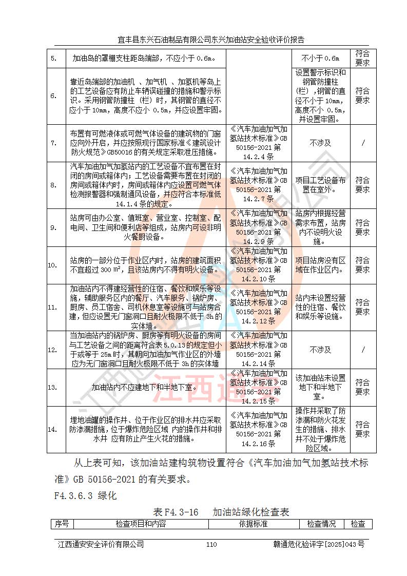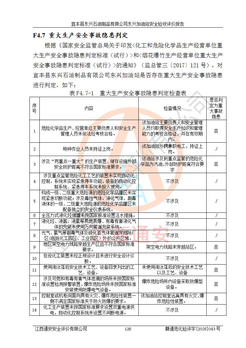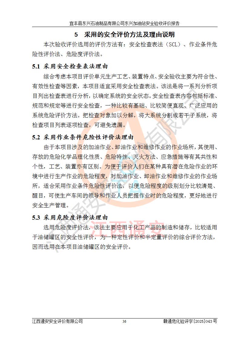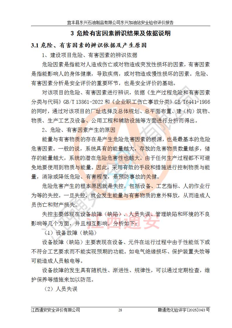 其它 | 一、安全狀況綜合評述 宜豐縣東興石油制品有限公司東興加油站位于宜豐縣沿山大道以北流源村元形組村民建房點(diǎn)以東,從事成品油(汽油、柴油)零售業(yè)務(wù),屬二級加油站。 通過對該加油站建設(shè)項(xiàng)目安全驗(yàn)收評價(jià),得出以下評價(jià)結(jié)論: (1)化學(xué)品、設(shè)備及工藝辨識結(jié)果 經(jīng)辨識,該加油站經(jīng)營、儲存危險(xiǎn)化學(xué)品為汽油和柴油,其中汽油屬于重點(diǎn)監(jiān)管危險(xiǎn)化學(xué)品、特別管控危險(xiǎn)化學(xué)品;該加油站不涉及劇毒化學(xué)品、高毒物品、易制毒化學(xué)品、監(jiān)控化學(xué)品、易制爆化學(xué)品。經(jīng)營、儲存過程中采用的設(shè)備及工藝不屬于淘汰落后設(shè)備及工藝、不涉及危險(xiǎn)化工工藝,生產(chǎn)和儲存單元均不構(gòu)成危險(xiǎn)化學(xué)品重大危險(xiǎn)源。 (2)建設(shè)項(xiàng)目所在地的安全條件和周邊的安全間距 該站東南側(cè)為沿山大道和架空電力線,西南側(cè)和西北側(cè)為居民建筑,北側(cè)為丁類廠房。加油站為二級加油站,設(shè)有油氣回收系統(tǒng),站外50米范圍內(nèi)無重要公共建筑物、明火設(shè)備和甲、乙類生產(chǎn)及儲存設(shè)施,站區(qū)內(nèi)加油設(shè)施與周邊建構(gòu)筑物之間的距離能夠滿足《汽車加油加氣加氫站技術(shù)標(biāo)準(zhǔn)》GB50156-2021 和《建筑設(shè)計(jì)防火規(guī)范》GB50016-2014(2018 年版)以及相關(guān)**規(guī)范要求。本報(bào)告認(rèn)為該加油站建設(shè)項(xiàng)目周邊對加油站的影響以及建設(shè)項(xiàng)目所在地的自然條件對建設(shè)項(xiàng)目投入使用后的影響均較小,該加油站具備標(biāo)準(zhǔn)規(guī)范所要求的安全條件。 (3)該項(xiàng)目安全設(shè)計(jì)診斷報(bào)告的采納情況 該加油站安全設(shè)計(jì)診斷報(bào)告核查的問題(共17項(xiàng))及整改建議均已采納,經(jīng)評價(jià)組現(xiàn)場復(fù)核,均已整改完成。該加油站整改過程工作進(jìn)展順利,處于正常狀態(tài)。經(jīng)查閱資料和分析評價(jià),認(rèn)為本項(xiàng)目技術(shù)、工藝和裝置、設(shè)備(設(shè)施)的安全、可靠性和安全水平符合**相應(yīng)安全標(biāo)準(zhǔn)的要求。 (4)該加油站儲存經(jīng)營的汽油屬于重點(diǎn)監(jiān)管的危險(xiǎn)化學(xué)品和特別控危險(xiǎn)化學(xué)品,該加油站在后續(xù)的經(jīng)營中應(yīng)按照相關(guān)規(guī)范和要求加強(qiáng)安全管理,要求油品運(yùn)輸單位強(qiáng)化運(yùn)輸管理、自身加強(qiáng)儲存定制化管理。 (5)該加油站經(jīng)營過程中存在的危險(xiǎn)有害因素為:①火災(zāi)、爆炸;② 中毒和窒息;③**傷害;④觸電;⑤高處墜落;⑥物體打擊、⑦其他傷害。 其中火災(zāi)、爆炸是主要的危險(xiǎn)、有害因素,加油站埋地儲罐區(qū)、加油區(qū)、卸 油區(qū)是主要的危險(xiǎn)源。 (7)經(jīng)采用作業(yè)條件危險(xiǎn)性評價(jià)法(LEC)進(jìn)行分析,該加油站的作業(yè)條件相對比較安全。在選定的加油作業(yè)、卸油作業(yè)、維修作業(yè)、配電作業(yè)等4個(gè)單元中均為“一般危險(xiǎn)、需要注意”作業(yè)環(huán)境,且一般危險(xiǎn)作業(yè)環(huán)境的出現(xiàn)均由物料的危險(xiǎn)程度所決定,作業(yè)條件相對安全。 (8)采用危險(xiǎn)度評價(jià)法分析,油罐區(qū)主要危險(xiǎn)物質(zhì)為汽油和柴油,常溫、常壓下儲存。儲罐區(qū)汽油罐為Ⅰ級,屬高度危險(xiǎn);柴油罐得分為Ⅲ級,屬低度危險(xiǎn)。油罐采用雙層罐埋地設(shè)置,按要求設(shè)置了通氣管,并裝設(shè)了阻火器;設(shè)置了液位監(jiān)測報(bào)警系統(tǒng)和緊急切斷系統(tǒng),埋地加油管道設(shè)置雙層管道,其安全風(fēng)險(xiǎn)可控。 (9)采用檢查表評價(jià)法對該加油站站址選擇、總平面布置、加油工藝及設(shè)施、消防設(shè)施和給排水、電氣與報(bào)警和緊急切斷系統(tǒng)等進(jìn)行檢查分析,經(jīng)整改后,該加油站涉及的強(qiáng)制條款和其他項(xiàng)均符合要求。該加油站設(shè)置了消防安全設(shè)施、防雷防靜電設(shè)施、液位監(jiān)測措施、油罐泄漏檢測措施、電氣防爆措施等安全防護(hù)設(shè)施,取得了消防驗(yàn)收意見書和防雷檢測合格報(bào)告,符合**法律法規(guī)、標(biāo)準(zhǔn)規(guī)范的要求。該加油站公用工程能夠滿足安全經(jīng)營的基本需要,符合安全經(jīng)營的條件。 (10)該加油站相關(guān)證照齊全,成立了安全生產(chǎn)**小組,配備了安全管理人員,制定了安全管理制度、操作規(guī)程和事故應(yīng)急預(yù)案,加油站的安全管理機(jī)構(gòu)工作有力,加油站安全經(jīng)營管理處于正常有序開展范圍。 (11)對宜豐縣東興石油制品有限公司東興加油站存在重大生產(chǎn)安全事故隱患進(jìn)行判定,檢查結(jié)果為該加油站不存在重大生產(chǎn)安全事故隱患。 總體評價(jià)結(jié)論:宜豐縣東興石油制品有限公司東興加油站認(rèn)真落實(shí)并合理采納安全設(shè)計(jì)診斷報(bào)告中的安全對策、措施及建議,現(xiàn)場與安全設(shè)施設(shè)計(jì)單位重新繪制的現(xiàn)狀總平面布置圖一致,安全設(shè)計(jì)診斷報(bào)告提出的安全對策措施已落實(shí)到位。對潛在的危險(xiǎn)、 有