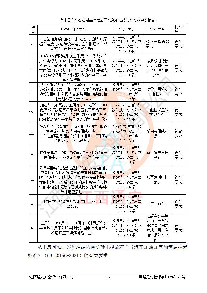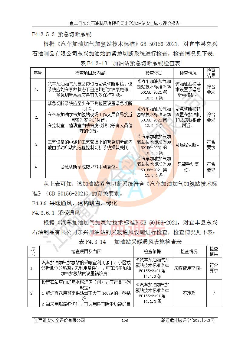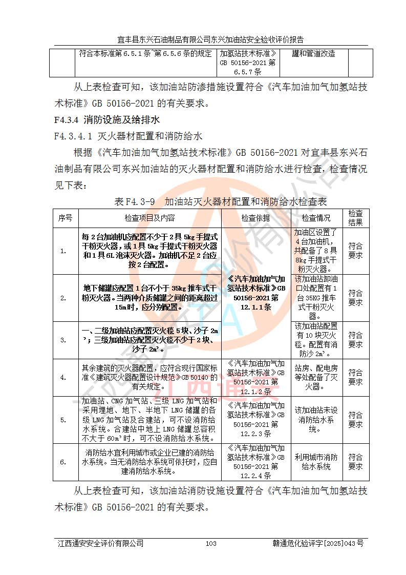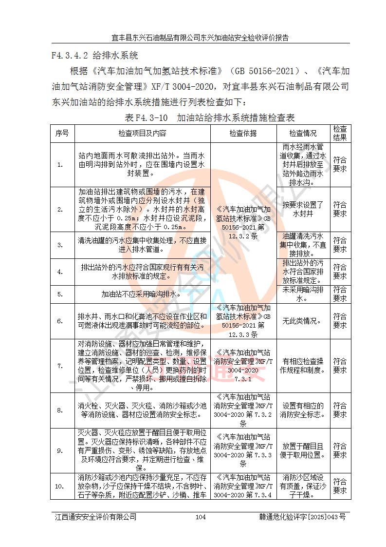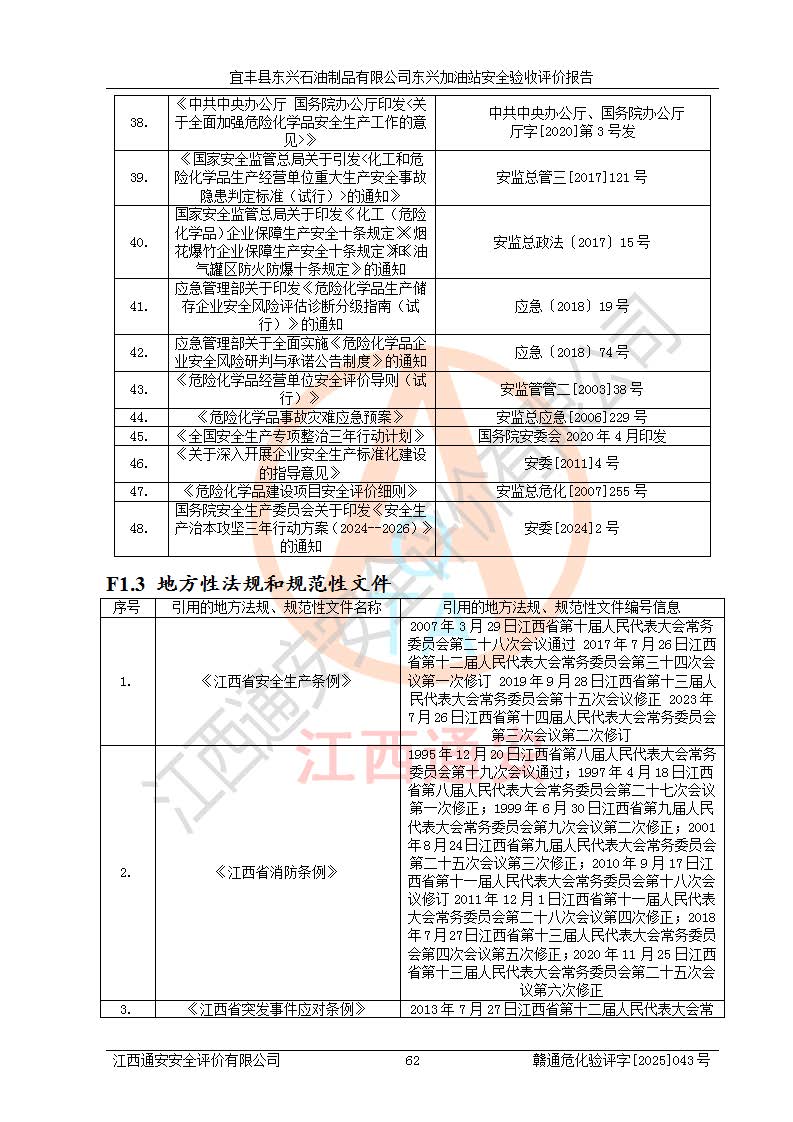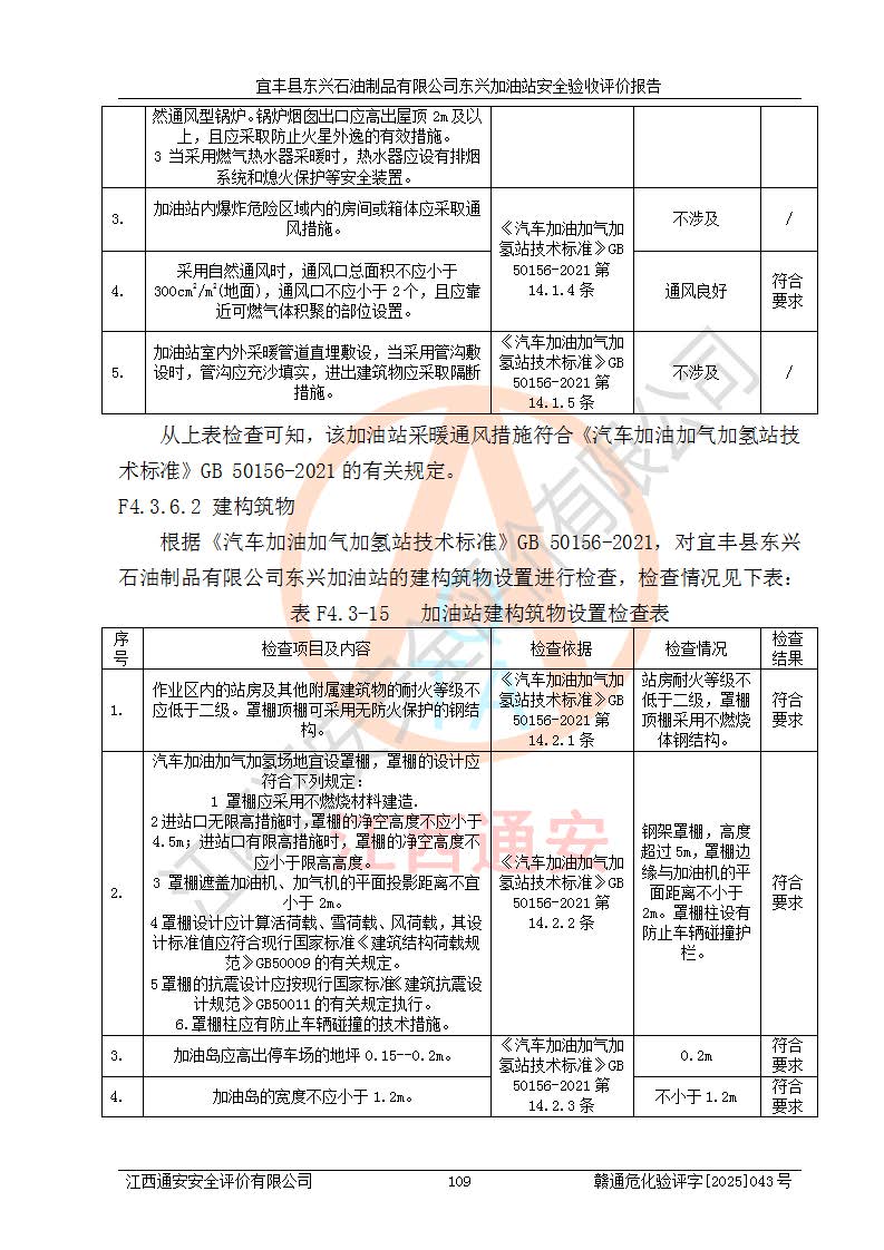 其它 | 一、安全狀況綜合評述 宜豐縣東興石油制品有限公司東興加油站位于宜豐縣沿山大道以北流源村元形組村民建房點(diǎn)以東,從事成品油(汽油、柴油)零售業(yè)務(wù),屬二級加油站。 通過對該加油站建設(shè)項(xiàng)目安全驗(yàn)收評價(jià),得出以下評價(jià)結(jié)論: (1)化學(xué)品、設(shè)備及工藝辨識結(jié)果 經(jīng)辨識,該加油站經(jīng)營、儲存危險(xiǎn)化學(xué)品為汽油和柴油,其中汽油屬于重點(diǎn)監(jiān)管危險(xiǎn)化學(xué)品、特別管控危險(xiǎn)化學(xué)品;該加油站不涉及劇毒化學(xué)品、高毒物品、易制毒化學(xué)品、監(jiān)控化學(xué)品、易制爆化學(xué)品。經(jīng)營、儲存過程中采用的設(shè)備及工藝不屬于淘汰落后設(shè)備及工藝、不涉及危險(xiǎn)化工工藝,生產(chǎn)和儲存單元均不構(gòu)成危險(xiǎn)化學(xué)品重大危險(xiǎn)源。 (2)建設(shè)項(xiàng)目所在地的安全條件和周邊的安全間距 該站東南側(cè)為沿山大道和架空電力線,西南側(cè)和西北側(cè)為居民建筑,北側(cè)為丁類廠房。加油站為二級加油站,設(shè)有油氣回收系統(tǒng),站外50米范圍內(nèi)無重要公共建筑物、明火設(shè)備和甲、乙類生產(chǎn)及儲存設(shè)施,站區(qū)內(nèi)加油設(shè)施與周邊建構(gòu)筑物之間的距離能夠滿足《汽車加油加氣加氫站技術(shù)標(biāo)準(zhǔn)》GB50156-2021 和《建筑設(shè)計(jì)防火規(guī)范》GB50016-2014(2018 年版)以及相關(guān)**規(guī)范要求。本報(bào)告認(rèn)為該加油站建設(shè)項(xiàng)目周邊對加油站的影響以及建設(shè)項(xiàng)目所在地的自然條件對建設(shè)項(xiàng)目投入使用后的影響均較小,該加油站具備標(biāo)準(zhǔn)規(guī)范所要求的安全條件。 (3)該項(xiàng)目安全設(shè)計(jì)診斷報(bào)告的采納情況 該加油站安全設(shè)計(jì)診斷報(bào)告核查的問題(共17項(xiàng))及整改建議均已采納,經(jīng)評價(jià)組現(xiàn)場復(fù)核,均已整改完成。該加油站整改過程工作進(jìn)展順利,處于正常狀態(tài)。經(jīng)查閱資料和分析評價(jià),認(rèn)為本項(xiàng)目技術(shù)、工藝和裝置、設(shè)備(設(shè)施)的安全、可靠性和安全水平符合**相應(yīng)安全標(biāo)準(zhǔn)的要求。 (4)該加油站儲存經(jīng)營的汽油屬于重點(diǎn)監(jiān)管的危險(xiǎn)化學(xué)品和特別控危險(xiǎn)化學(xué)品,該加油站在后續(xù)的經(jīng)營中應(yīng)按照相關(guān)規(guī)范和要求加強(qiáng)安全管理,要求油品運(yùn)輸單位強(qiáng)化運(yùn)輸管理、自身加強(qiáng)儲存定制化管理。 (5)該加油站經(jīng)營過程中存在的危險(xiǎn)有害因素為:①火災(zāi)、爆炸;② 中毒和窒息;③**傷害;④觸電;⑤高處墜落;⑥物體打擊、⑦其他傷害。 其中火災(zāi)、爆炸是主要的危險(xiǎn)、有害因素,加油站埋地儲罐區(qū)、加油區(qū)、卸 油區(qū)是主要的危險(xiǎn)源。 (7)經(jīng)采用作業(yè)條件危險(xiǎn)性評價(jià)法(LEC)進(jìn)行分析,該加油站的作業(yè)條件相對比較安全。在選定的加油作業(yè)、卸油作業(yè)、維修作業(yè)、配電作業(yè)等4個(gè)單元中均為“一般危險(xiǎn)、需要注意”作業(yè)環(huán)境,且一般危險(xiǎn)作業(yè)環(huán)境的出現(xiàn)均由物料的危險(xiǎn)程度所決定,作業(yè)條件相對安全。 (8)采用危險(xiǎn)度評價(jià)法分析,油罐區(qū)主要危險(xiǎn)物質(zhì)為汽油和柴油,常溫、常壓下儲存。儲罐區(qū)汽油罐為Ⅰ級,屬高度危險(xiǎn);柴油罐得分為Ⅲ級,屬低度危險(xiǎn)。油罐采用雙層罐埋地設(shè)置,按要求設(shè)置了通氣管,并裝設(shè)了阻火器;設(shè)置了液位監(jiān)測報(bào)警系統(tǒng)和緊急切斷系統(tǒng),埋地加油管道設(shè)置雙層管道,其安全風(fēng)險(xiǎn)可控。 (9)采用檢查表評價(jià)法對該加油站站址選擇、總平面布置、加油工藝及設(shè)施、消防設(shè)施和給排水、電氣與報(bào)警和緊急切斷系統(tǒng)等進(jìn)行檢查分析,經(jīng)整改后,該加油站涉及的強(qiáng)制條款和其他項(xiàng)均符合要求。該加油站設(shè)置了消防安全設(shè)施、防雷防靜電設(shè)施、液位監(jiān)測措施、油罐泄漏檢測措施、電氣防爆措施等安全防護(hù)設(shè)施,取得了消防驗(yàn)收意見書和防雷檢測合格報(bào)告,符合**法律法規(guī)、標(biāo)準(zhǔn)規(guī)范的要求。該加油站公用工程能夠滿足安全經(jīng)營的基本需要,符合安全經(jīng)營的條件。 (10)該加油站相關(guān)證照齊全,成立了安全生產(chǎn)**小組,配備了安全管理人員,制定了安全管理制度、操作規(guī)程和事故應(yīng)急預(yù)案,加油站的安全管理機(jī)構(gòu)工作有力,加油站安全經(jīng)營管理處于正常有序開展范圍。 (11)對宜豐縣東興石油制品有限公司東興加油站存在重大生產(chǎn)安全事故隱患進(jìn)行判定,檢查結(jié)果為該加油站不存在重大生產(chǎn)安全事故隱患。 總體評價(jià)結(jié)論:宜豐縣東興石油制品有限公司東興加油站認(rèn)真落實(shí)并合理采納安全設(shè)計(jì)診斷報(bào)告中的安全對策、措施及建議,現(xiàn)場與安全設(shè)施設(shè)計(jì)單位重新繪制的現(xiàn)狀總平面布置圖一致,安全設(shè)計(jì)診斷報(bào)告提出的安全對策措施已落實(shí)到位。對潛在的危險(xiǎn)、 有