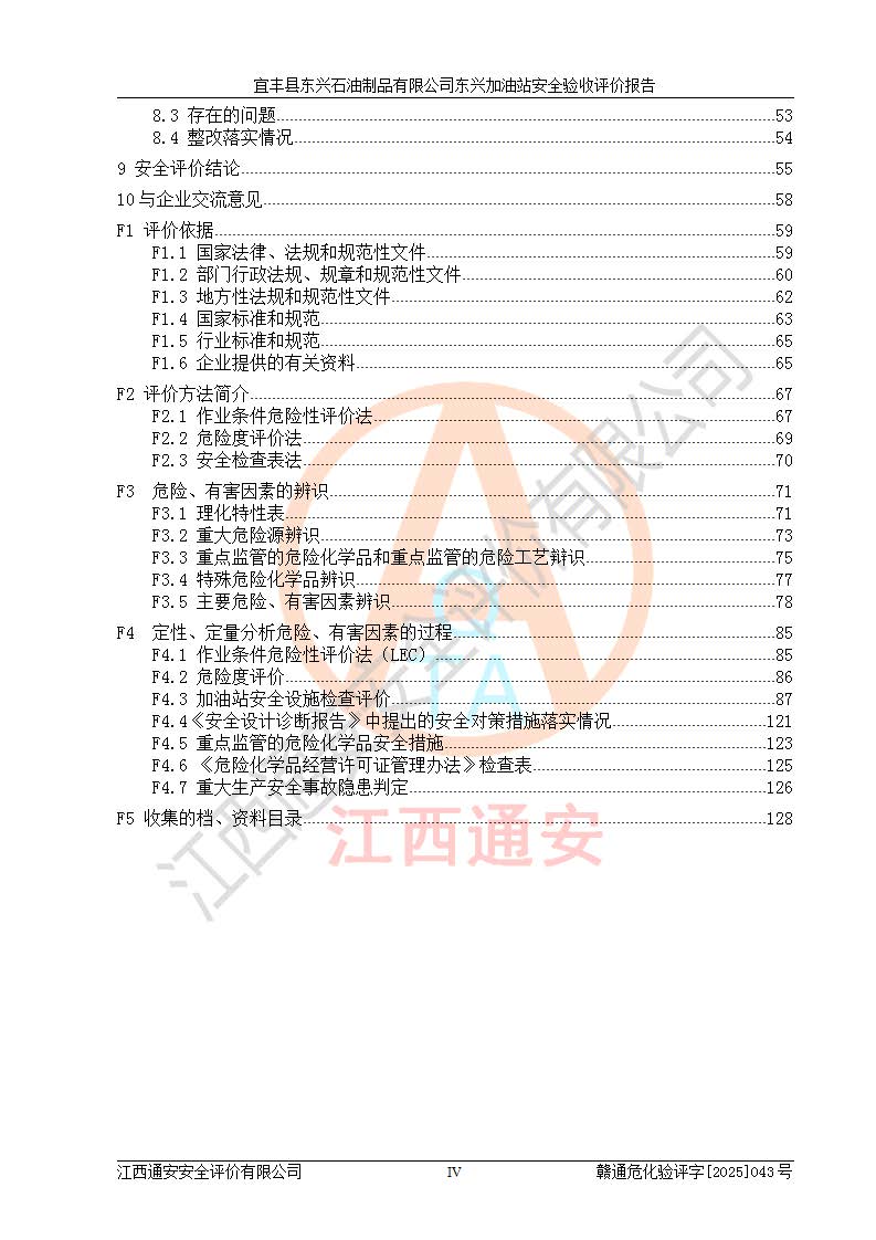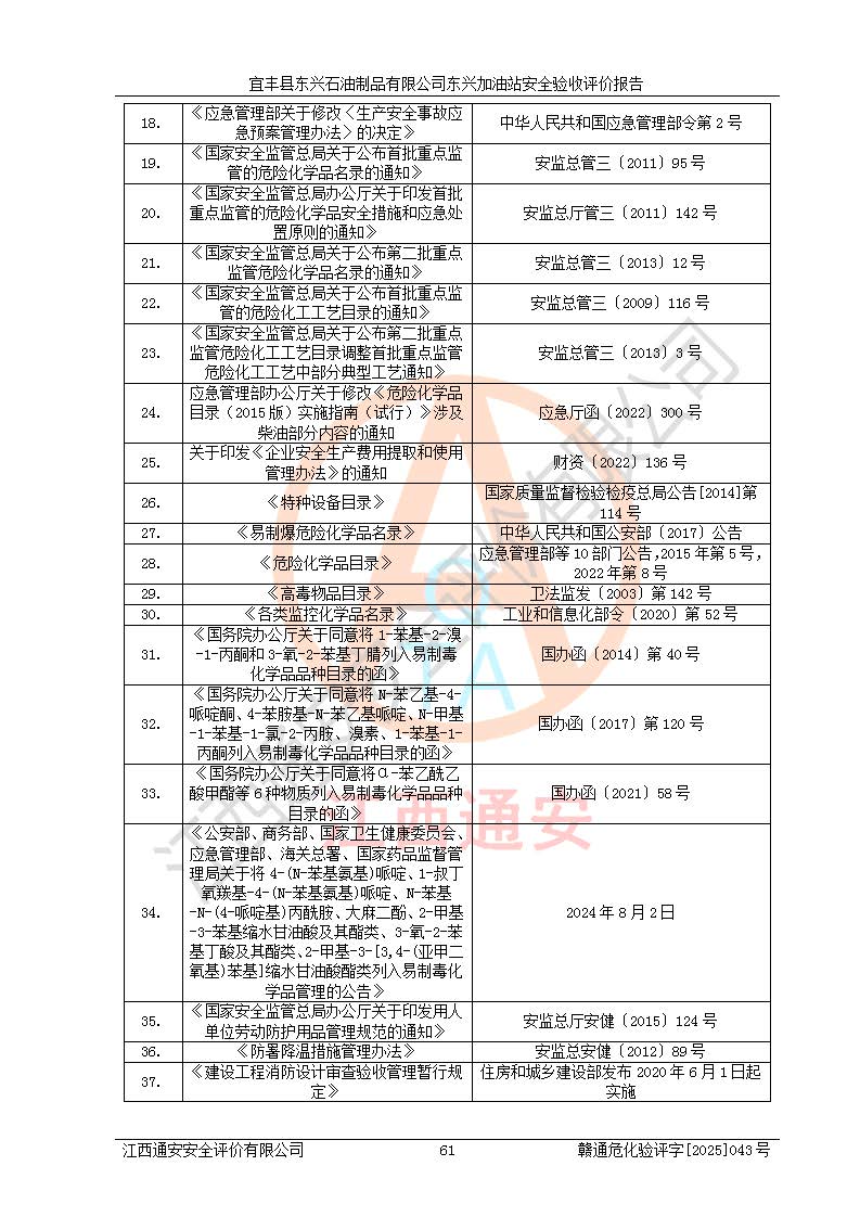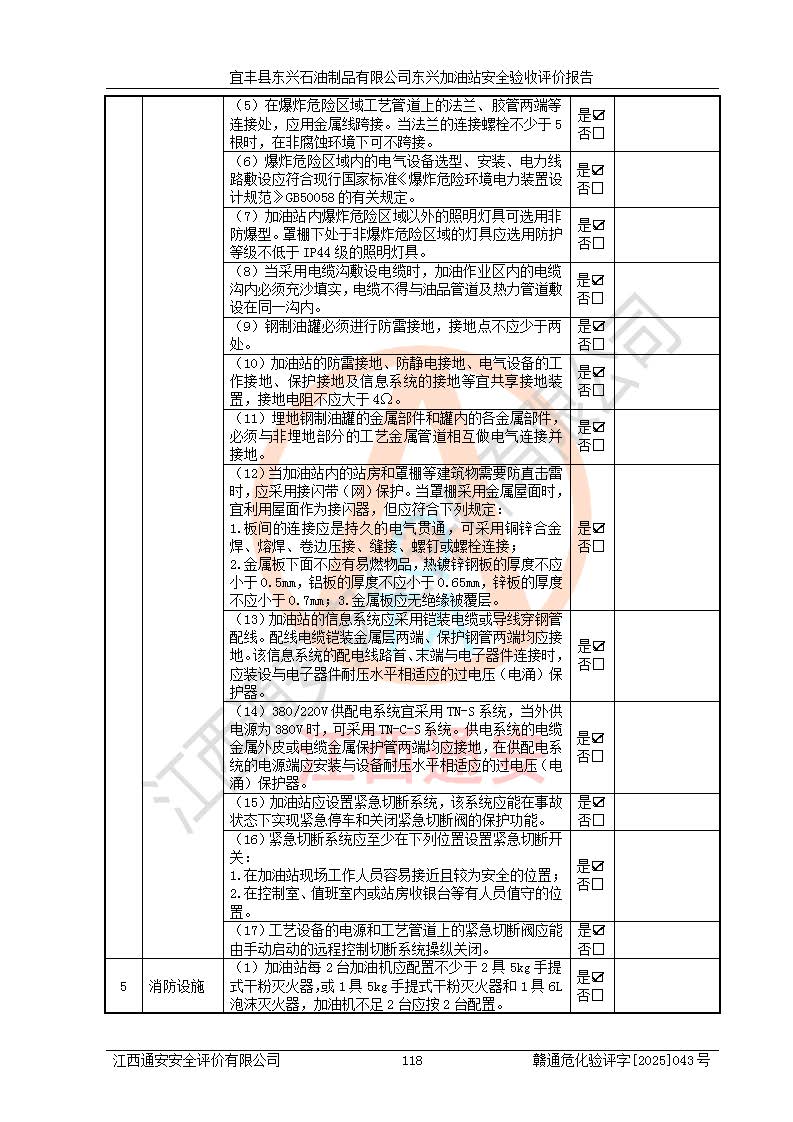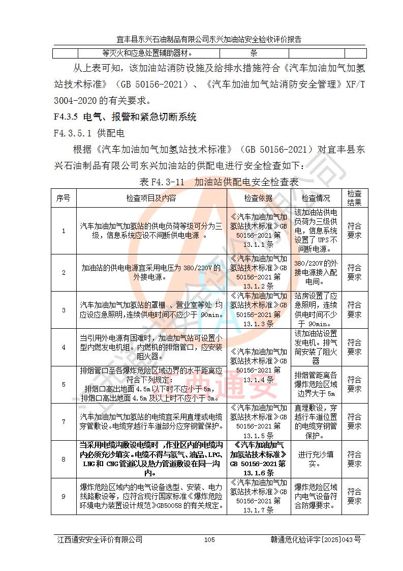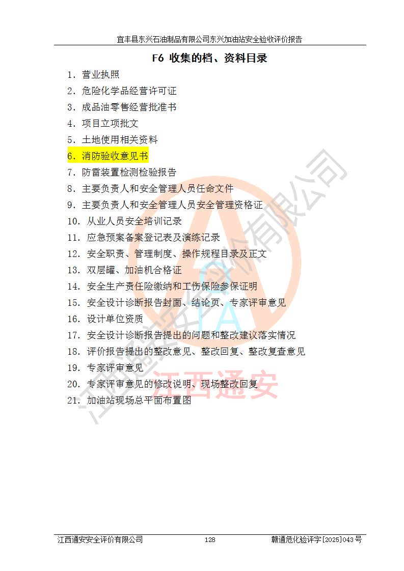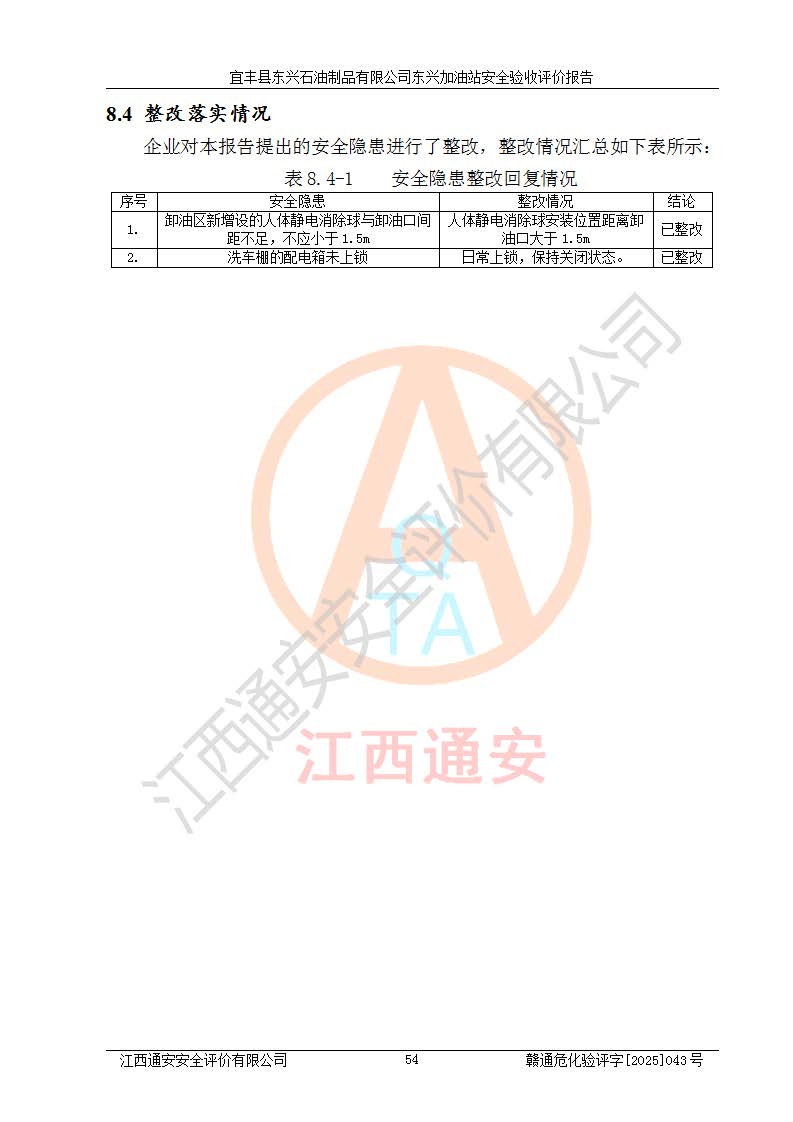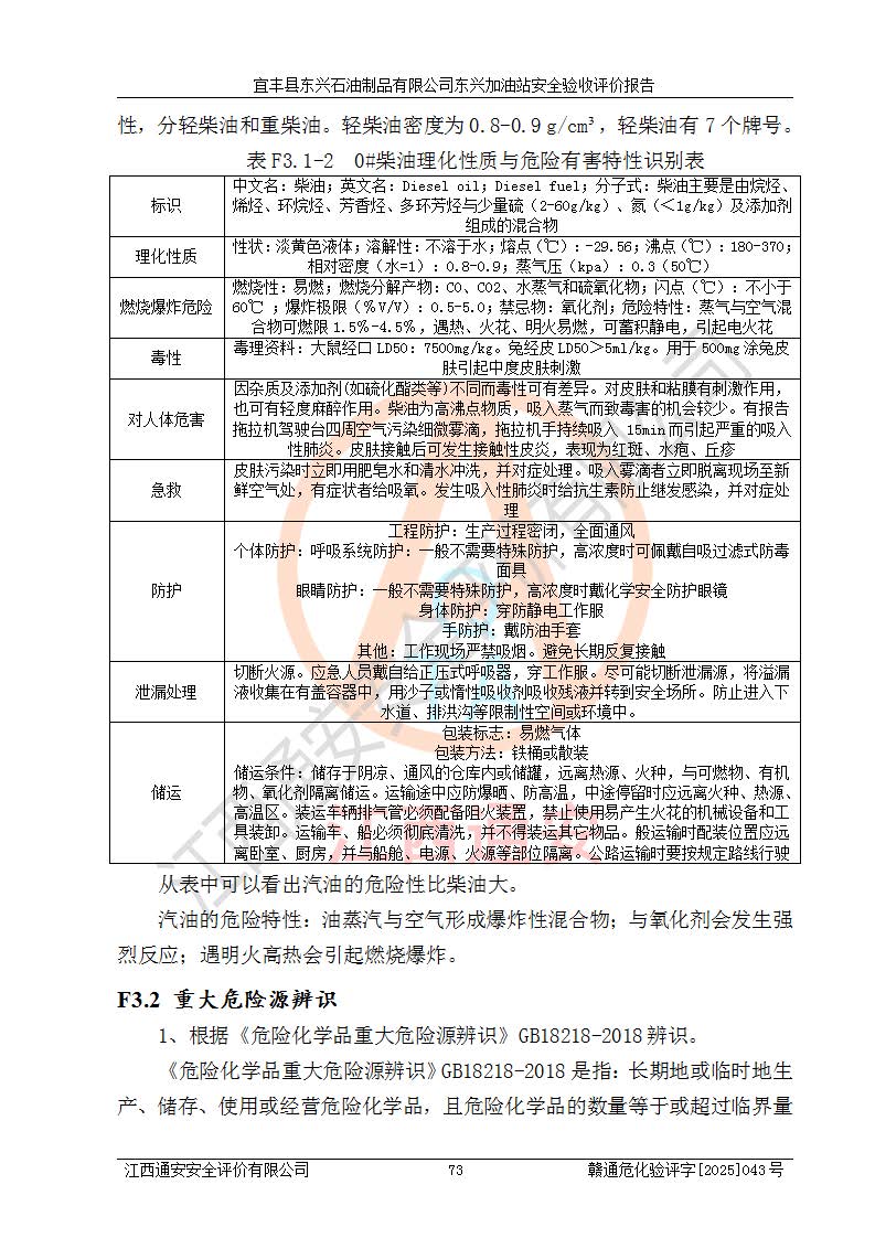 其它 | 一、安全狀況綜合評述 宜豐縣東興石油制品有限公司東興加油站位于宜豐縣沿山大道以北流源村元形組村民建房點(diǎn)以東,從事成品油(汽油、柴油)零售業(yè)務(wù),屬二級加油站。 通過對該加油站建設(shè)項(xiàng)目安全驗(yàn)收評價(jià),得出以下評價(jià)結(jié)論: (1)化學(xué)品、設(shè)備及工藝辨識結(jié)果 經(jīng)辨識,該加油站經(jīng)營、儲存危險(xiǎn)化學(xué)品為汽油和柴油,其中汽油屬于重點(diǎn)監(jiān)管危險(xiǎn)化學(xué)品、特別管控危險(xiǎn)化學(xué)品;該加油站不涉及劇毒化學(xué)品、高毒物品、易制毒化學(xué)品、監(jiān)控化學(xué)品、易制爆化學(xué)品。經(jīng)營、儲存過程中采用的設(shè)備及工藝不屬于淘汰落后設(shè)備及工藝、不涉及危險(xiǎn)化工工藝,生產(chǎn)和儲存單元均不構(gòu)成危險(xiǎn)化學(xué)品重大危險(xiǎn)源。 (2)建設(shè)項(xiàng)目所在地的安全條件和周邊的安全間距 該站東南側(cè)為沿山大道和架空電力線,西南側(cè)和西北側(cè)為居民建筑,北側(cè)為丁類廠房。加油站為二級加油站,設(shè)有油氣回收系統(tǒng),站外50米范圍內(nèi)無重要公共建筑物、明火設(shè)備和甲、乙類生產(chǎn)及儲存設(shè)施,站區(qū)內(nèi)加油設(shè)施與周邊建構(gòu)筑物之間的距離能夠滿足《汽車加油加氣加氫站技術(shù)標(biāo)準(zhǔn)》GB50156-2021 和《建筑設(shè)計(jì)防火規(guī)范》GB50016-2014(2018 年版)以及相關(guān)**規(guī)范要求。本報(bào)告認(rèn)為該加油站建設(shè)項(xiàng)目周邊對加油站的影響以及建設(shè)項(xiàng)目所在地的自然條件對建設(shè)項(xiàng)目投入使用后的影響均較小,該加油站具備標(biāo)準(zhǔn)規(guī)范所要求的安全條件。 (3)該項(xiàng)目安全設(shè)計(jì)診斷報(bào)告的采納情況 該加油站安全設(shè)計(jì)診斷報(bào)告核查的問題(共17項(xiàng))及整改建議均已采納,經(jīng)評價(jià)組現(xiàn)場復(fù)核,均已整改完成。該加油站整改過程工作進(jìn)展順利,處于正常狀態(tài)。經(jīng)查閱資料和分析評價(jià),認(rèn)為本項(xiàng)目技術(shù)、工藝和裝置、設(shè)備(設(shè)施)的安全、可靠性和安全水平符合**相應(yīng)安全標(biāo)準(zhǔn)的要求。 (4)該加油站儲存經(jīng)營的汽油屬于重點(diǎn)監(jiān)管的危險(xiǎn)化學(xué)品和特別控危險(xiǎn)化學(xué)品,該加油站在后續(xù)的經(jīng)營中應(yīng)按照相關(guān)規(guī)范和要求加強(qiáng)安全管理,要求油品運(yùn)輸單位強(qiáng)化運(yùn)輸管理、自身加強(qiáng)儲存定制化管理。 (5)該加油站經(jīng)營過程中存在的危險(xiǎn)有害因素為:①火災(zāi)、爆炸;② 中毒和窒息;③**傷害;④觸電;⑤高處墜落;⑥物體打擊、⑦其他傷害。 其中火災(zāi)、爆炸是主要的危險(xiǎn)、有害因素,加油站埋地儲罐區(qū)、加油區(qū)、卸 油區(qū)是主要的危險(xiǎn)源。 (7)經(jīng)采用作業(yè)條件危險(xiǎn)性評價(jià)法(LEC)進(jìn)行分析,該加油站的作業(yè)條件相對比較安全。在選定的加油作業(yè)、卸油作業(yè)、維修作業(yè)、配電作業(yè)等4個(gè)單元中均為“一般危險(xiǎn)、需要注意”作業(yè)環(huán)境,且一般危險(xiǎn)作業(yè)環(huán)境的出現(xiàn)均由物料的危險(xiǎn)程度所決定,作業(yè)條件相對安全。 (8)采用危險(xiǎn)度評價(jià)法分析,油罐區(qū)主要危險(xiǎn)物質(zhì)為汽油和柴油,常溫、常壓下儲存。儲罐區(qū)汽油罐為Ⅰ級,屬高度危險(xiǎn);柴油罐得分為Ⅲ級,屬低度危險(xiǎn)。油罐采用雙層罐埋地設(shè)置,按要求設(shè)置了通氣管,并裝設(shè)了阻火器;設(shè)置了液位監(jiān)測報(bào)警系統(tǒng)和緊急切斷系統(tǒng),埋地加油管道設(shè)置雙層管道,其安全風(fēng)險(xiǎn)可控。 (9)采用檢查表評價(jià)法對該加油站站址選擇、總平面布置、加油工藝及設(shè)施、消防設(shè)施和給排水、電氣與報(bào)警和緊急切斷系統(tǒng)等進(jìn)行檢查分析,經(jīng)整改后,該加油站涉及的強(qiáng)制條款和其他項(xiàng)均符合要求。該加油站設(shè)置了消防安全設(shè)施、防雷防靜電設(shè)施、液位監(jiān)測措施、油罐泄漏檢測措施、電氣防爆措施等安全防護(hù)設(shè)施,取得了消防驗(yàn)收意見書和防雷檢測合格報(bào)告,符合**法律法規(guī)、標(biāo)準(zhǔn)規(guī)范的要求。該加油站公用工程能夠滿足安全經(jīng)營的基本需要,符合安全經(jīng)營的條件。 (10)該加油站相關(guān)證照齊全,成立了安全生產(chǎn)**小組,配備了安全管理人員,制定了安全管理制度、操作規(guī)程和事故應(yīng)急預(yù)案,加油站的安全管理機(jī)構(gòu)工作有力,加油站安全經(jīng)營管理處于正常有序開展范圍。 (11)對宜豐縣東興石油制品有限公司東興加油站存在重大生產(chǎn)安全事故隱患進(jìn)行判定,檢查結(jié)果為該加油站不存在重大生產(chǎn)安全事故隱患。 總體評價(jià)結(jié)論:宜豐縣東興石油制品有限公司東興加油站認(rèn)真落實(shí)并合理采納安全設(shè)計(jì)診斷報(bào)告中的安全對策、措施及建議,現(xiàn)場與安全設(shè)施設(shè)計(jì)單位重新繪制的現(xiàn)狀總平面布置圖一致,安全設(shè)計(jì)診斷報(bào)告提出的安全對策措施已落實(shí)到位。對潛在的危險(xiǎn)、 有
