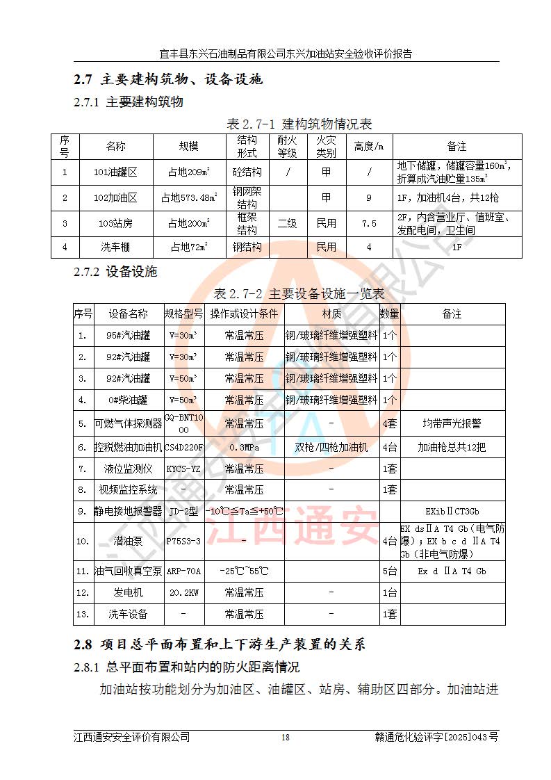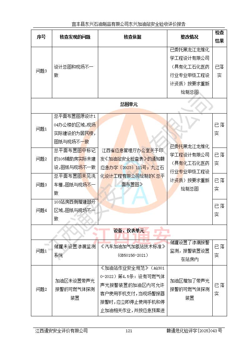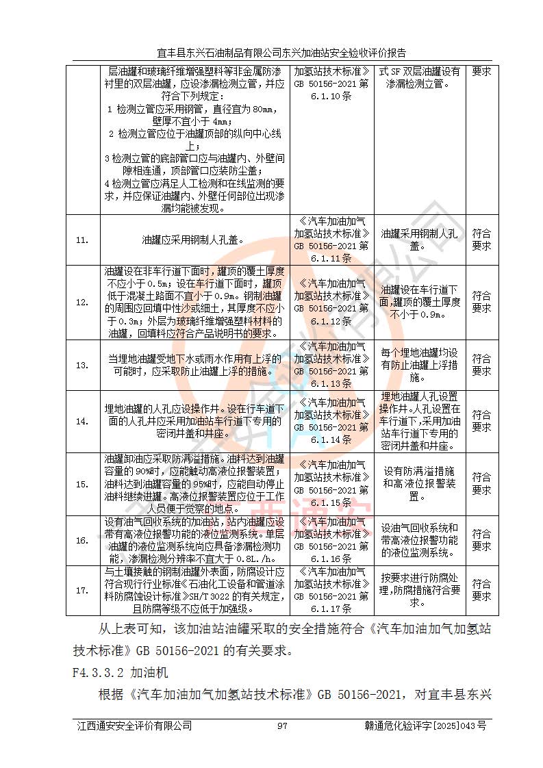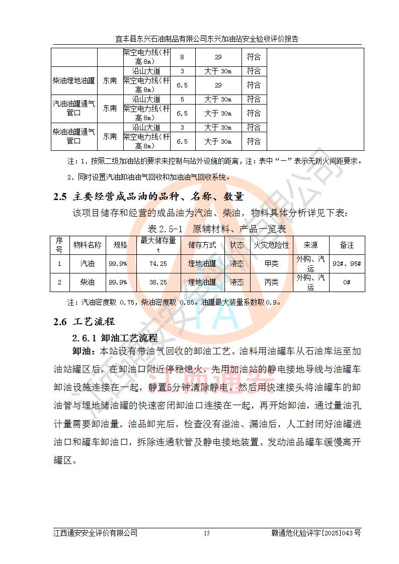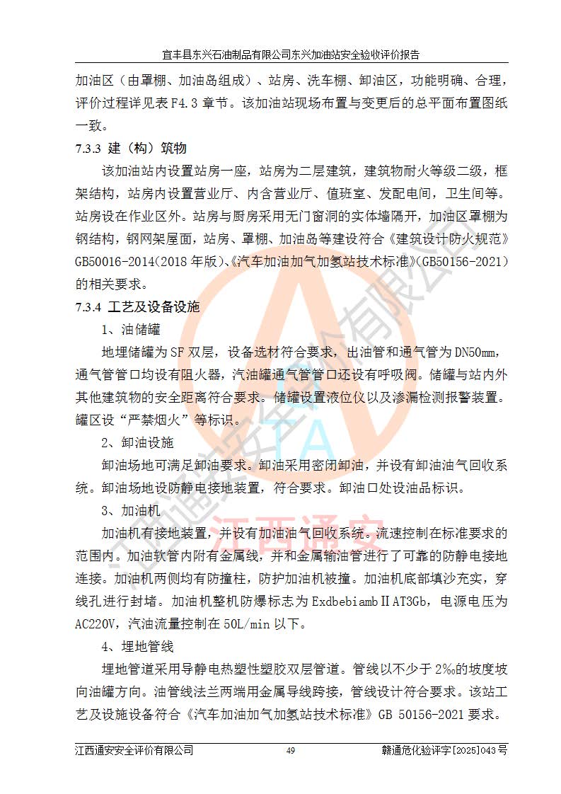 項(xiàng)目簡介 | 宜豐縣東興石油制品有限公司東興加油站(以下簡稱“該加油站”)成立于2013年10月23日,營業(yè)場所位于宜豐縣沿山大道以北流源村元形組村民建房點(diǎn)以東,法定**人為張凱軍。該加油站統(tǒng)一社會信用代碼為91360924MA35HD1D8P,屬于有限責(zé)任制公司分公司(自然人投資或控股)。經(jīng)營范圍:汽油、柴油、潤滑油零售,洗車,煙、預(yù)包裝食品零售。 該加油站油罐區(qū)設(shè)有4個(gè)埋地臥式儲罐,其中1臺50m3的0#柴油儲罐,1臺50m3的92#汽油儲罐,1臺30m3的92#汽油儲罐,1臺30m3的95#汽油儲罐,柴油罐容積折半計(jì)入油罐總?cè)莘e,折算后總?cè)莘e為135m3,屬于二級加油站,站內(nèi)設(shè)有油氣回收系統(tǒng)。油罐采用直埋鋪設(shè),并設(shè)抗浮基礎(chǔ)。加油區(qū)設(shè)4個(gè)加油島,采用2臺四槍加油機(jī),2臺雙槍加油機(jī)。該加油站于2023年2月9日經(jīng)宜豐縣應(yīng)急管理局核準(zhǔn),換發(fā)了新的《危險(xiǎn)化學(xué)品經(jīng)營許可證》,證書編號:贛宜安經(jīng)油字[2022]36092401號,許可范圍:汽油、柴油。**期限為2022年9月12日至2025年9月11日。 根據(jù)《危險(xiǎn)化學(xué)品安全管理?xiàng)l例》(經(jīng)***令第344號發(fā)布,***令第591號、***令第645號修改),《危險(xiǎn)化學(xué)品經(jīng)營許可證管理辦法》(2012年7月17日**安全生產(chǎn)監(jiān)督管理總局令第55號公布,自2012年9月1日起施行;根據(jù)2015年5月27日**安全生產(chǎn)監(jiān)督管理總局令第79號修正)等法律法規(guī)及文件要求,該加油站的危險(xiǎn)化學(xué)品經(jīng)營許可證三年**期即將到期,需要重新進(jìn)行安全現(xiàn)狀評價(jià)。由于該加油站2013年建成投運(yùn),安全設(shè)施“三同時(shí)”資料不全,根據(jù)《江西省應(yīng)急管理廳辦公室關(guān)于規(guī)范危險(xiǎn)化學(xué)品經(jīng)營許可工作的通知》(贛應(yīng)急辦字〔2025〕58號)等要求,危險(xiǎn)化學(xué)品經(jīng)營企業(yè)應(yīng)在一個(gè)延期換證周期內(nèi)進(jìn)行安全設(shè)計(jì)診斷,并根據(jù)診斷結(jié)論開展安全設(shè)施設(shè)計(jì)整改,驗(yàn)收通過后方可延期換證。該加油站于2025年6月委托黑龍江龍維化學(xué)工程設(shè)計(jì)有限公司(具有化工石化醫(yī)藥行業(yè)專業(yè)**工程設(shè)計(jì)資質(zhì))編制了《宜豐縣東興石油制品有限公司東興加油站安全設(shè)計(jì)診斷報(bào)告》,并通過了專家評審。根據(jù)該安全設(shè)計(jì)診斷報(bào)告提出的安全隱患及整改建議,該加油站及時(shí)進(jìn)行了整改,目前已整改到位,具備安全設(shè)施驗(yàn)收條件。 | ||||