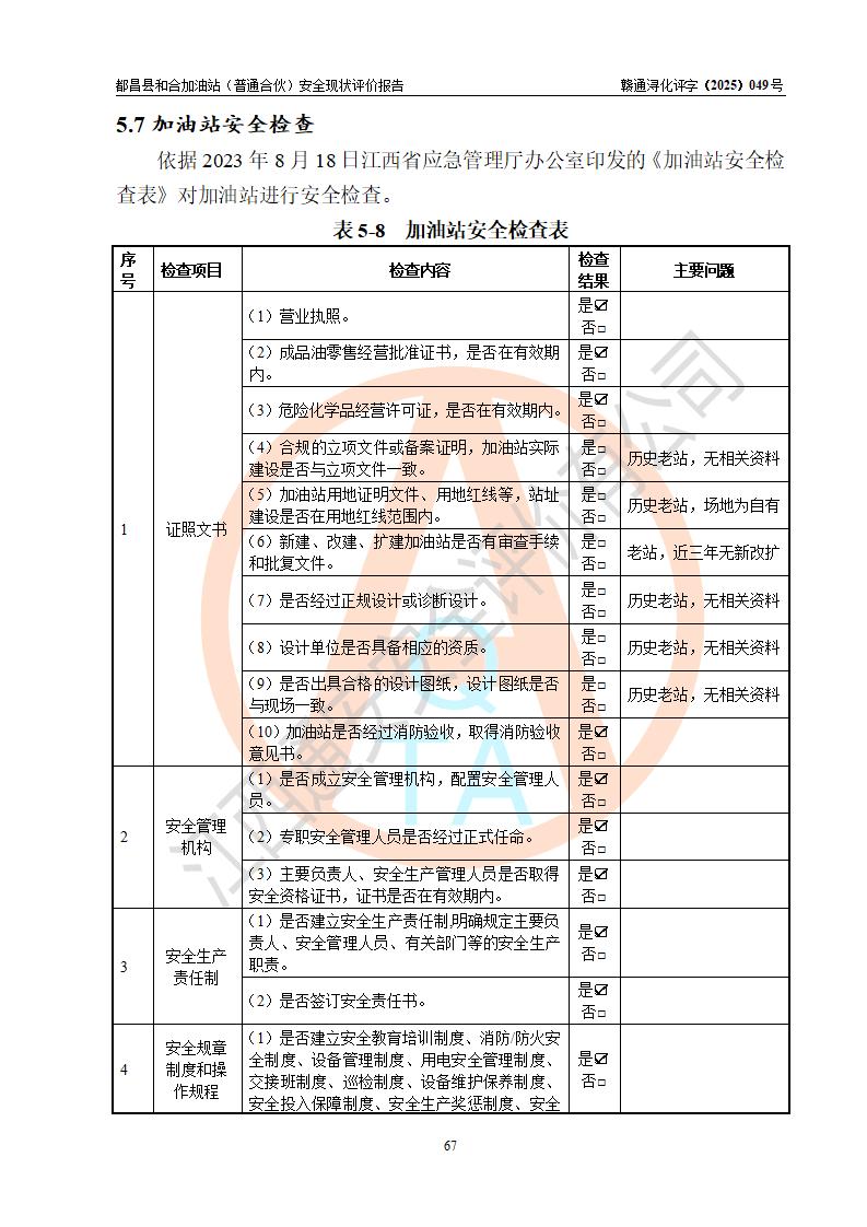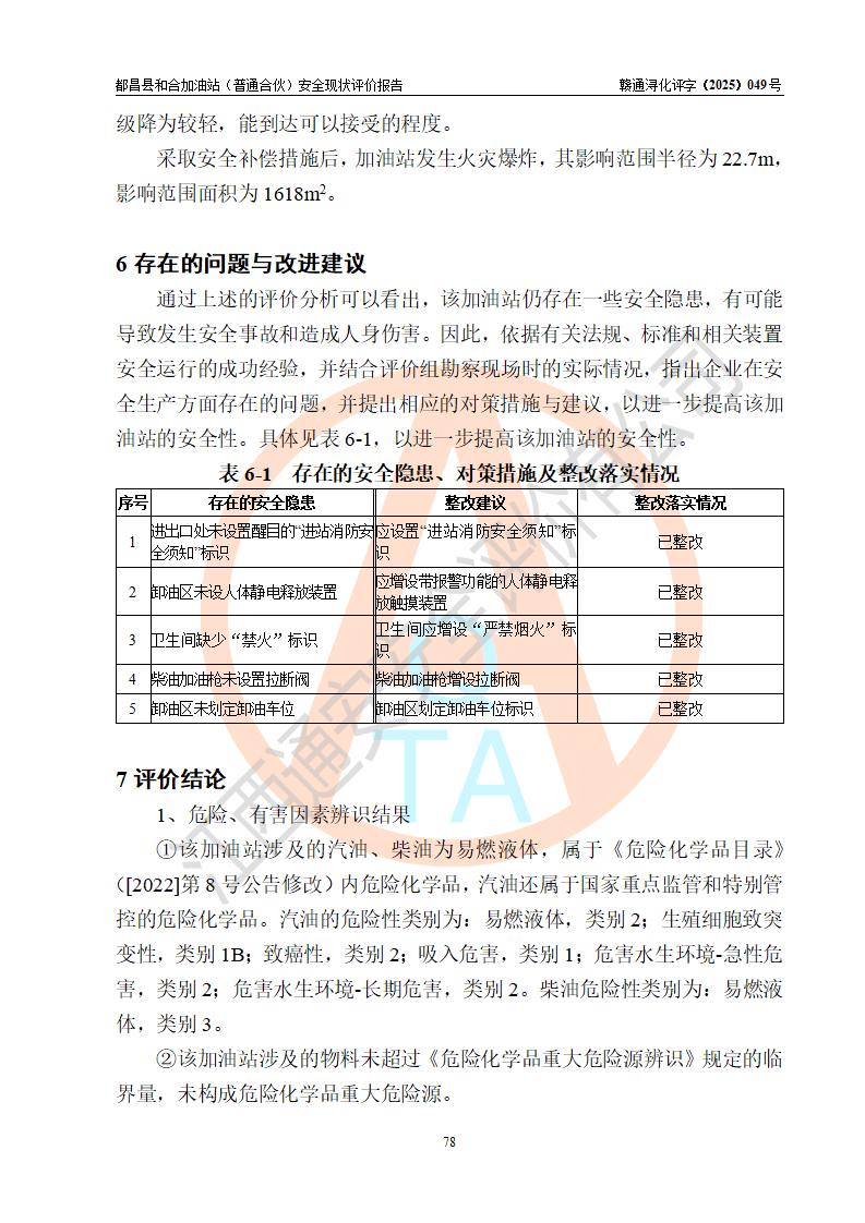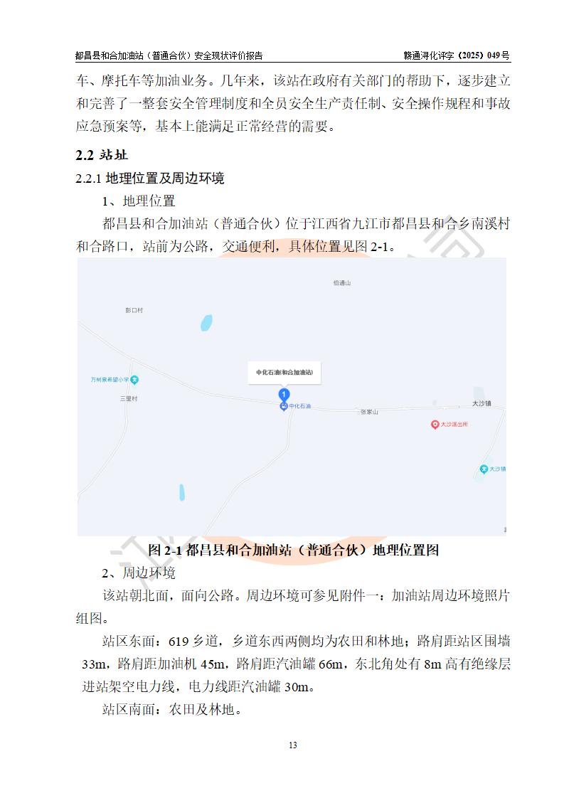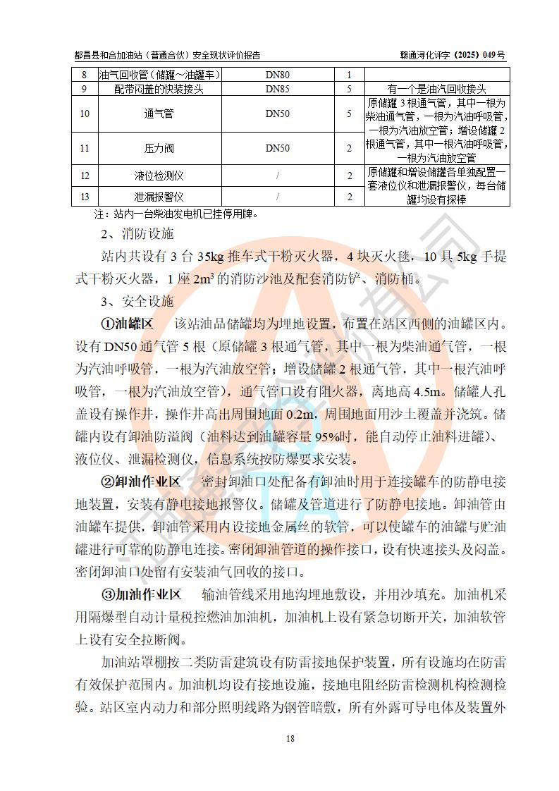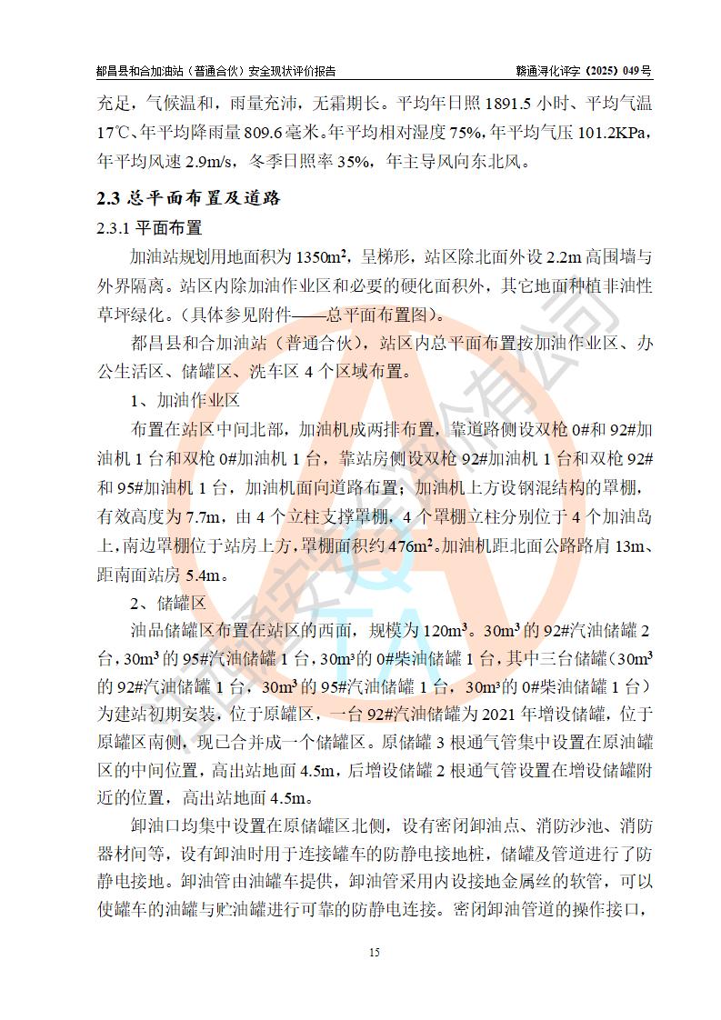 都昌縣和合加油站(普通合伙)是一家專門(mén)從事成品油零售經(jīng)營(yíng)的普通合伙企業(yè),執(zhí)行事務(wù)合伙人:江銘,經(jīng)營(yíng)場(chǎng)所位于江西省九江市都昌縣和合鄉(xiāng)南溪村和合路口。該加油站現(xiàn)有從業(yè)人員6人,其中安全管理人員1人,主要負(fù)責(zé)人江麗娟。 該加油站站區(qū)占地面積1350m2,站區(qū)內(nèi)設(shè)置有4臺(tái)雙槍程控燃油加油機(jī)及配套的工藝管線、30m3雙層0#柴油儲(chǔ)罐1臺(tái)、30m3雙層92#汽油儲(chǔ)罐2臺(tái)、30m3雙層95#汽油儲(chǔ)罐1臺(tái),油品儲(chǔ)罐總?cè)莘e為120m3(折算成汽油為105m3)。按現(xiàn)行《汽車加油加氣加氫站技術(shù)標(biāo)準(zhǔn)》對(duì)加油站的等級(jí)劃分原則,該站屬于二級(jí)加油站。 該站由九江市行政審批局換發(fā)《危險(xiǎn)化學(xué)品經(jīng)營(yíng)許可證》(證號(hào):贛九行審經(jīng)(甲)字[2022]000134號(hào)),**期限2022年08月15日至2025年08月14日。 |