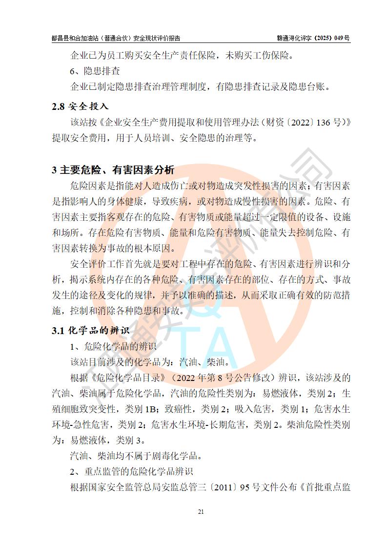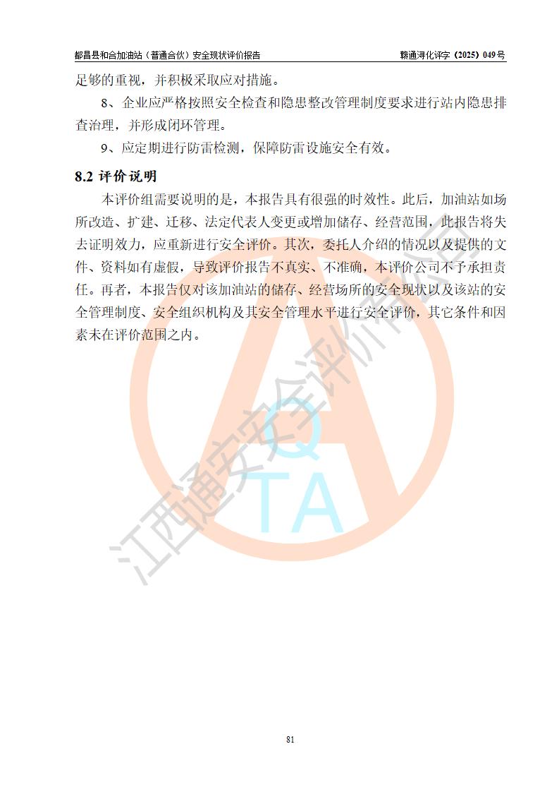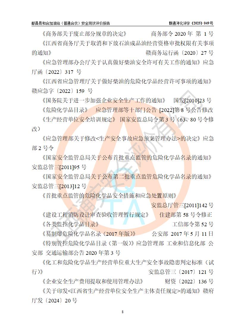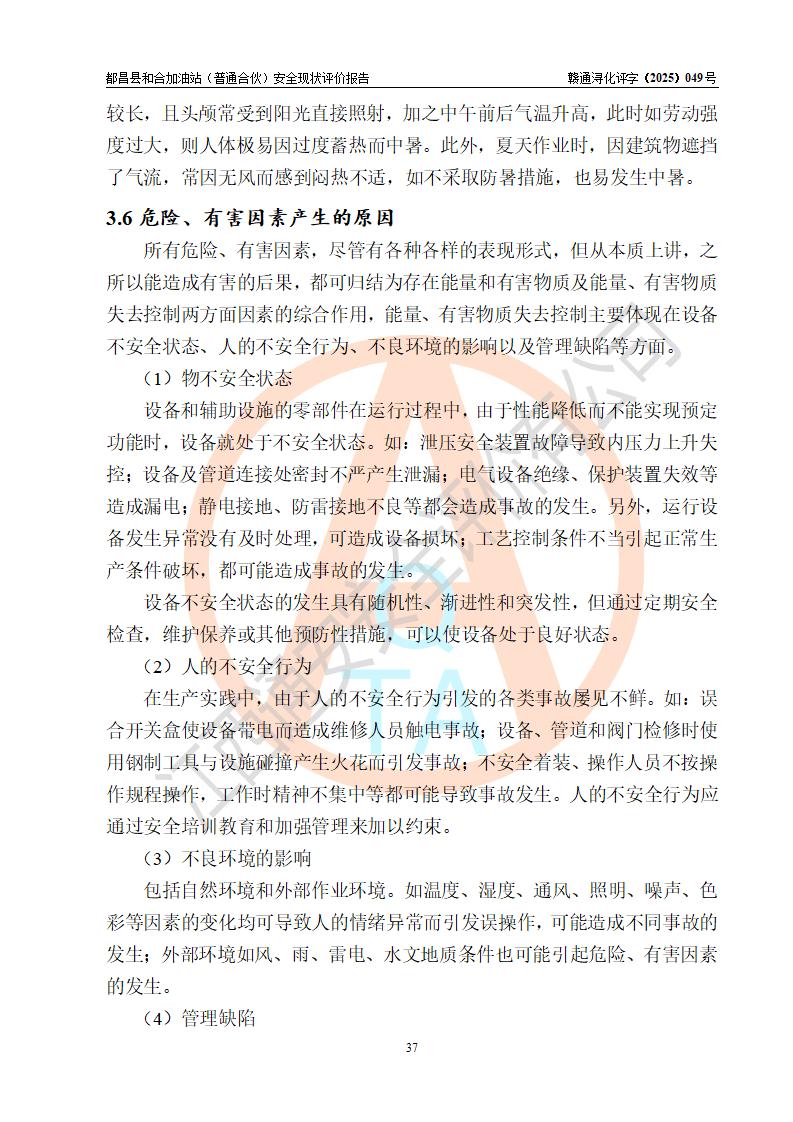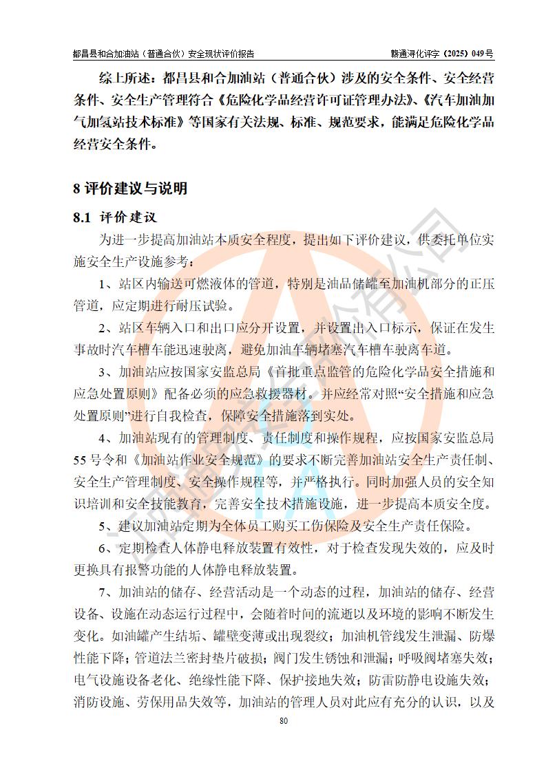 都昌縣和合加油站(普通合伙)是一家專門(mén)從事成品油零售經(jīng)營(yíng)的普通合伙企業(yè),執(zhí)行事務(wù)合伙人:江銘,經(jīng)營(yíng)場(chǎng)所位于江西省九江市都昌縣和合鄉(xiāng)南溪村和合路口。該加油站現(xiàn)有從業(yè)人員6人,其中安全管理人員1人,主要負(fù)責(zé)人江麗娟。 該加油站站區(qū)占地面積1350m2,站區(qū)內(nèi)設(shè)置有4臺(tái)雙槍程控燃油加油機(jī)及配套的工藝管線、30m3雙層0#柴油儲(chǔ)罐1臺(tái)、30m3雙層92#汽油儲(chǔ)罐2臺(tái)、30m3雙層95#汽油儲(chǔ)罐1臺(tái),油品儲(chǔ)罐總?cè)莘e為120m3(折算成汽油為105m3)。按現(xiàn)行《汽車加油加氣加氫站技術(shù)標(biāo)準(zhǔn)》對(duì)加油站的等級(jí)劃分原則,該站屬于二級(jí)加油站。 該站由九江市行政審批局換發(fā)《危險(xiǎn)化學(xué)品經(jīng)營(yíng)許可證》(證號(hào):贛九行審經(jīng)(甲)字[2022]000134號(hào)),**期限2022年08月15日至2025年08月14日。 |