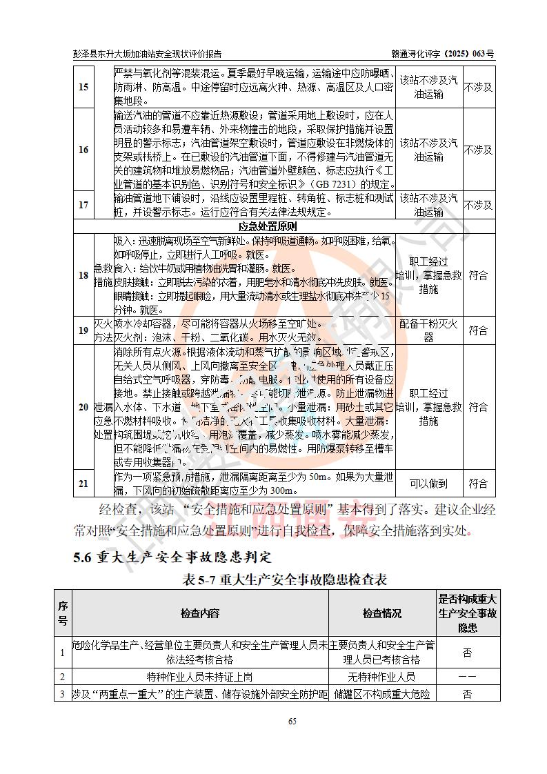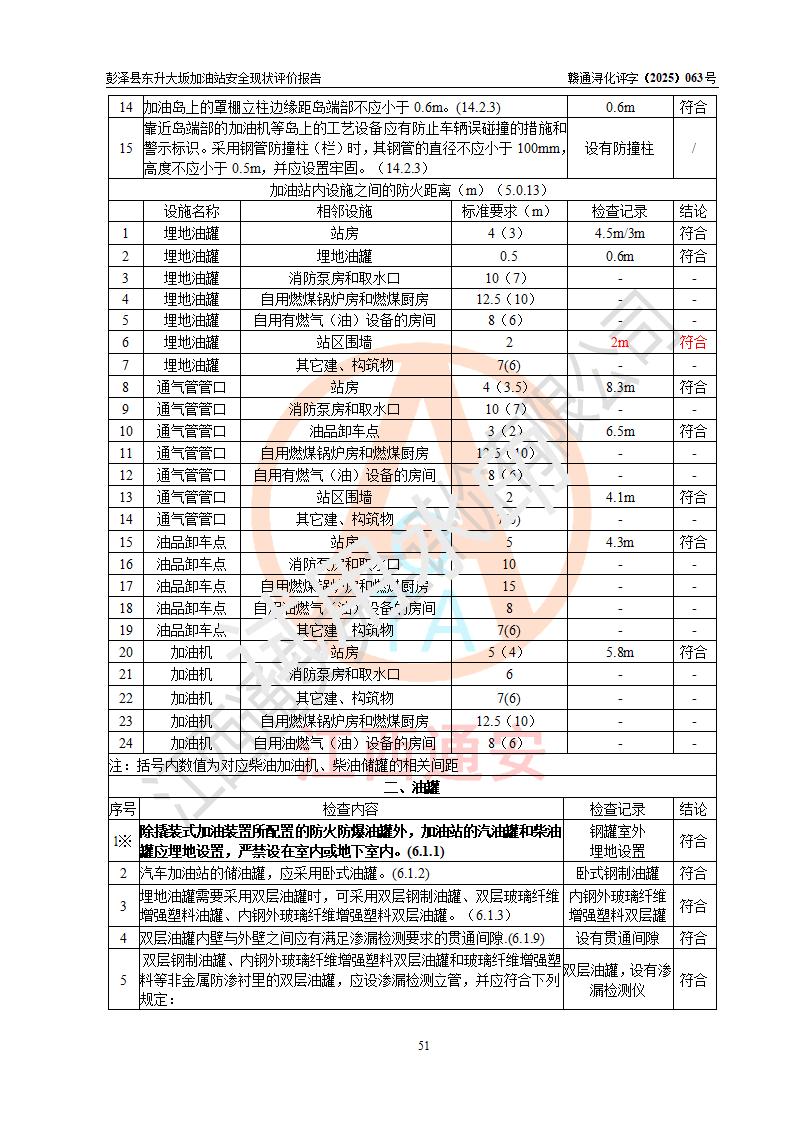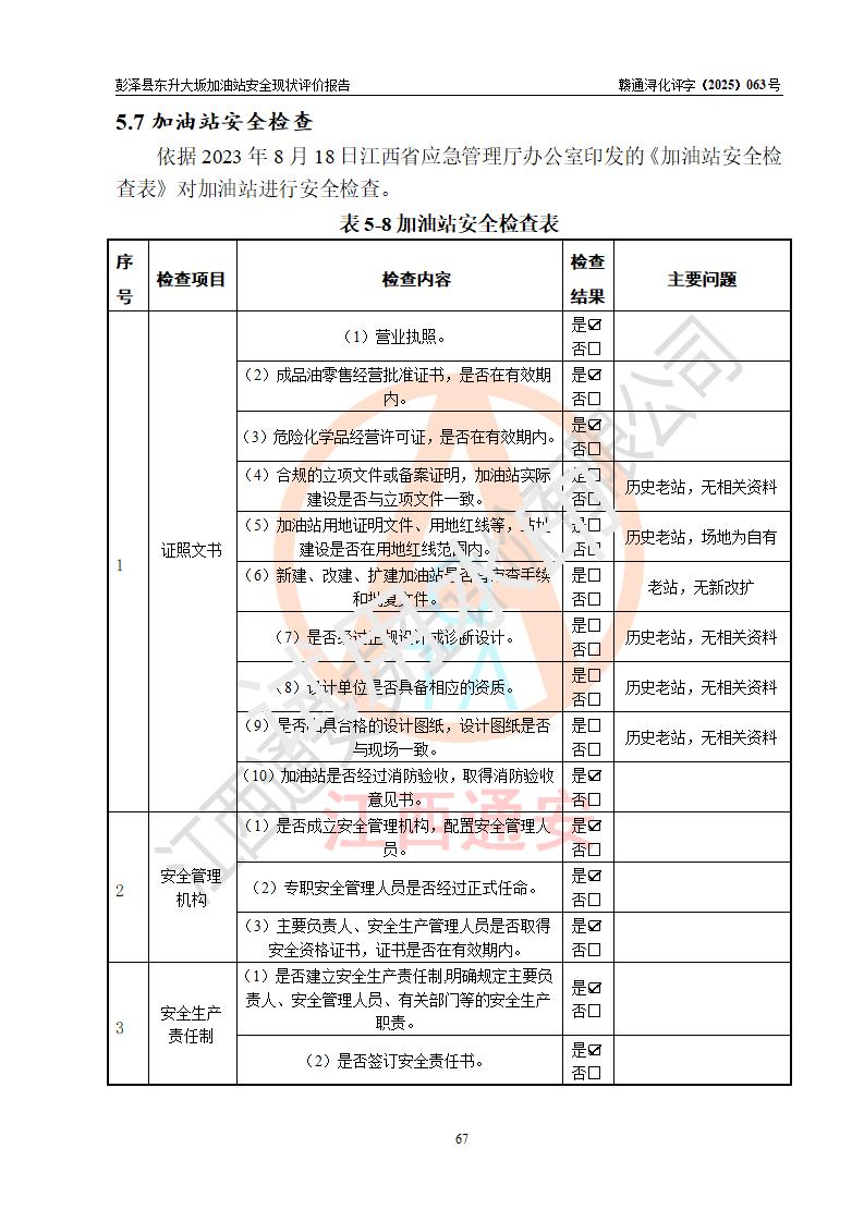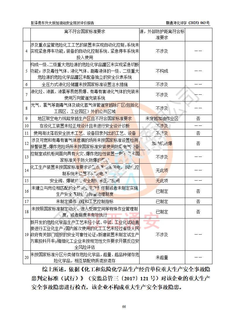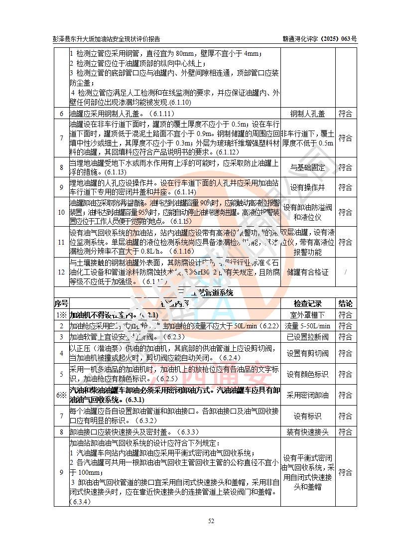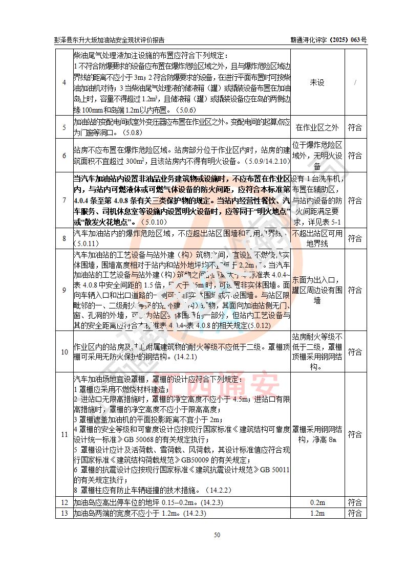 評(píng)價(jià)結(jié)論 | 彭澤縣東升大坂加油站涉及的安全條件、安全經(jīng)營(yíng)條件、安全生產(chǎn)管理符合《危險(xiǎn)化學(xué)品經(jīng)營(yíng)許可證管理辦法》、《汽車(chē)加油加氣加氫站技術(shù)標(biāo)準(zhǔn)》等**有關(guān)法規(guī)、標(biāo)準(zhǔn)、規(guī)范要求,能滿(mǎn)足危險(xiǎn)化學(xué)品經(jīng)營(yíng)安全條件。 | |||