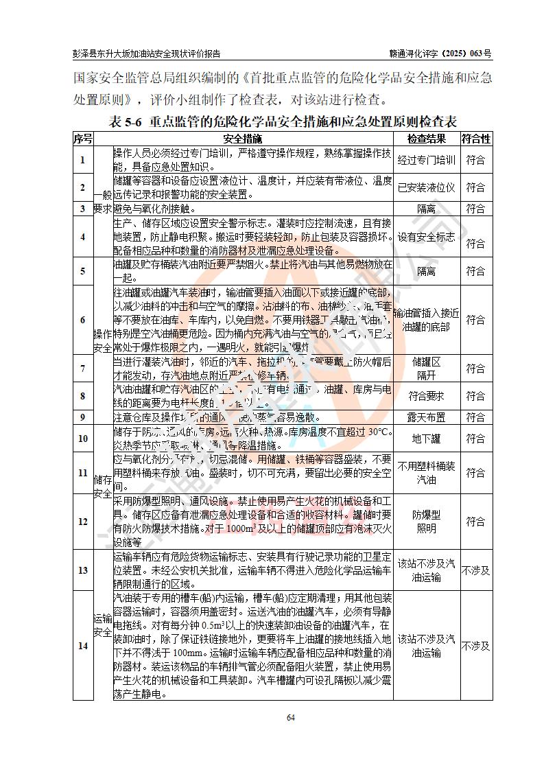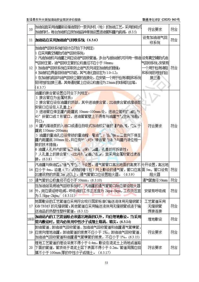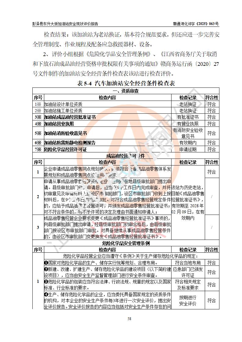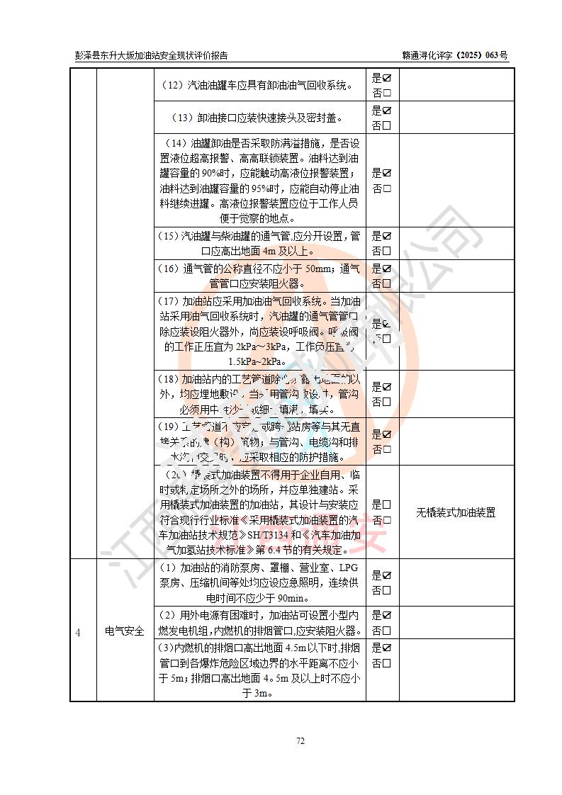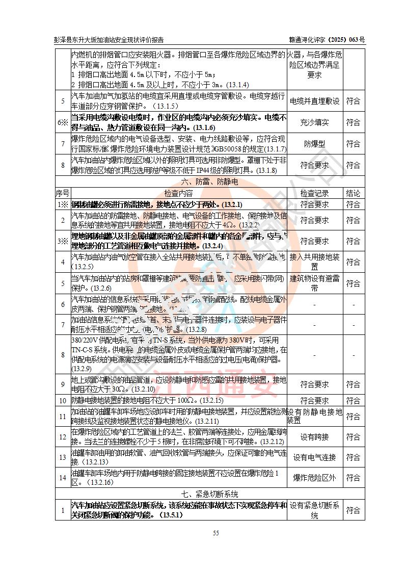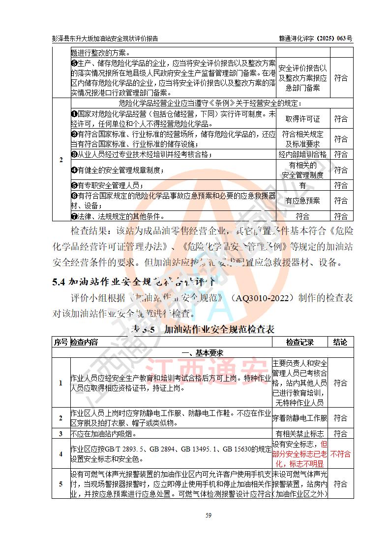 評(píng)價(jià)結(jié)論 | 彭澤縣東升大坂加油站涉及的安全條件、安全經(jīng)營(yíng)條件、安全生產(chǎn)管理符合《危險(xiǎn)化學(xué)品經(jīng)營(yíng)許可證管理辦法》、《汽車(chē)加油加氣加氫站技術(shù)標(biāo)準(zhǔn)》等**有關(guān)法規(guī)、標(biāo)準(zhǔn)、規(guī)范要求,能滿(mǎn)足危險(xiǎn)化學(xué)品經(jīng)營(yíng)安全條件。 | |||