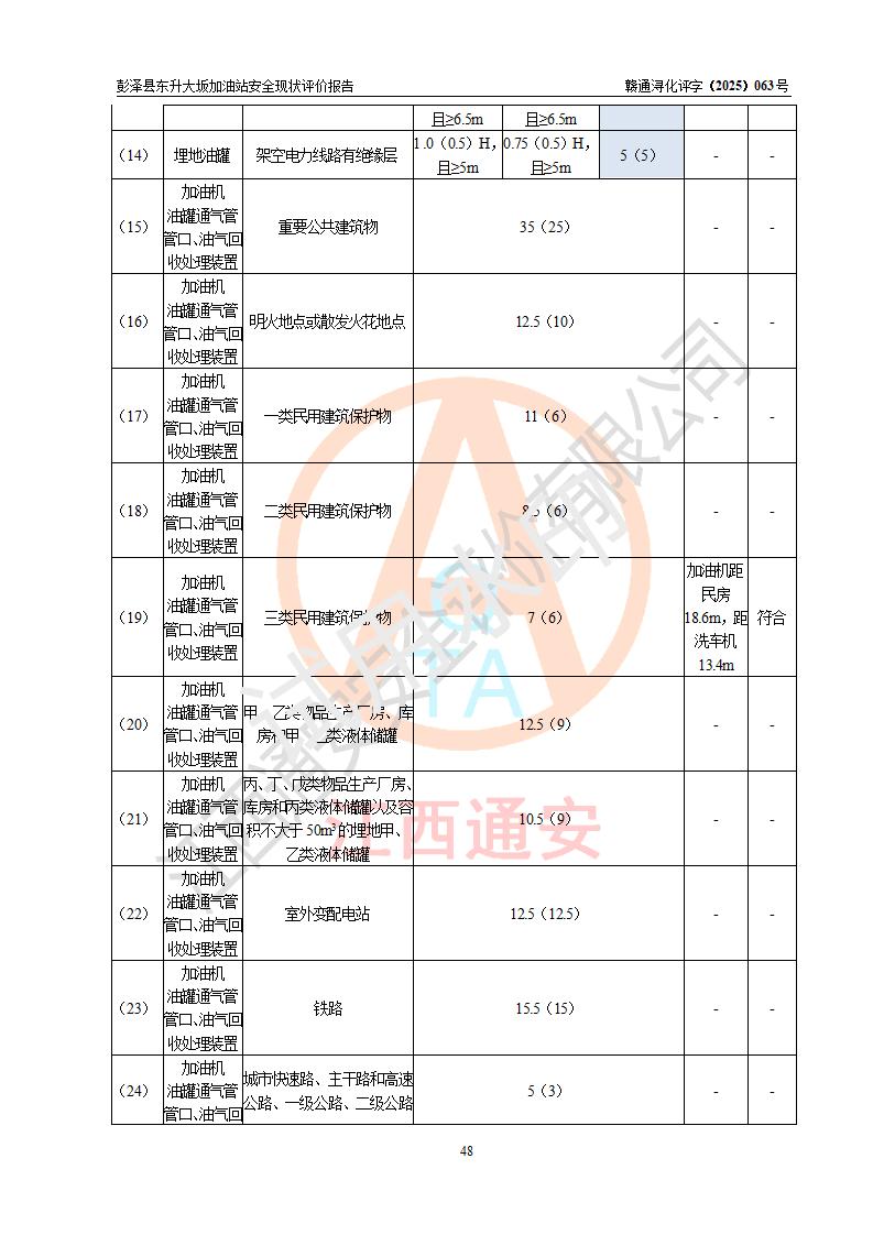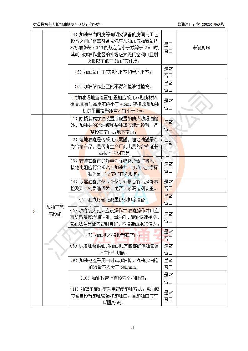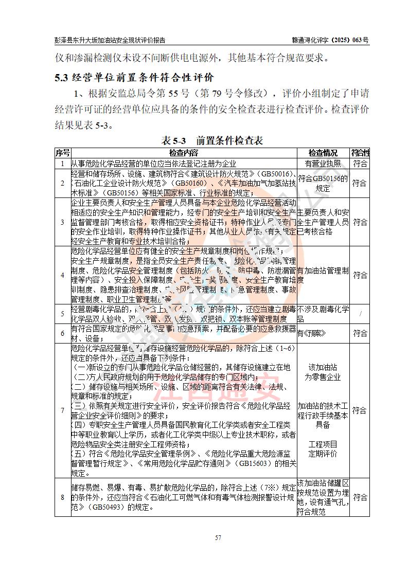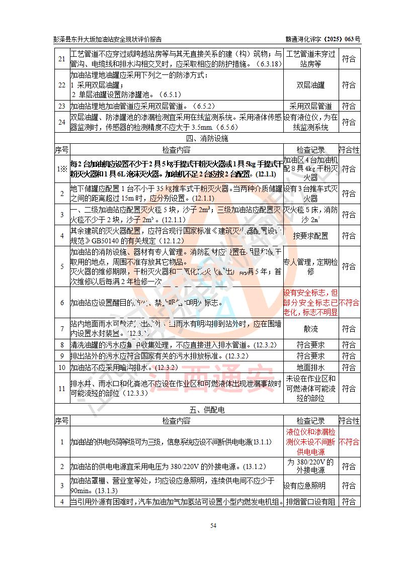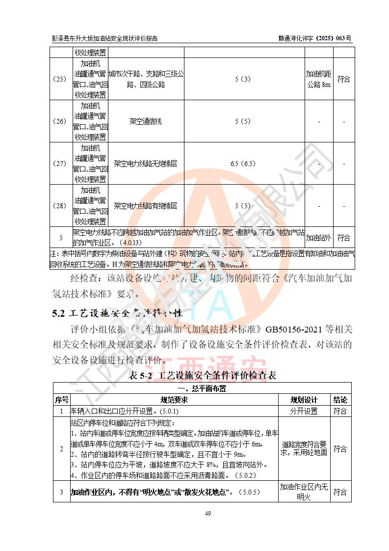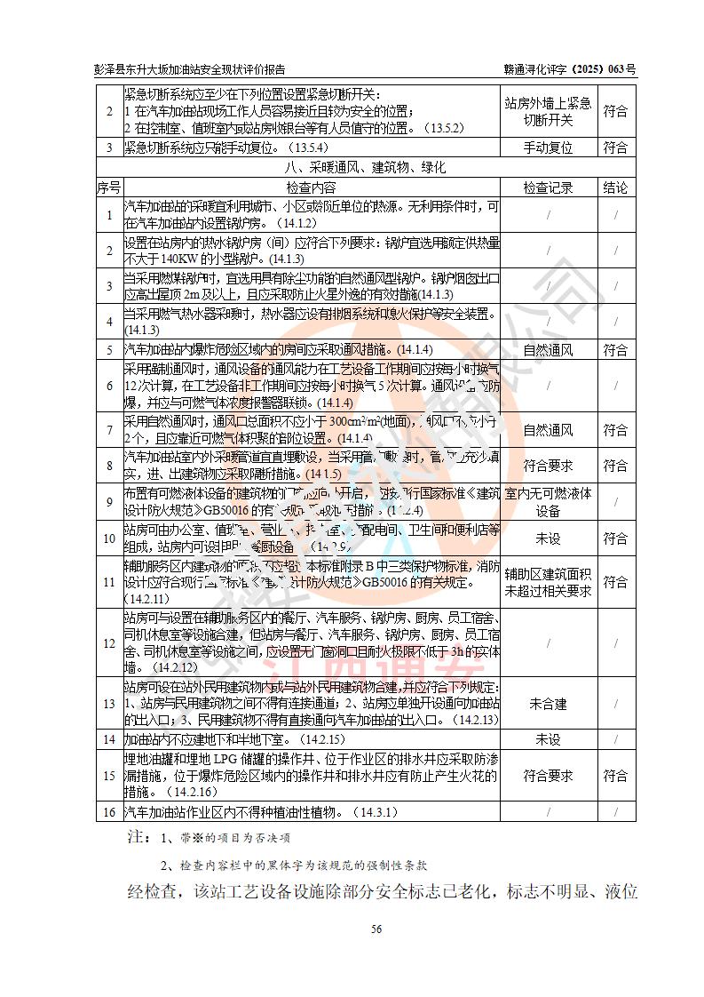 評(píng)價(jià)結(jié)論 | 彭澤縣東升大坂加油站涉及的安全條件、安全經(jīng)營(yíng)條件、安全生產(chǎn)管理符合《危險(xiǎn)化學(xué)品經(jīng)營(yíng)許可證管理辦法》、《汽車(chē)加油加氣加氫站技術(shù)標(biāo)準(zhǔn)》等**有關(guān)法規(guī)、標(biāo)準(zhǔn)、規(guī)范要求,能滿(mǎn)足危險(xiǎn)化學(xué)品經(jīng)營(yíng)安全條件。 | |||