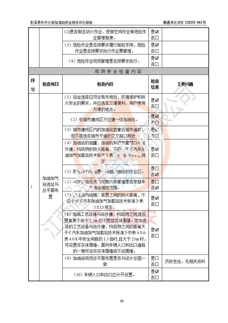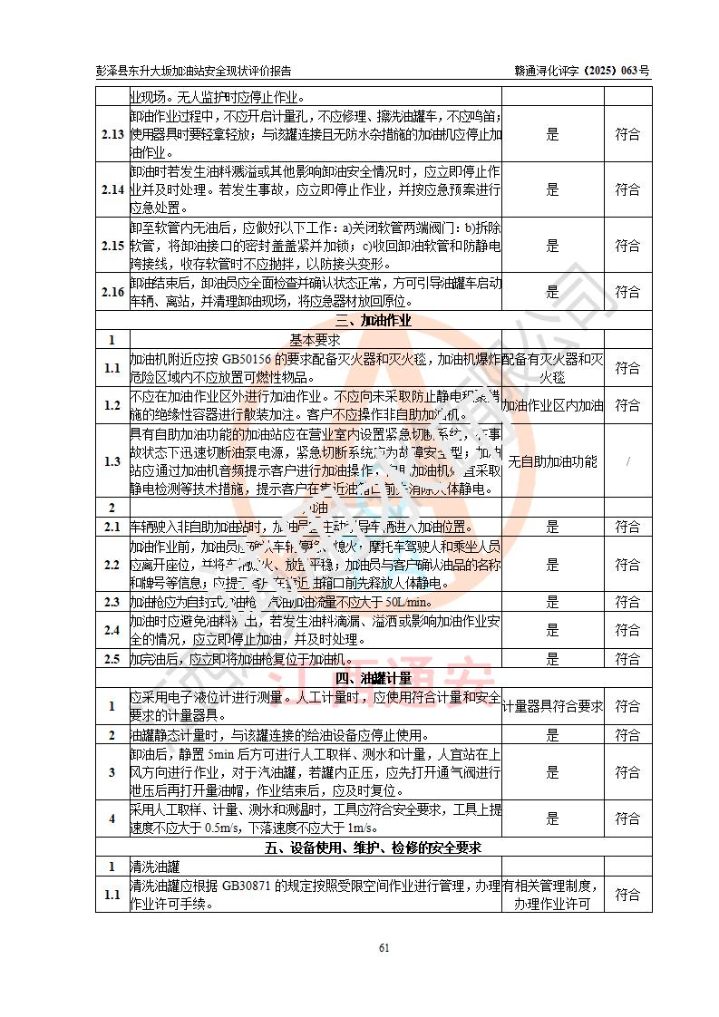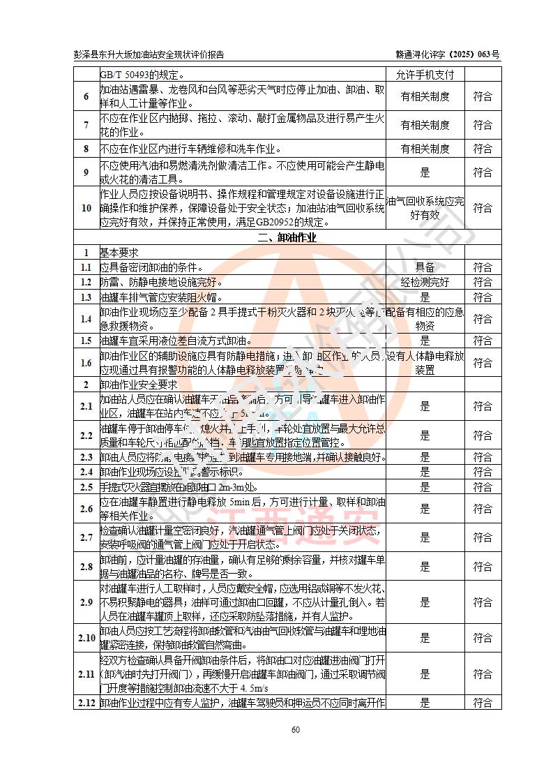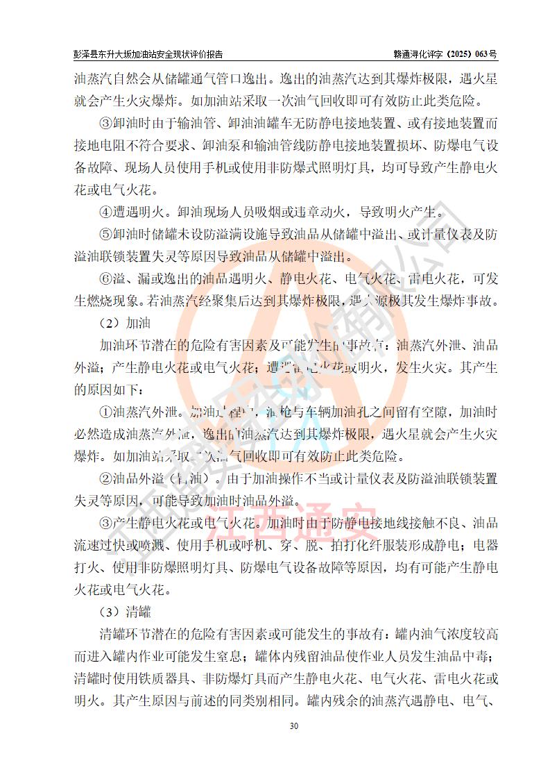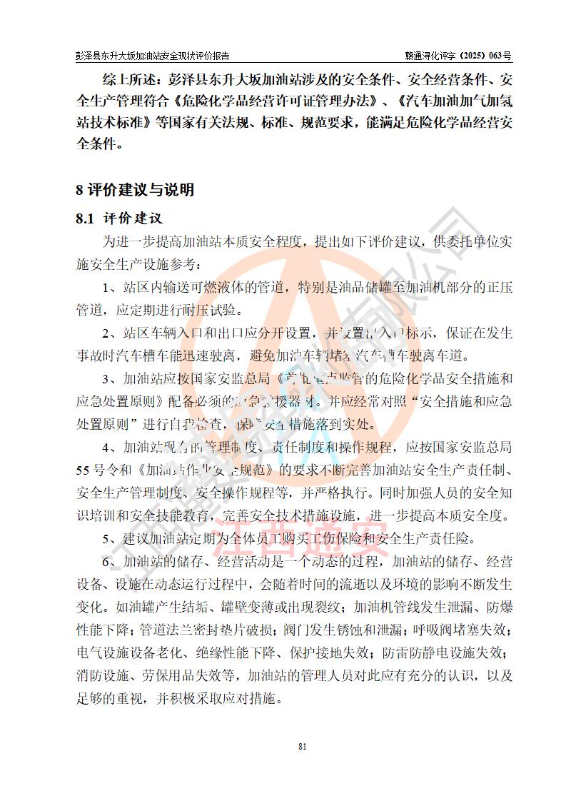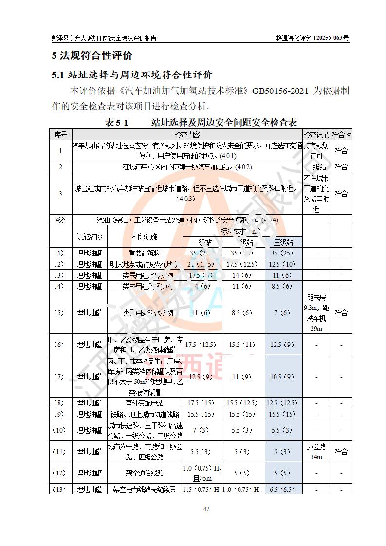 評(píng)價(jià)結(jié)論 | 彭澤縣東升大坂加油站涉及的安全條件、安全經(jīng)營(yíng)條件、安全生產(chǎn)管理符合《危險(xiǎn)化學(xué)品經(jīng)營(yíng)許可證管理辦法》、《汽車(chē)加油加氣加氫站技術(shù)標(biāo)準(zhǔn)》等**有關(guān)法規(guī)、標(biāo)準(zhǔn)、規(guī)范要求,能滿(mǎn)足危險(xiǎn)化學(xué)品經(jīng)營(yíng)安全條件。 | |||