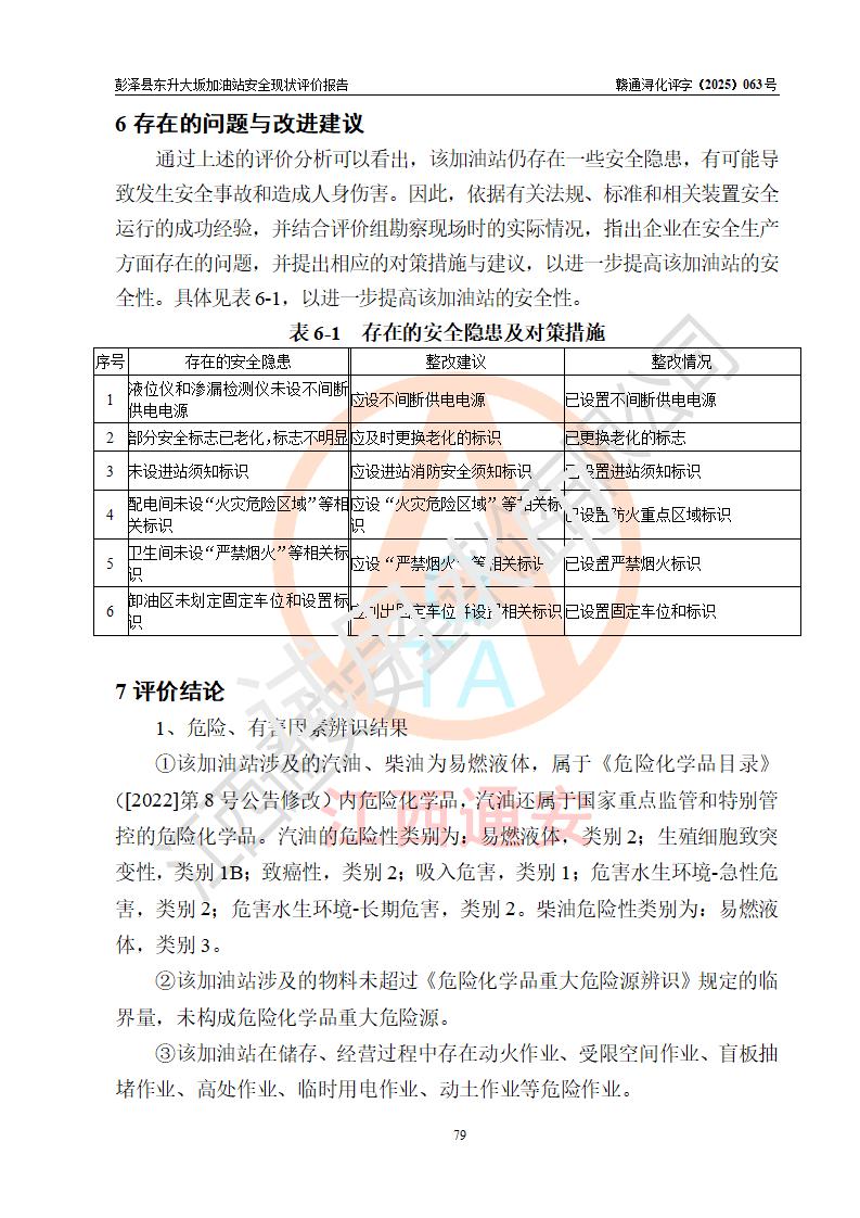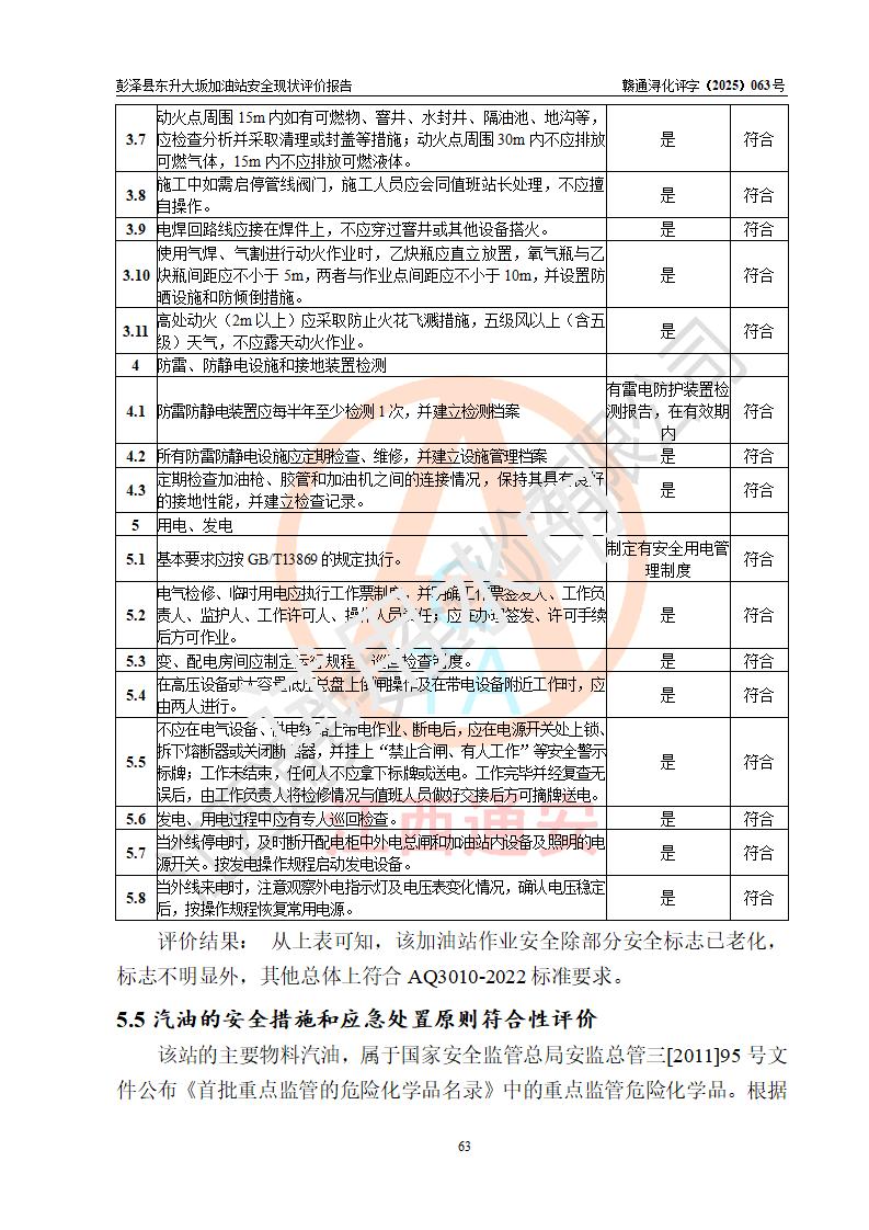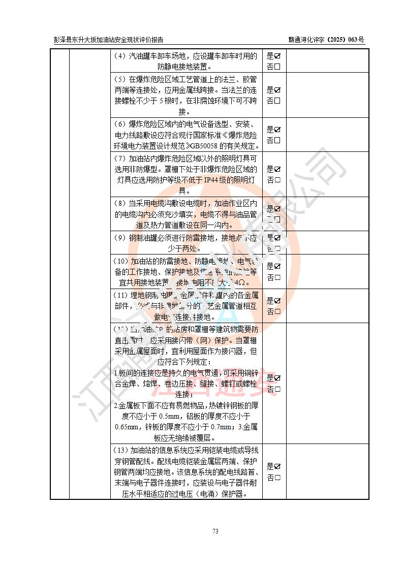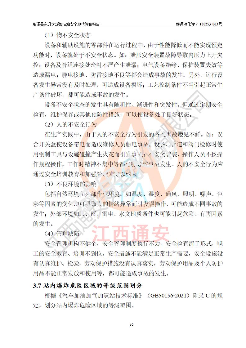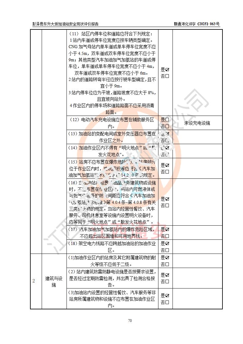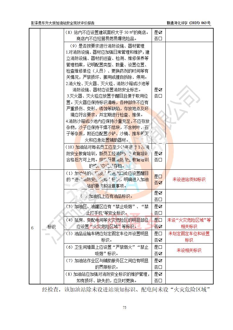 評(píng)價(jià)結(jié)論 | 彭澤縣東升大坂加油站涉及的安全條件、安全經(jīng)營(yíng)條件、安全生產(chǎn)管理符合《危險(xiǎn)化學(xué)品經(jīng)營(yíng)許可證管理辦法》、《汽車(chē)加油加氣加氫站技術(shù)標(biāo)準(zhǔn)》等**有關(guān)法規(guī)、標(biāo)準(zhǔn)、規(guī)范要求,能滿(mǎn)足危險(xiǎn)化學(xué)品經(jīng)營(yíng)安全條件。 | |||