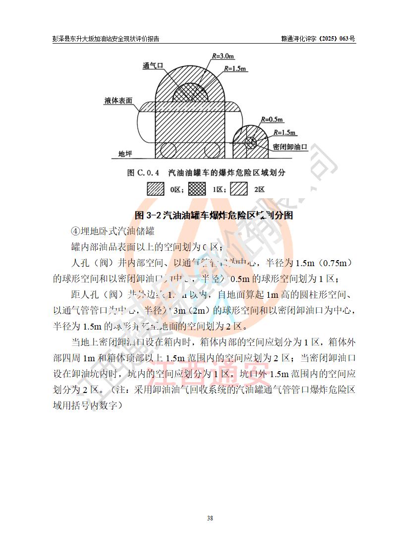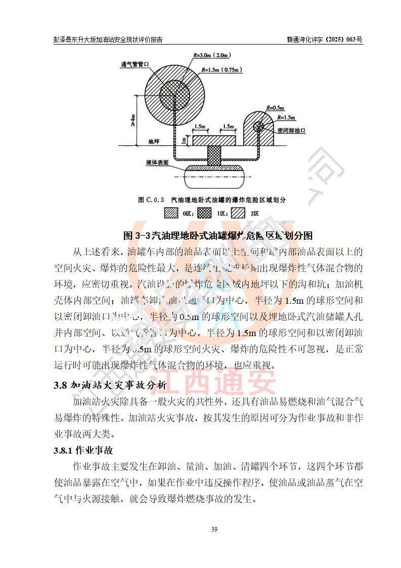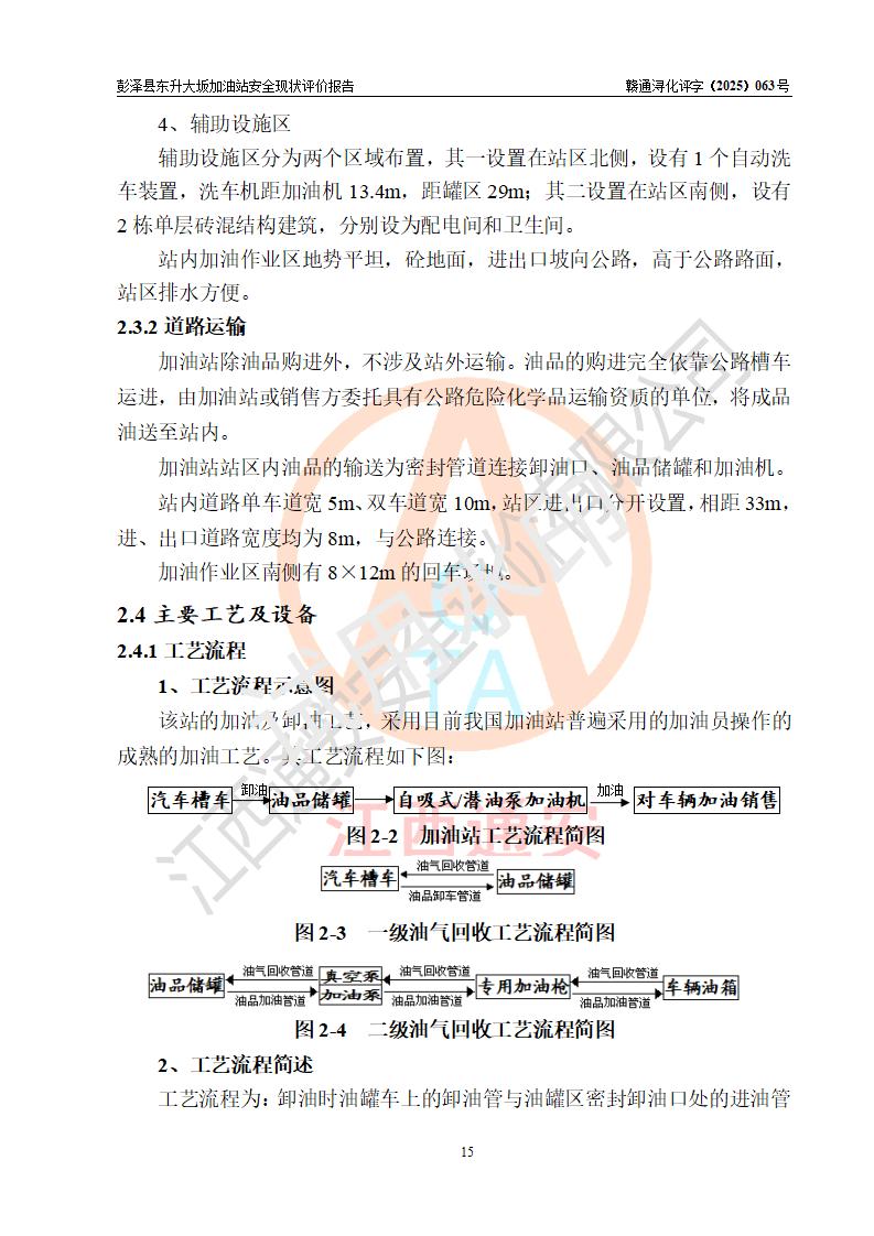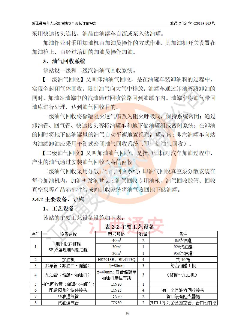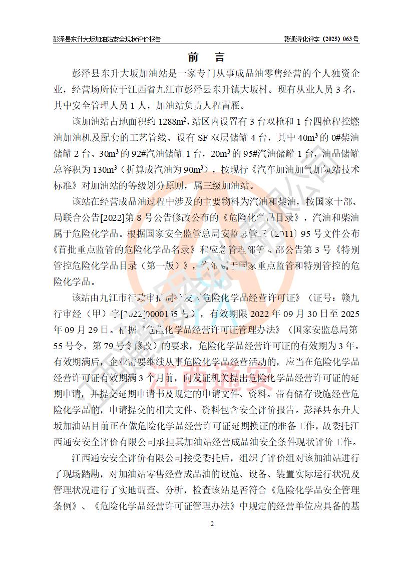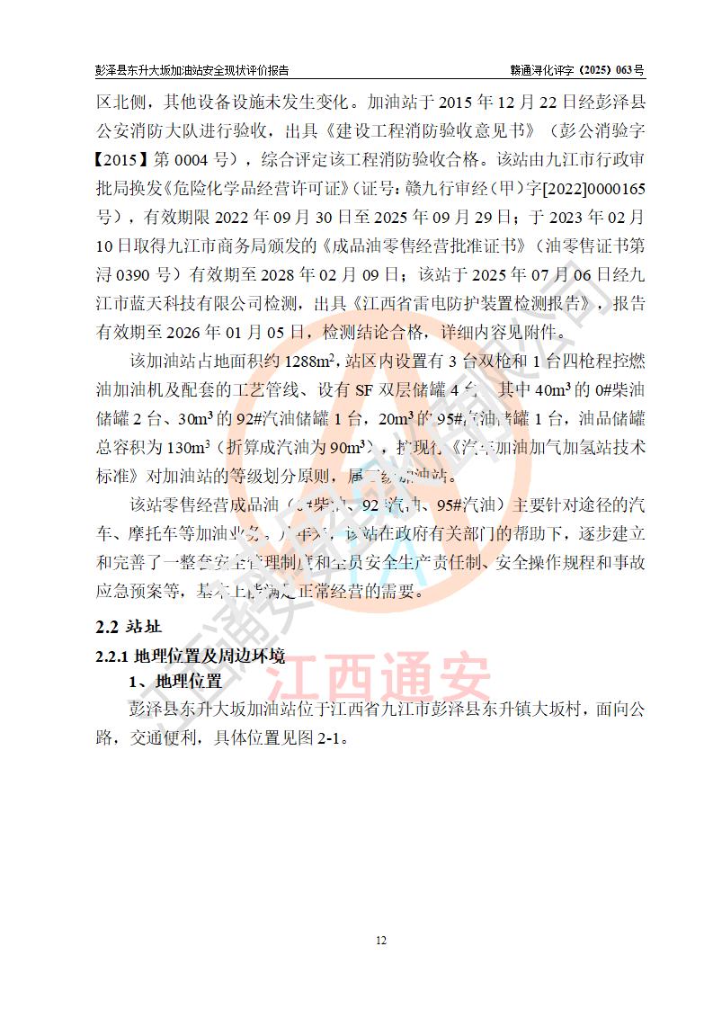 項(xiàng)目簡(jiǎn)介 | 彭澤縣東升大坂加油站是一家專(zhuān)門(mén)從事成品油零售經(jīng)營(yíng)的個(gè)人獨(dú)資企業(yè),經(jīng)營(yíng)場(chǎng)所位于江西省九江市彭澤縣東升鎮(zhèn)大坂村?,F(xiàn)有從業(yè)人員3名,其中安全管理人員1人,加油站負(fù)責(zé)人程霄雁。 該加油站占地面積約1288m2,站區(qū)內(nèi)設(shè)置有3臺(tái)雙槍和1臺(tái)四槍程控燃油加油機(jī)及配套的工藝管線(xiàn)、設(shè)有SF雙層儲(chǔ)罐4臺(tái),其中40m3的0#柴油儲(chǔ)罐2臺(tái)、30m3的92#汽油儲(chǔ)罐1臺(tái),20m3的95#汽油儲(chǔ)罐1臺(tái),油品儲(chǔ)罐總?cè)莘e為130m3(折算成汽油為90m3),按現(xiàn)行《汽車(chē)加油加氣加氫站技術(shù)標(biāo)準(zhǔn)》對(duì)加油站的等級(jí)劃分原則,屬三級(jí)加油站。 該站由九江市行政審批局換發(fā)《危險(xiǎn)化學(xué)品經(jīng)營(yíng)許可證》(證號(hào):贛九行審經(jīng)(甲)字[2022]0000165號(hào)),**期限2022年09月30日至2025年09月29日。 | |||