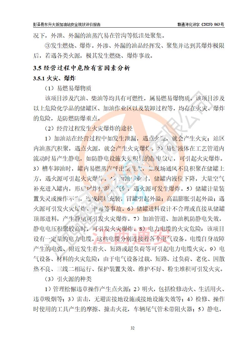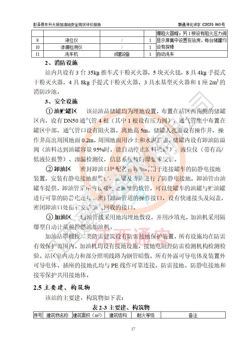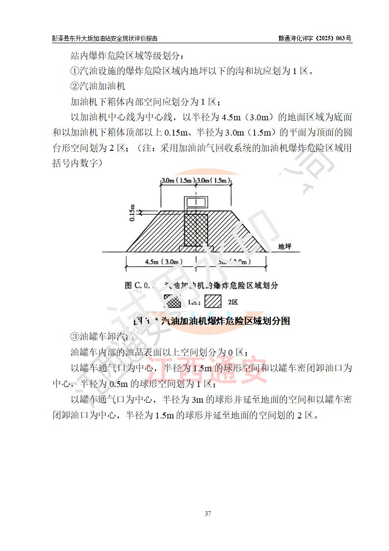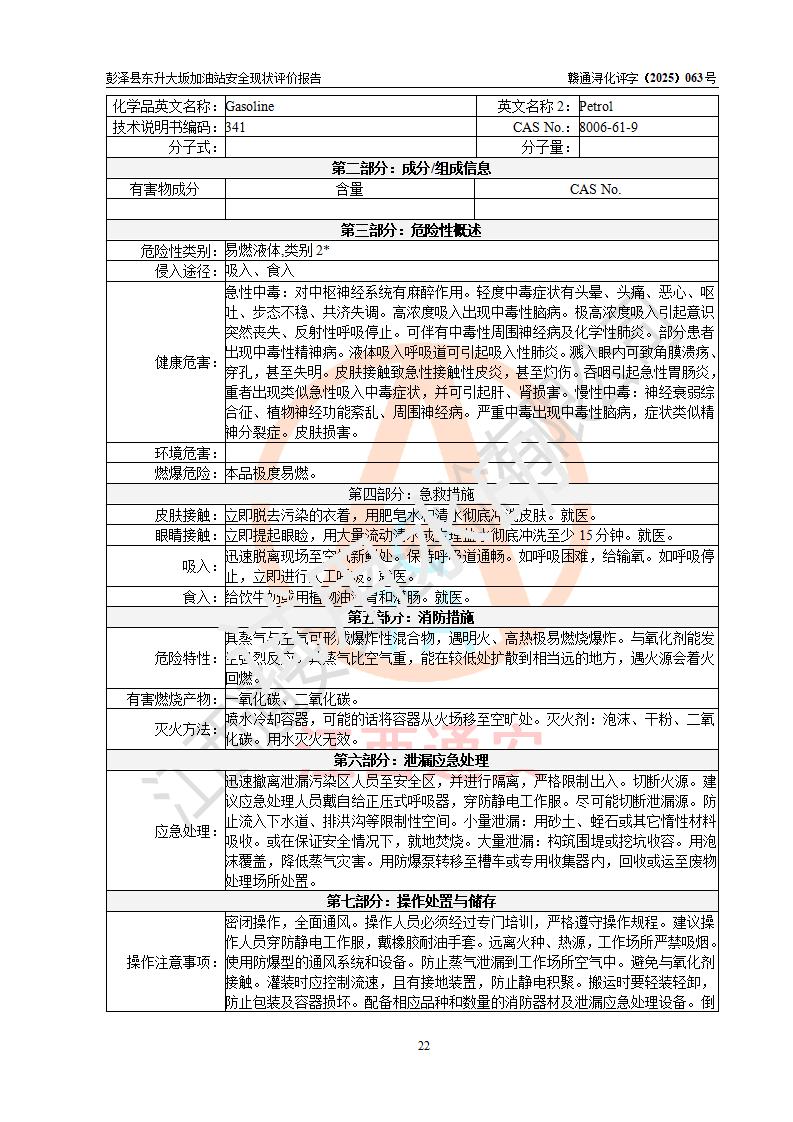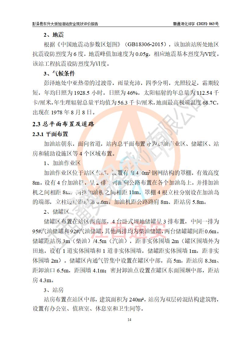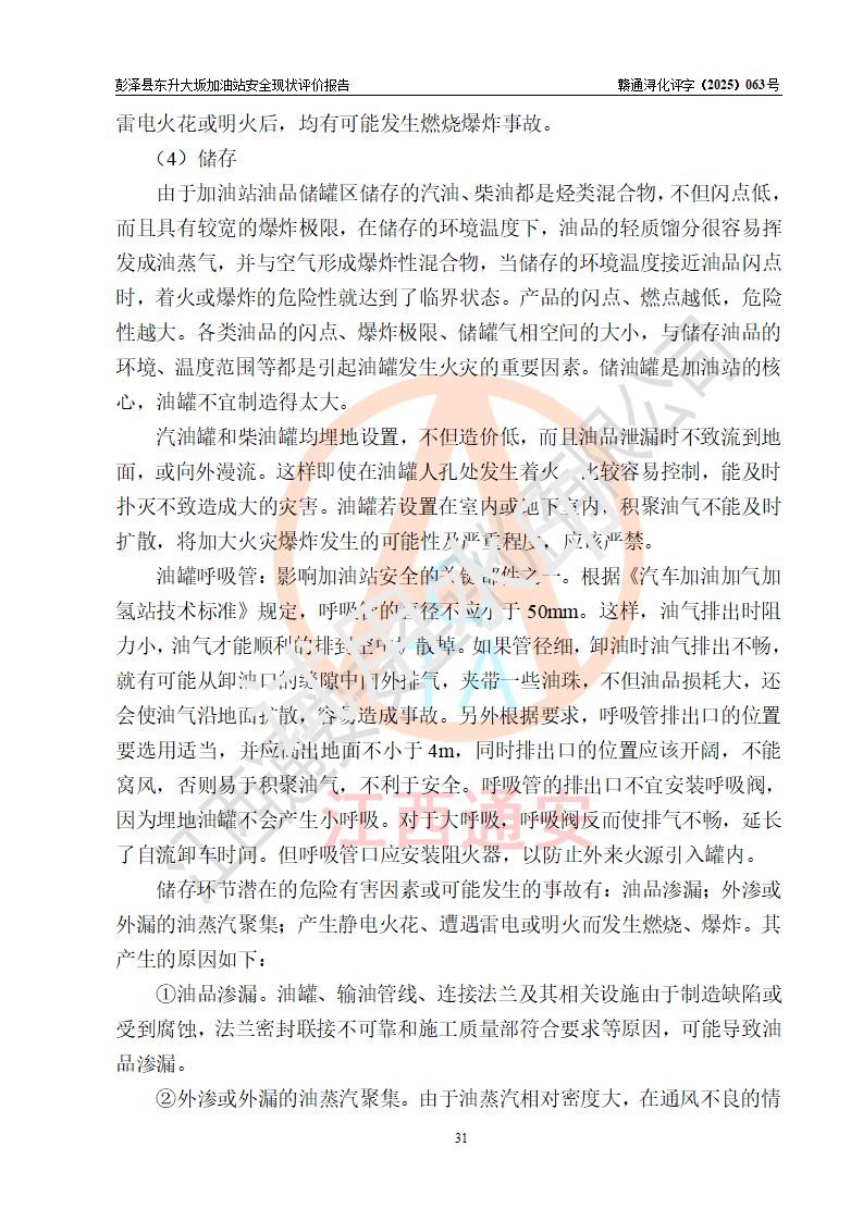 項(xiàng)目簡(jiǎn)介 | 彭澤縣東升大坂加油站是一家專(zhuān)門(mén)從事成品油零售經(jīng)營(yíng)的個(gè)人獨(dú)資企業(yè),經(jīng)營(yíng)場(chǎng)所位于江西省九江市彭澤縣東升鎮(zhèn)大坂村?,F(xiàn)有從業(yè)人員3名,其中安全管理人員1人,加油站負(fù)責(zé)人程霄雁。 該加油站占地面積約1288m2,站區(qū)內(nèi)設(shè)置有3臺(tái)雙槍和1臺(tái)四槍程控燃油加油機(jī)及配套的工藝管線(xiàn)、設(shè)有SF雙層儲(chǔ)罐4臺(tái),其中40m3的0#柴油儲(chǔ)罐2臺(tái)、30m3的92#汽油儲(chǔ)罐1臺(tái),20m3的95#汽油儲(chǔ)罐1臺(tái),油品儲(chǔ)罐總?cè)莘e為130m3(折算成汽油為90m3),按現(xiàn)行《汽車(chē)加油加氣加氫站技術(shù)標(biāo)準(zhǔn)》對(duì)加油站的等級(jí)劃分原則,屬三級(jí)加油站。 該站由九江市行政審批局換發(fā)《危險(xiǎn)化學(xué)品經(jīng)營(yíng)許可證》(證號(hào):贛九行審經(jīng)(甲)字[2022]0000165號(hào)),**期限2022年09月30日至2025年09月29日。 | |||