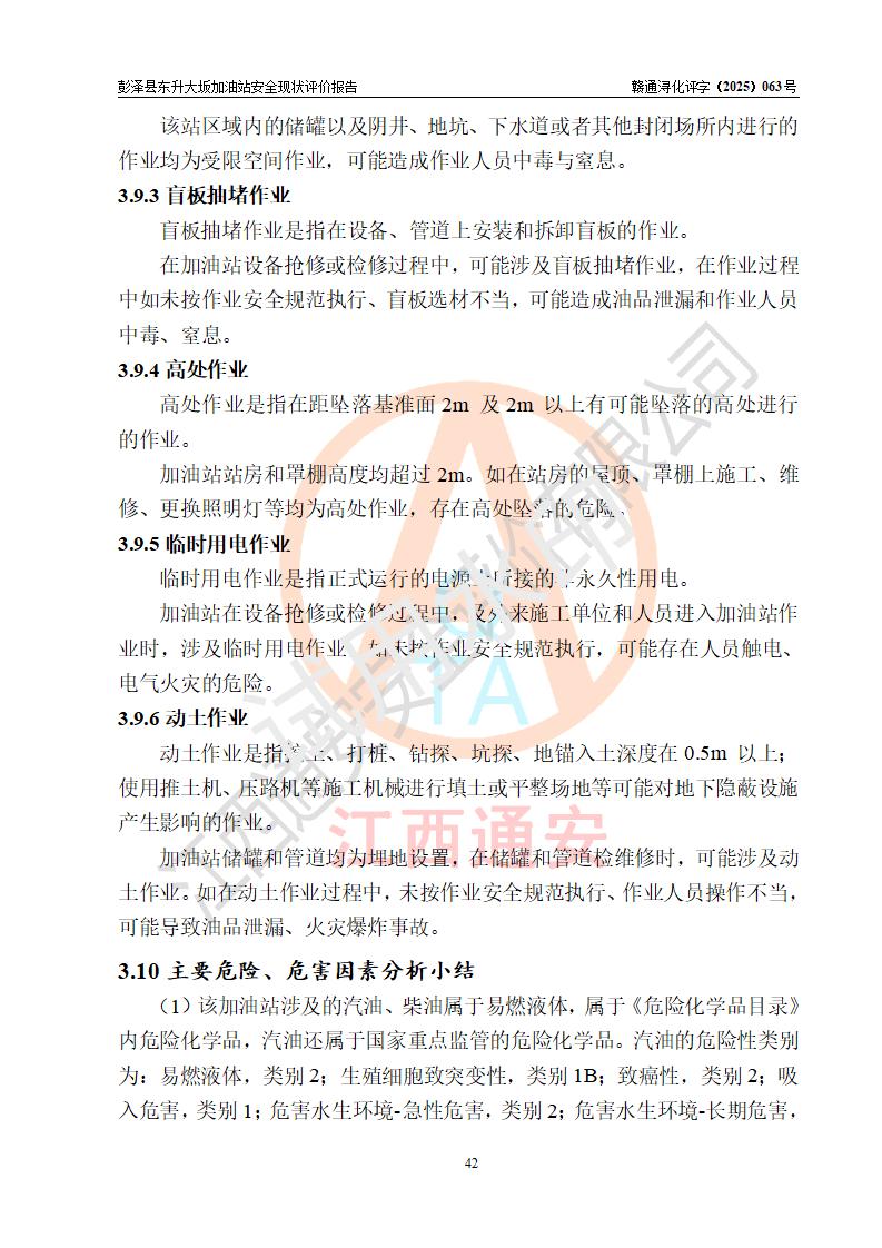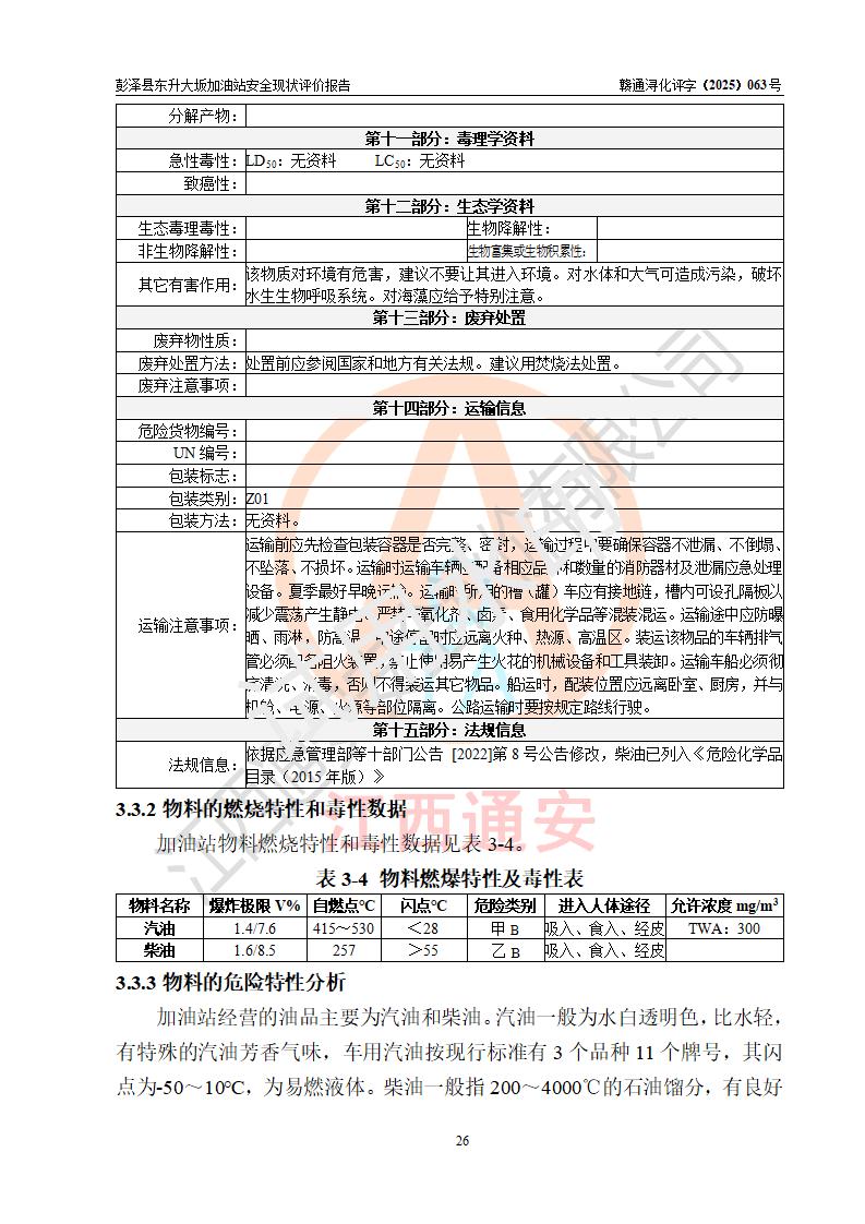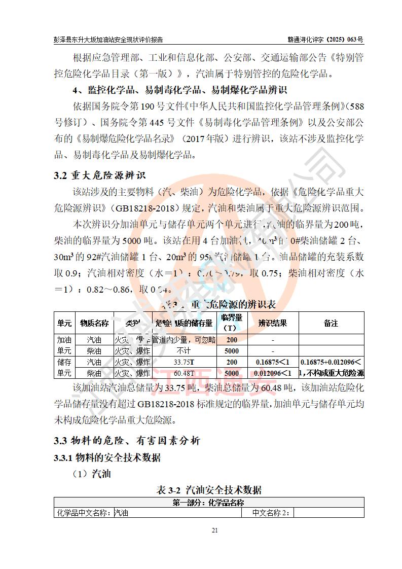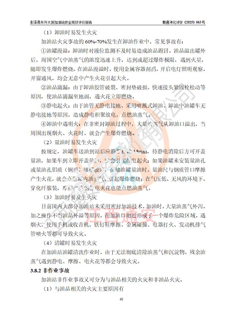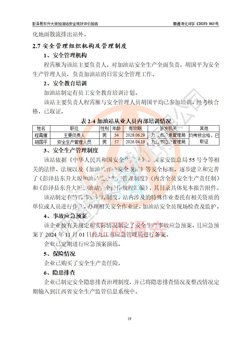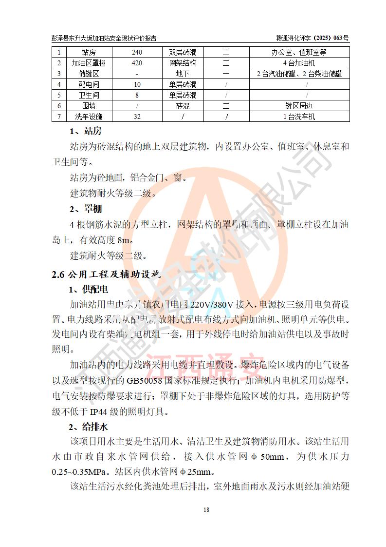 項(xiàng)目簡(jiǎn)介 | 彭澤縣東升大坂加油站是一家專(zhuān)門(mén)從事成品油零售經(jīng)營(yíng)的個(gè)人獨(dú)資企業(yè),經(jīng)營(yíng)場(chǎng)所位于江西省九江市彭澤縣東升鎮(zhèn)大坂村?,F(xiàn)有從業(yè)人員3名,其中安全管理人員1人,加油站負(fù)責(zé)人程霄雁。 該加油站占地面積約1288m2,站區(qū)內(nèi)設(shè)置有3臺(tái)雙槍和1臺(tái)四槍程控燃油加油機(jī)及配套的工藝管線(xiàn)、設(shè)有SF雙層儲(chǔ)罐4臺(tái),其中40m3的0#柴油儲(chǔ)罐2臺(tái)、30m3的92#汽油儲(chǔ)罐1臺(tái),20m3的95#汽油儲(chǔ)罐1臺(tái),油品儲(chǔ)罐總?cè)莘e為130m3(折算成汽油為90m3),按現(xiàn)行《汽車(chē)加油加氣加氫站技術(shù)標(biāo)準(zhǔn)》對(duì)加油站的等級(jí)劃分原則,屬三級(jí)加油站。 該站由九江市行政審批局換發(fā)《危險(xiǎn)化學(xué)品經(jīng)營(yíng)許可證》(證號(hào):贛九行審經(jīng)(甲)字[2022]0000165號(hào)),**期限2022年09月30日至2025年09月29日。 | |||