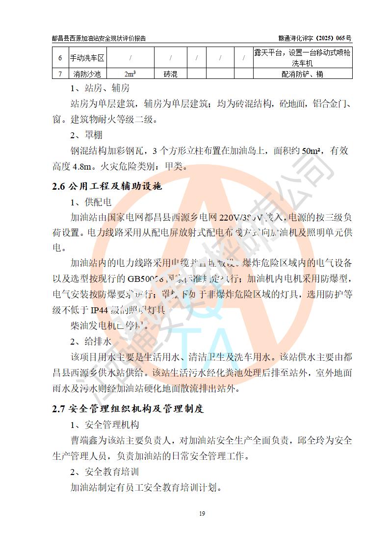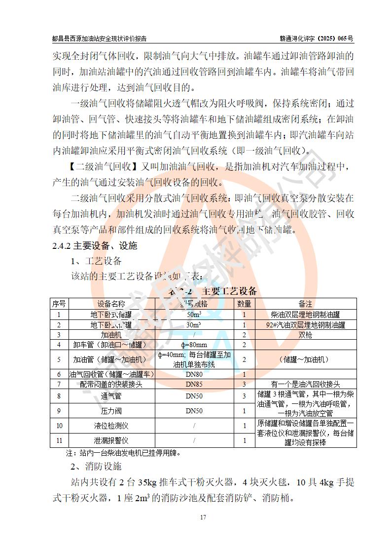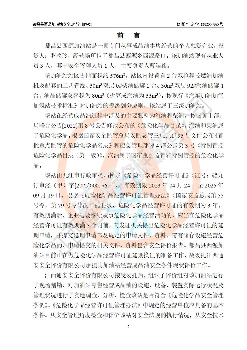 項(xiàng)目簡(jiǎn)介 | 都昌縣西源加油站是一家專門從事成品油零售經(jīng)營(yíng)的個(gè)人獨(dú)資企業(yè),投資人:羅湊玲,經(jīng)營(yíng)場(chǎng)所位于都昌縣西源鄉(xiāng)西源路口。該加油站現(xiàn)有從業(yè)人員3人,其中安全管理人員1人,主要負(fù)責(zé)人曹端鑫。 該加油站站區(qū)占地面積約576m2,站區(qū)內(nèi)設(shè)置有2臺(tái)雙槍程控燃油加油機(jī)及配套的工藝管線、50m3雙層0#柴油儲(chǔ)罐1臺(tái)、30m3雙層92#汽油儲(chǔ)罐1臺(tái),油品儲(chǔ)罐總?cè)莘e為80m3(折算成汽油為55m3)。按現(xiàn)行《汽車加油加氣加氫站技術(shù)標(biāo)準(zhǔn)》對(duì)加油站的等級(jí)劃分原則,該站屬于三級(jí)加油站。 該站由九江市行政審批局換發(fā)《危險(xiǎn)化學(xué)品經(jīng)營(yíng)許可證》(證號(hào):贛九行審經(jīng)(甲)字[2023]000036號(hào)),**期限2023年04月24日至2025年09月19日。 | |||