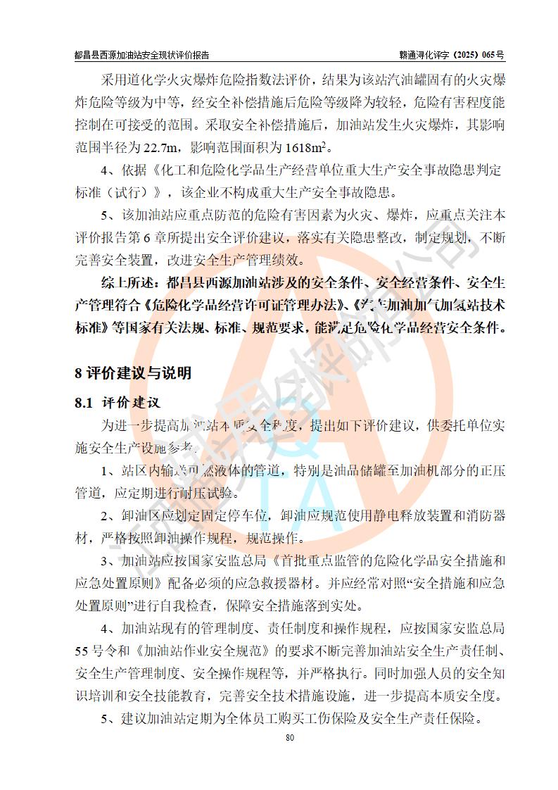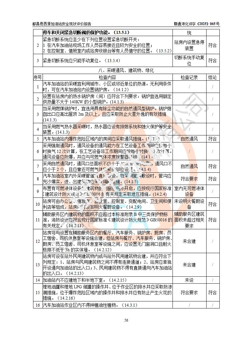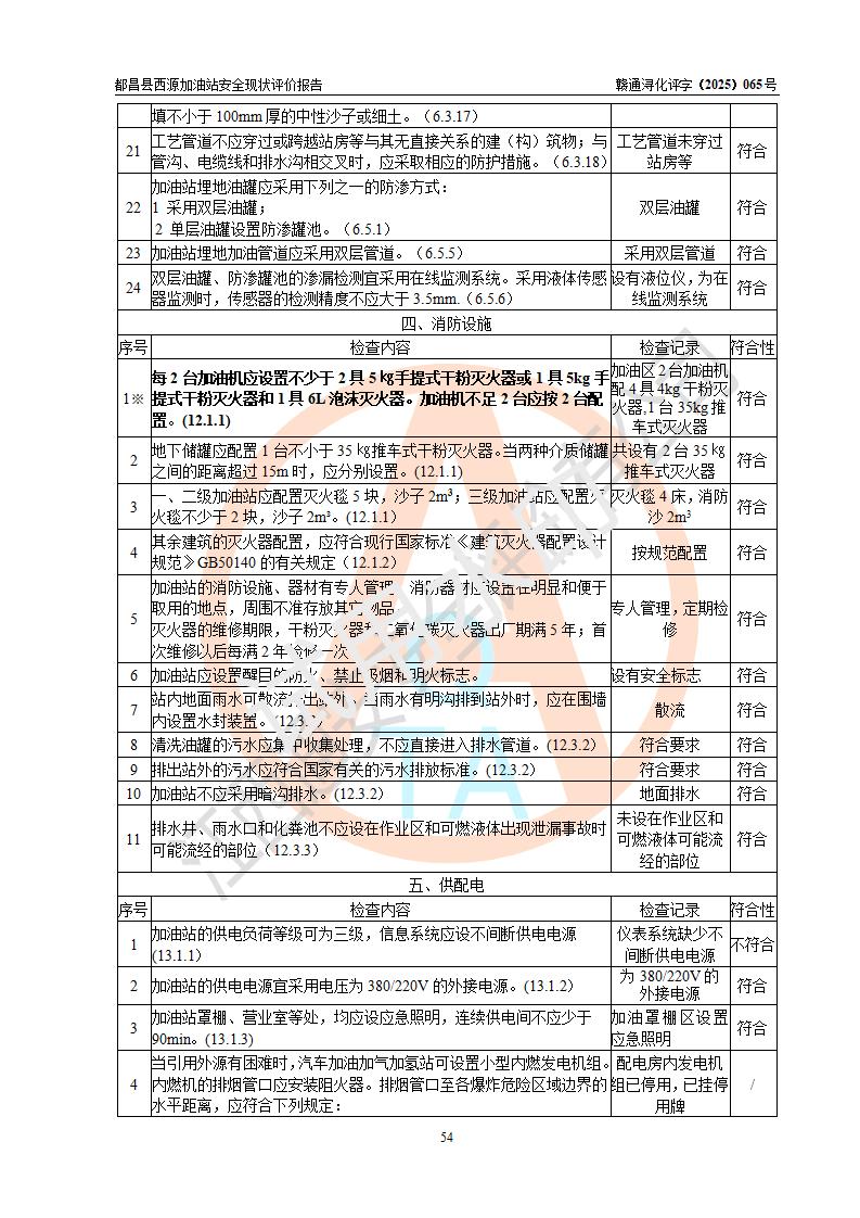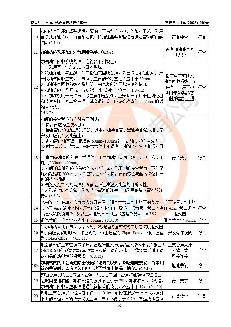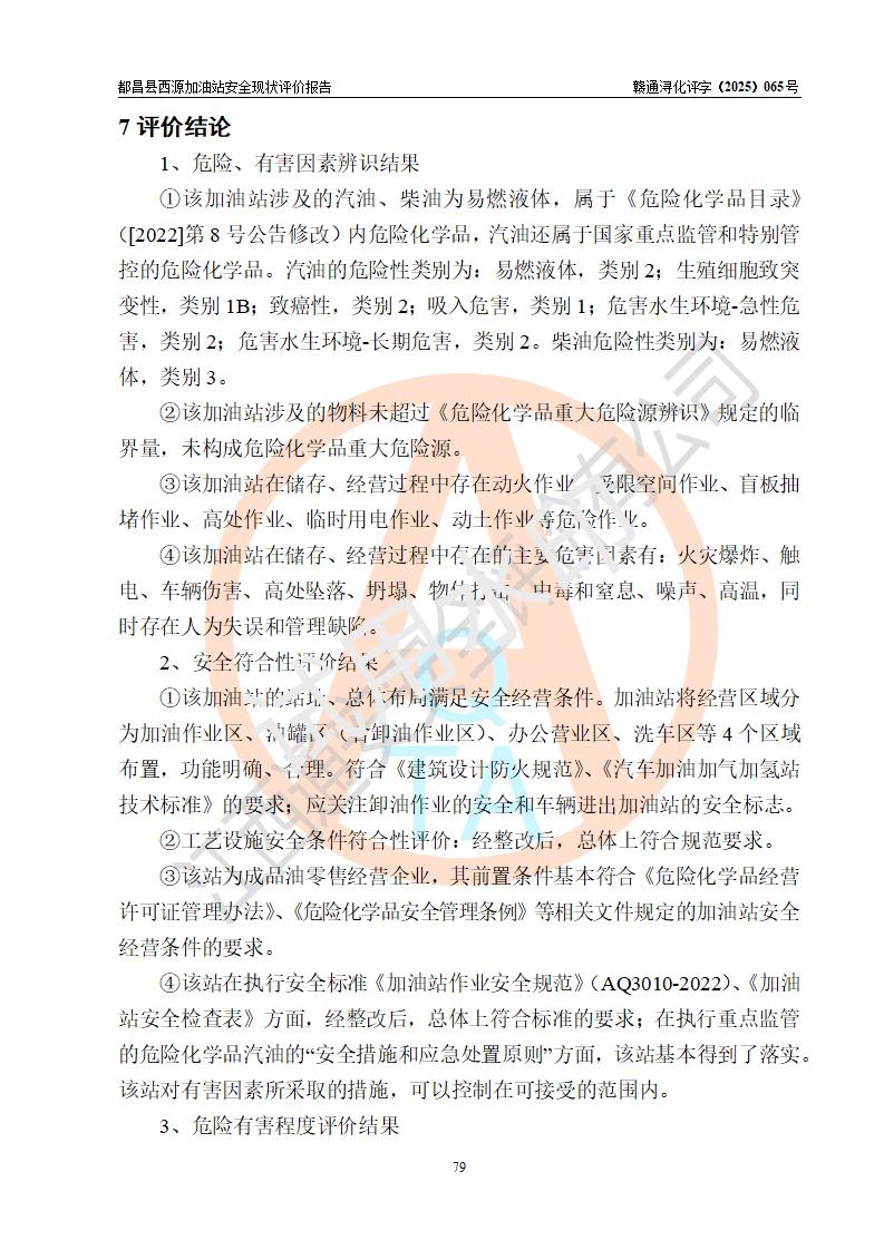 評(píng)價(jià)結(jié)論 | 都昌縣西源加油站涉及的安全條件、安全經(jīng)營(yíng)條件、安全生產(chǎn)管理符合《危險(xiǎn)化學(xué)品經(jīng)營(yíng)許可證管理辦法》、《汽車加油加氣加氫站技術(shù)標(biāo)準(zhǔn)》等**有關(guān)法規(guī)、標(biāo)準(zhǔn)、規(guī)范要求,能滿足危險(xiǎn)化學(xué)品經(jīng)營(yíng)安全條件。 | |||