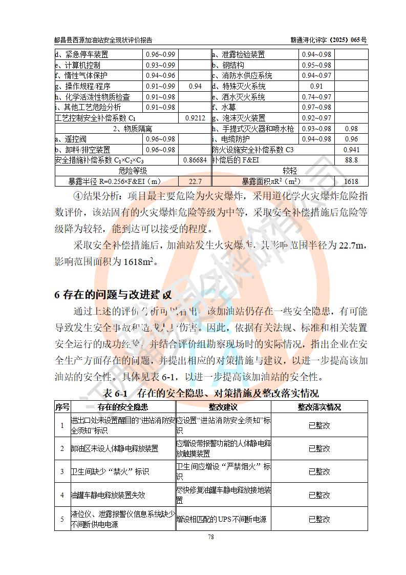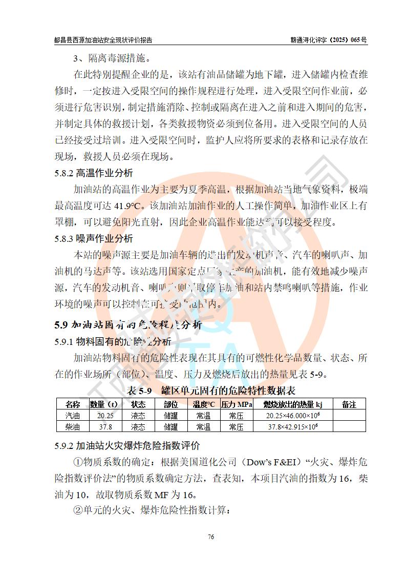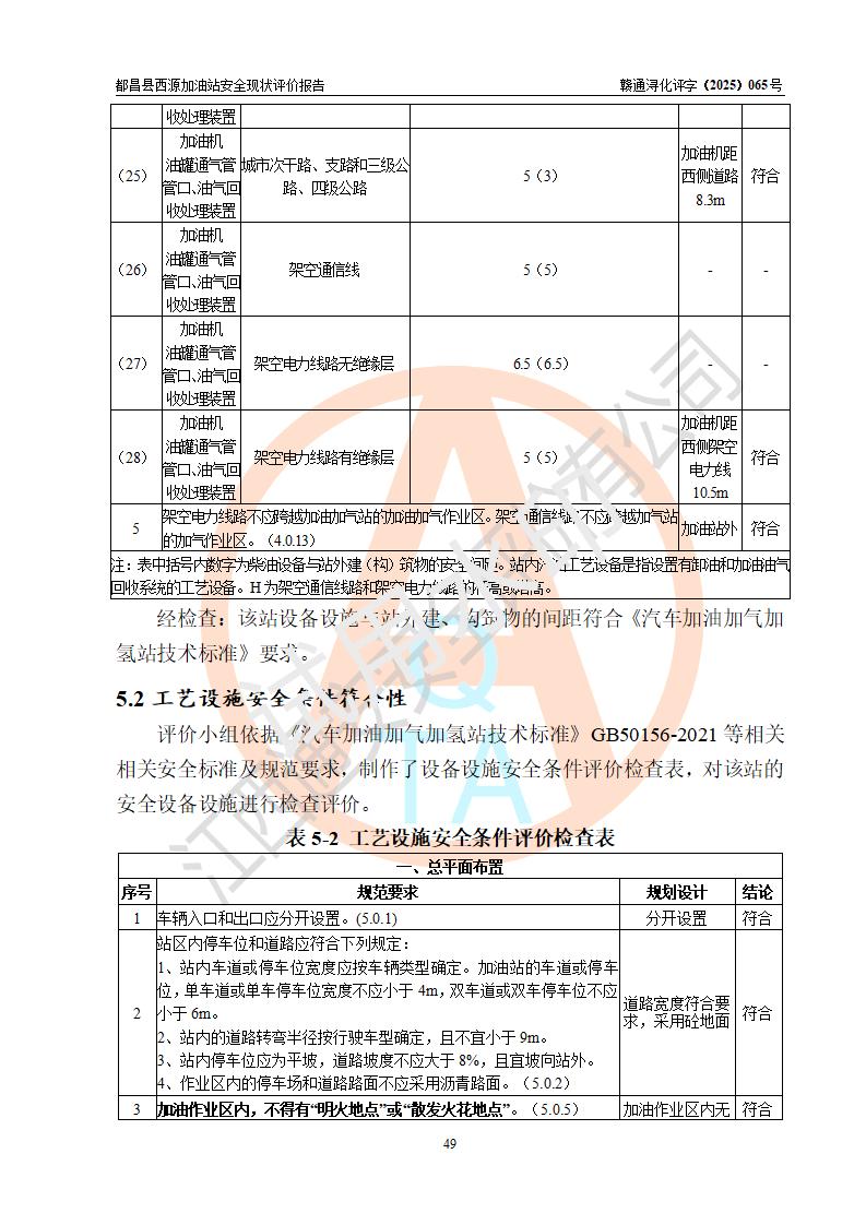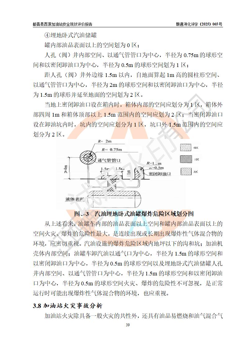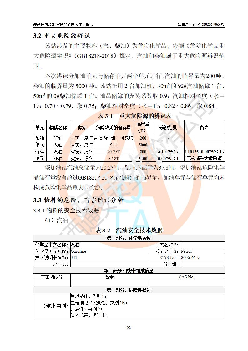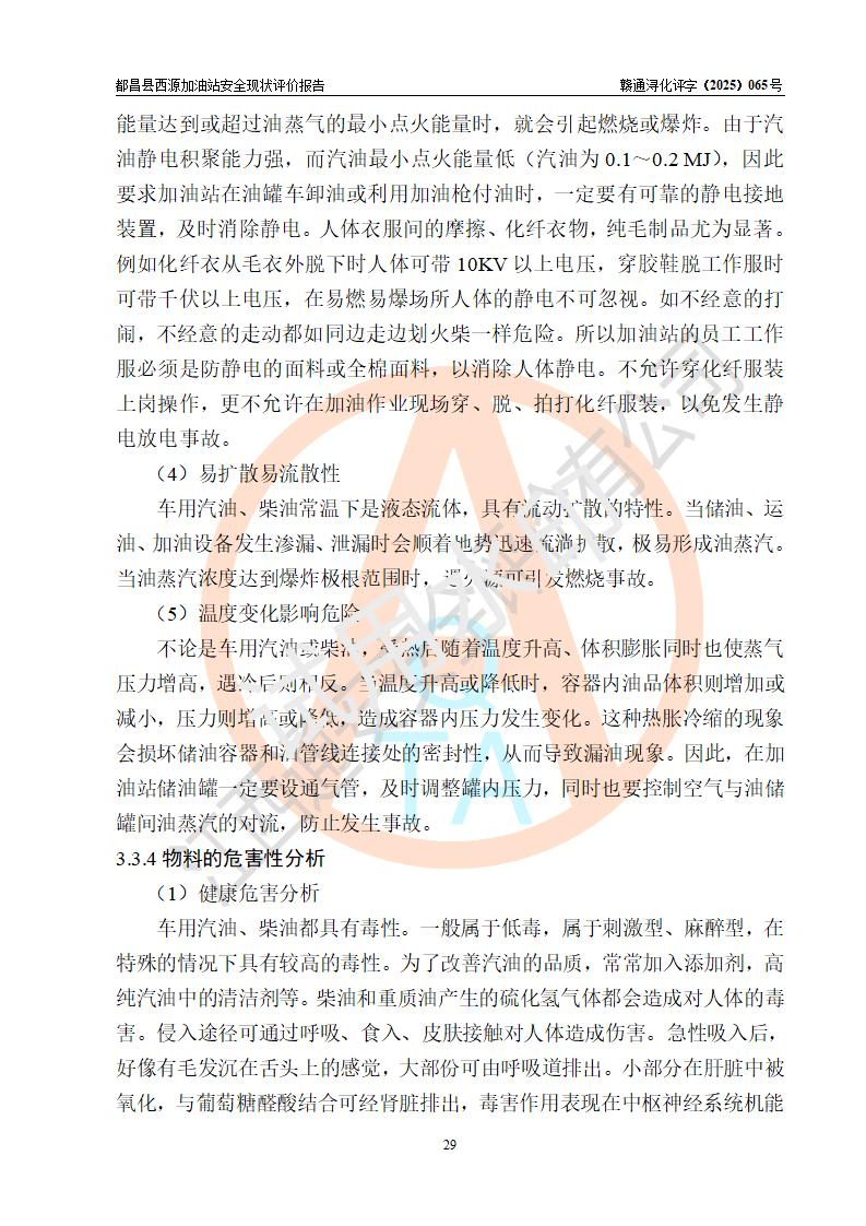評(píng)價(jià)結(jié)論 | 都昌縣西源加油站涉及的安全條件、安全經(jīng)營(yíng)條件、安全生產(chǎn)管理符合《危險(xiǎn)化學(xué)品經(jīng)營(yíng)許可證管理辦法》、《汽車加油加氣加氫站技術(shù)標(biāo)準(zhǔn)》等**有關(guān)法規(guī)、標(biāo)準(zhǔn)、規(guī)范要求,能滿足危險(xiǎn)化學(xué)品經(jīng)營(yíng)安全條件。 | |||