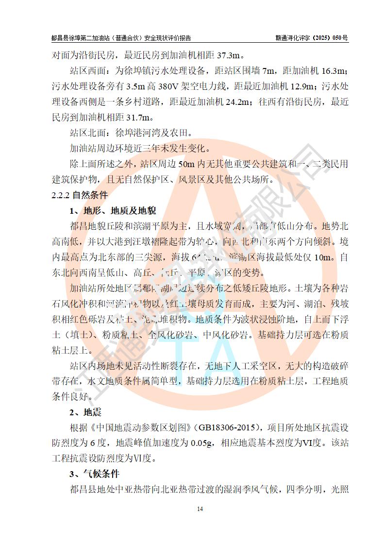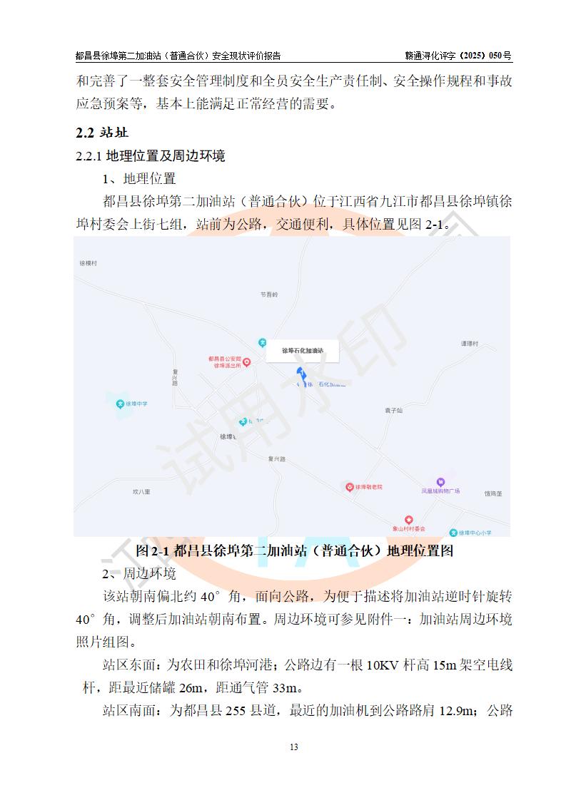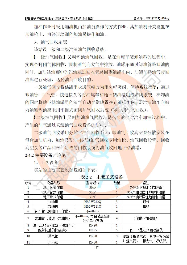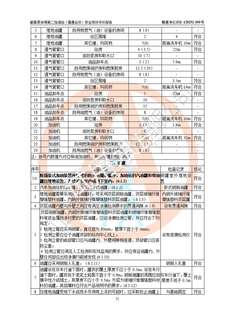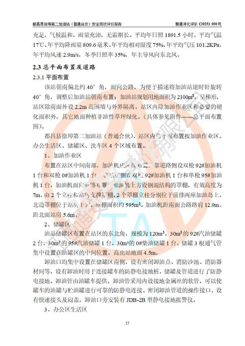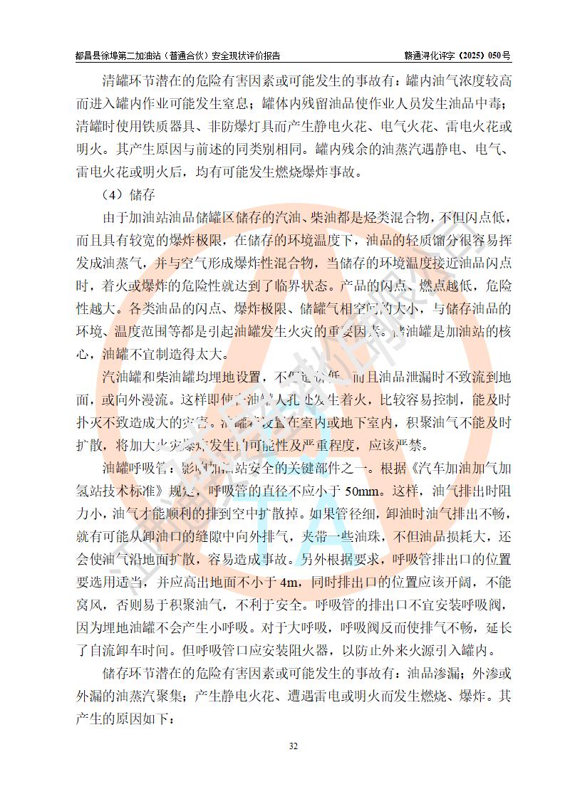 都昌縣徐埠第二加油站(普通合伙)是一家專門從事成品油零售經(jīng)營的普通合伙企業(yè),執(zhí)行事務合伙人:曹建平,經(jīng)營場所位于江西省九江市都昌縣徐埠鎮(zhèn)徐埠村委會上街七組。該加油站現(xiàn)有從業(yè)人員6人,其中安全管理人員1人,主要負責人方錦英。 該加油站站區(qū)占地面積2100m2,站區(qū)內(nèi)設(shè)置有3臺雙槍程控燃油加油機、1臺單槍程控燃油加油機及配套的工藝管線、30m3雙層0#柴油儲罐1臺、30m3雙層92#汽油儲罐2臺、30m3雙層95#汽油儲罐1臺,油品儲罐總?cè)莘e為120m3(折算成汽油為105m3)。按現(xiàn)行《汽車加油加氣加氫站技術(shù)標準》對加油站的等級劃分原則,該站屬于二級加油站。 該站由九江市行政審批局換發(fā)《危險化學品經(jīng)營許可證》(證號:贛九行審經(jīng)(甲)字[2022]000171號),**期限2022年10月18日至2025年10月17日。 |