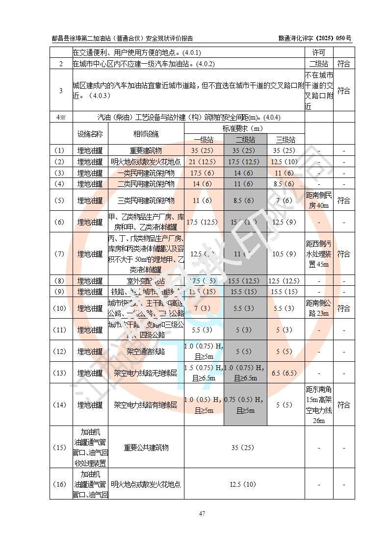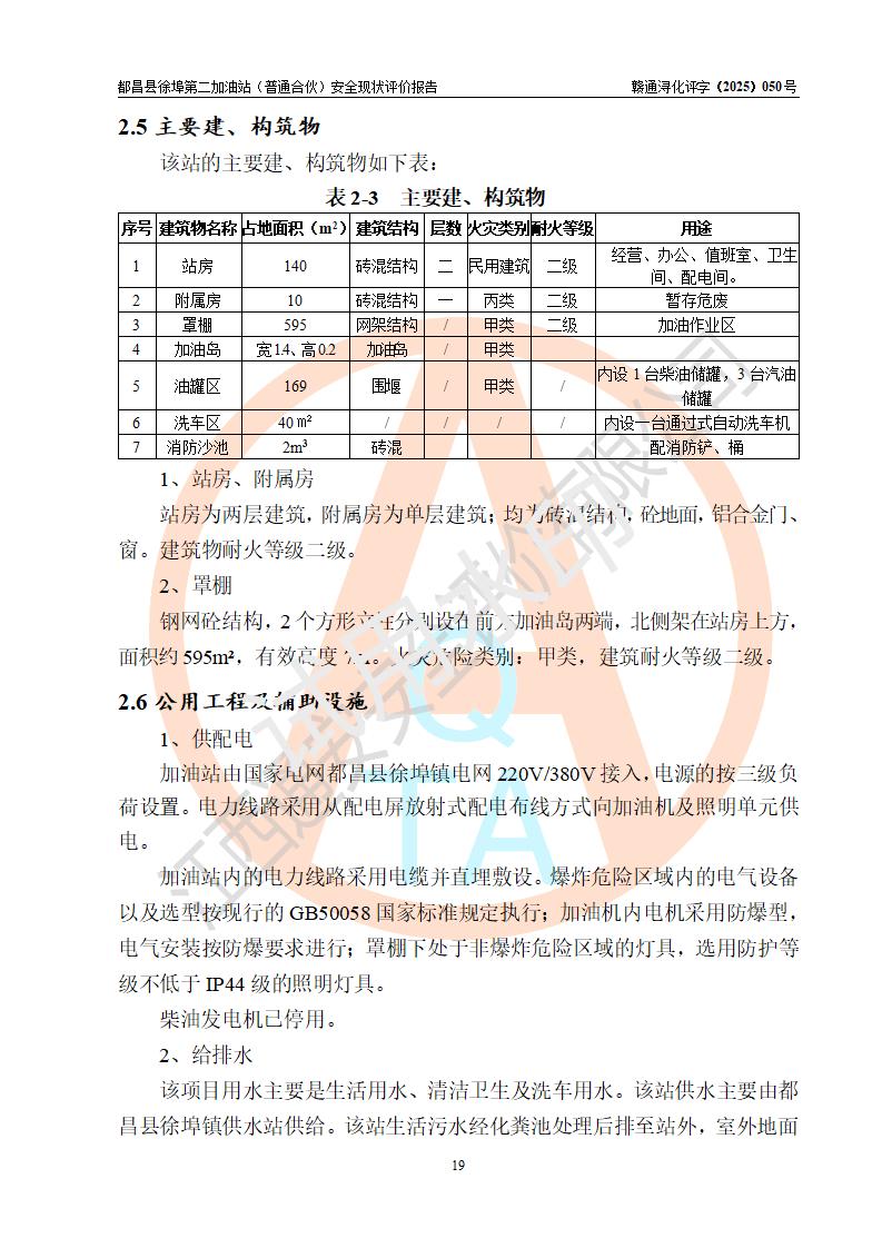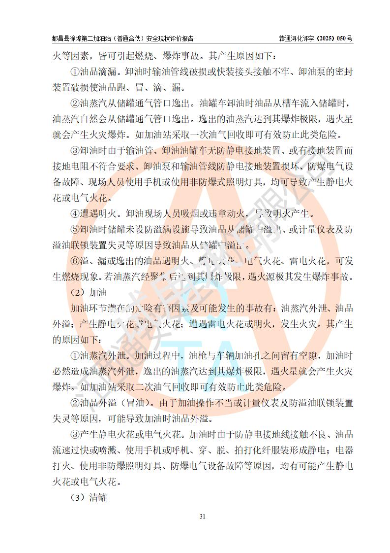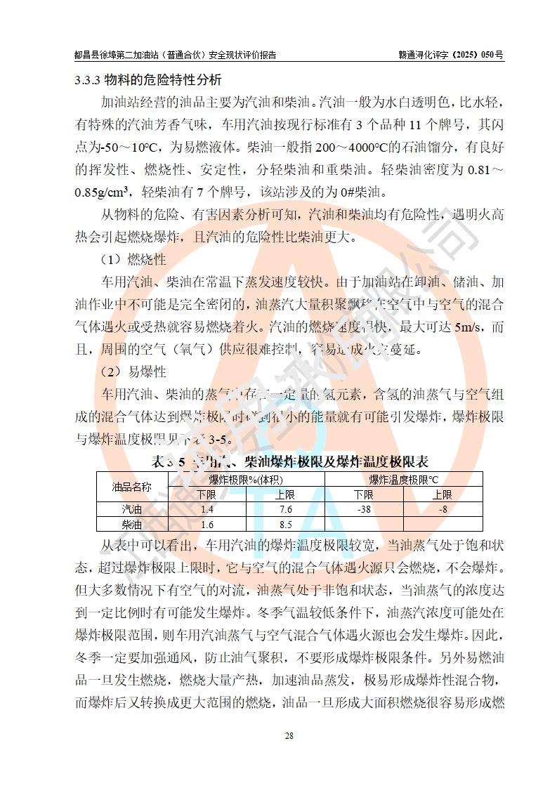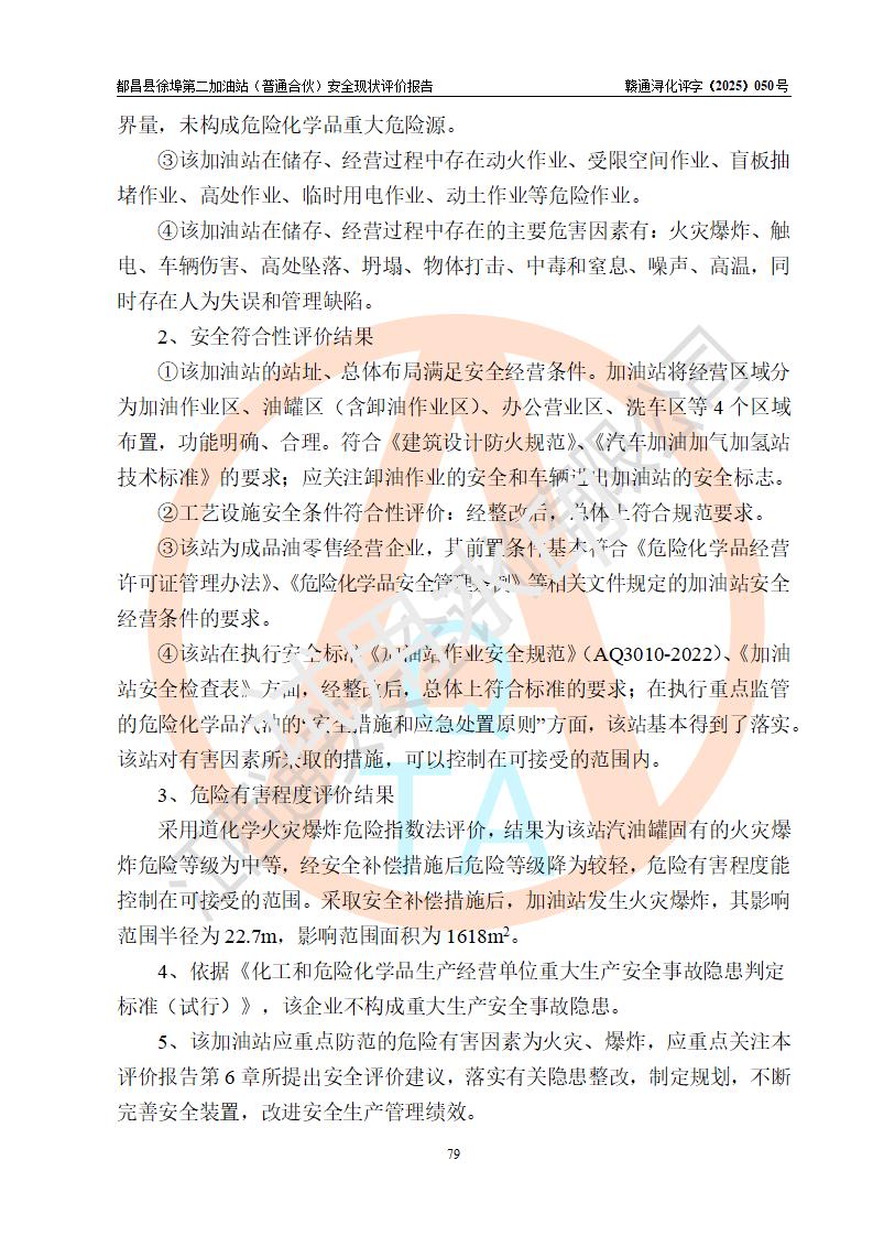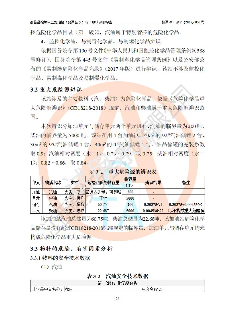 都昌縣徐埠第二加油站(普通合伙)是一家專門從事成品油零售經(jīng)營的普通合伙企業(yè),執(zhí)行事務合伙人:曹建平,經(jīng)營場所位于江西省九江市都昌縣徐埠鎮(zhèn)徐埠村委會上街七組。該加油站現(xiàn)有從業(yè)人員6人,其中安全管理人員1人,主要負責人方錦英。 該加油站站區(qū)占地面積2100m2,站區(qū)內(nèi)設(shè)置有3臺雙槍程控燃油加油機、1臺單槍程控燃油加油機及配套的工藝管線、30m3雙層0#柴油儲罐1臺、30m3雙層92#汽油儲罐2臺、30m3雙層95#汽油儲罐1臺,油品儲罐總?cè)莘e為120m3(折算成汽油為105m3)。按現(xiàn)行《汽車加油加氣加氫站技術(shù)標準》對加油站的等級劃分原則,該站屬于二級加油站。 該站由九江市行政審批局換發(fā)《危險化學品經(jīng)營許可證》(證號:贛九行審經(jīng)(甲)字[2022]000171號),**期限2022年10月18日至2025年10月17日。 |