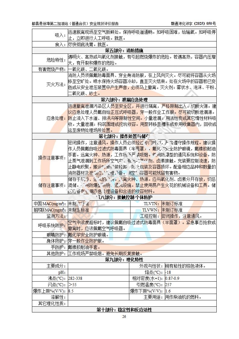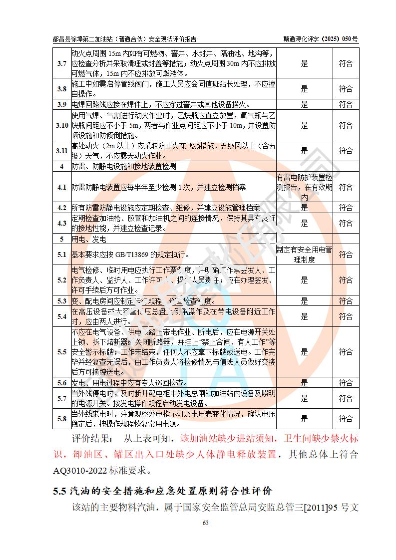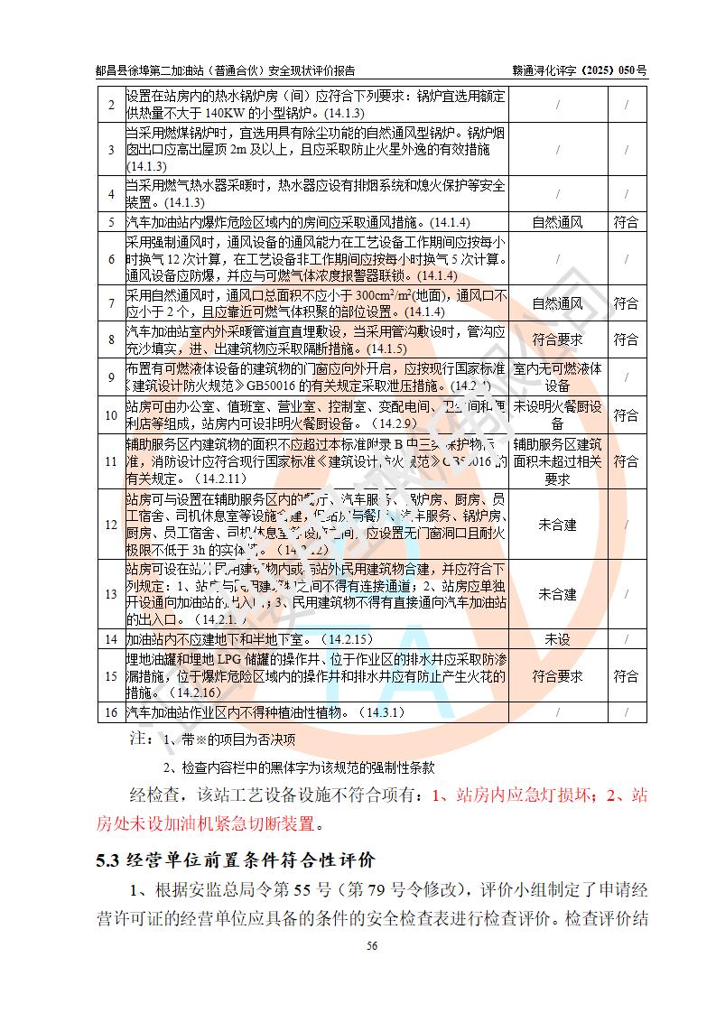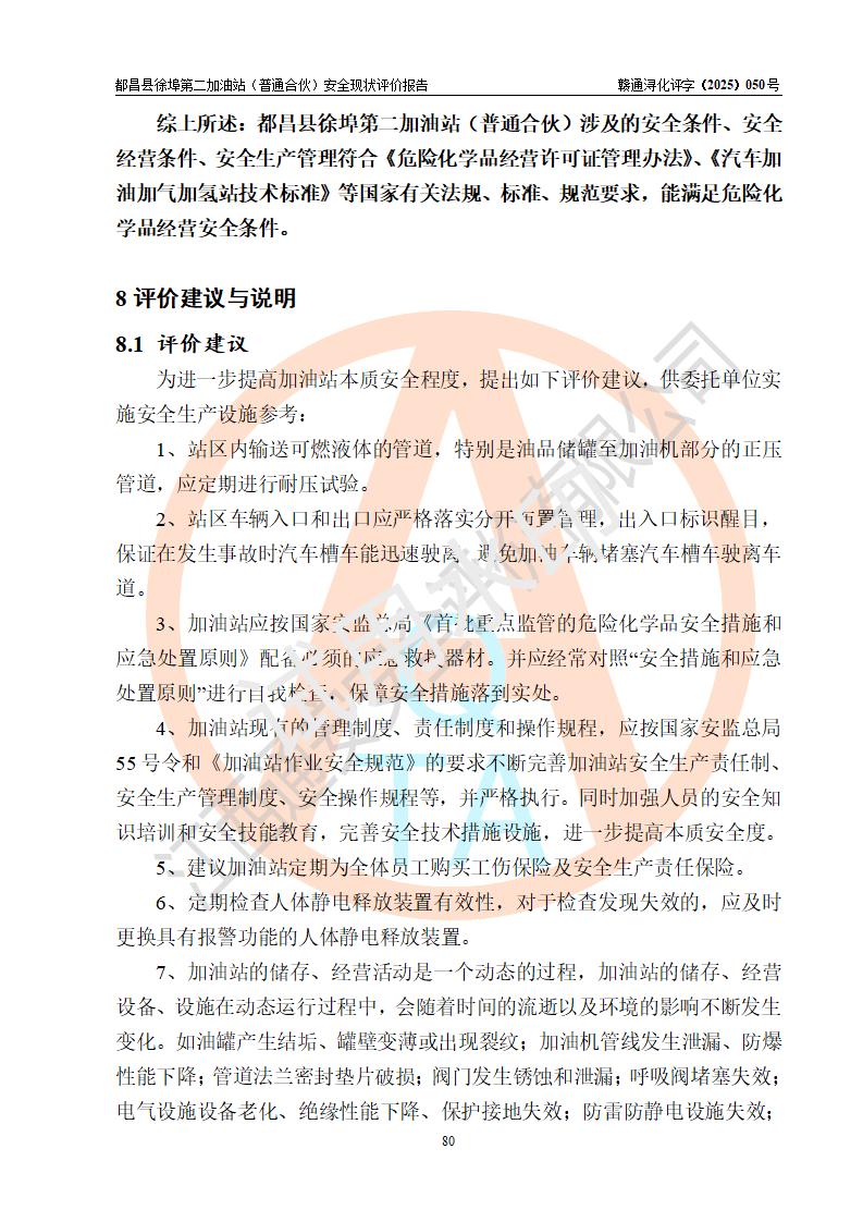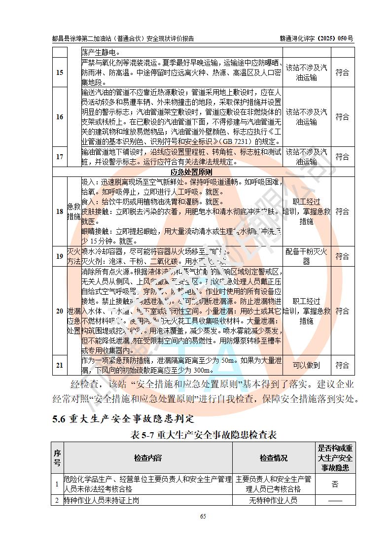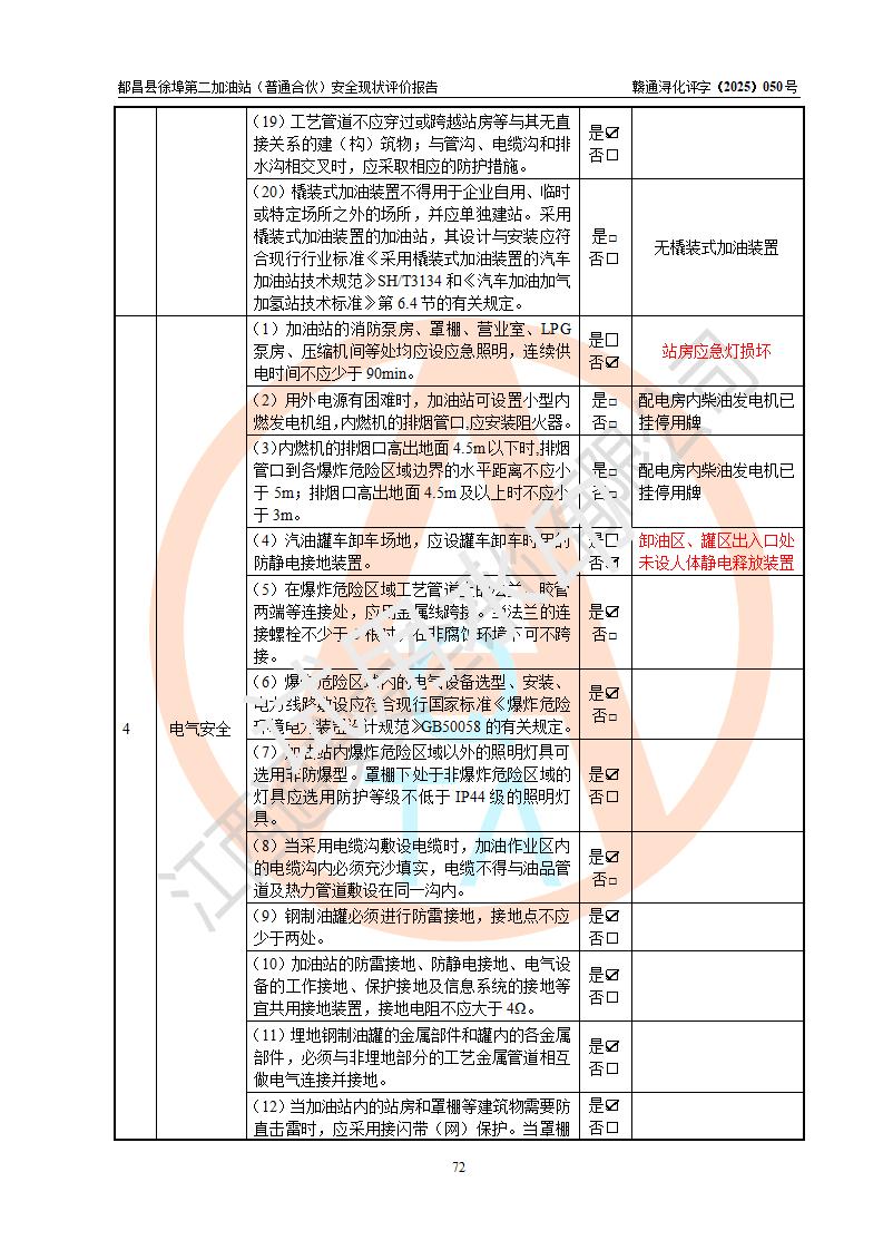都昌縣徐埠第二加油站(普通合伙)是一家專門從事成品油零售經(jīng)營的普通合伙企業(yè),執(zhí)行事務合伙人:曹建平,經(jīng)營場所位于江西省九江市都昌縣徐埠鎮(zhèn)徐埠村委會上街七組。該加油站現(xiàn)有從業(yè)人員6人,其中安全管理人員1人,主要負責人方錦英。 該加油站站區(qū)占地面積2100m2,站區(qū)內(nèi)設(shè)置有3臺雙槍程控燃油加油機、1臺單槍程控燃油加油機及配套的工藝管線、30m3雙層0#柴油儲罐1臺、30m3雙層92#汽油儲罐2臺、30m3雙層95#汽油儲罐1臺,油品儲罐總?cè)莘e為120m3(折算成汽油為105m3)。按現(xiàn)行《汽車加油加氣加氫站技術(shù)標準》對加油站的等級劃分原則,該站屬于二級加油站。 該站由九江市行政審批局換發(fā)《危險化學品經(jīng)營許可證》(證號:贛九行審經(jīng)(甲)字[2022]000171號),**期限2022年10月18日至2025年10月17日。 |