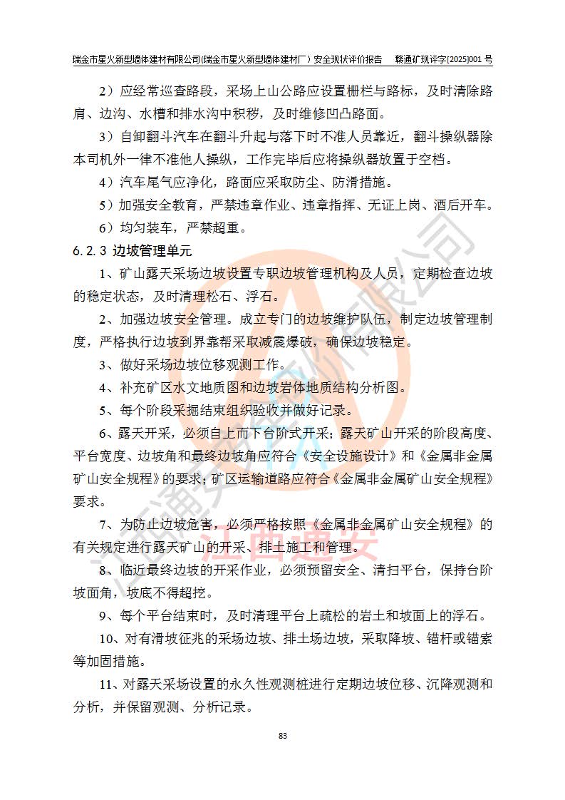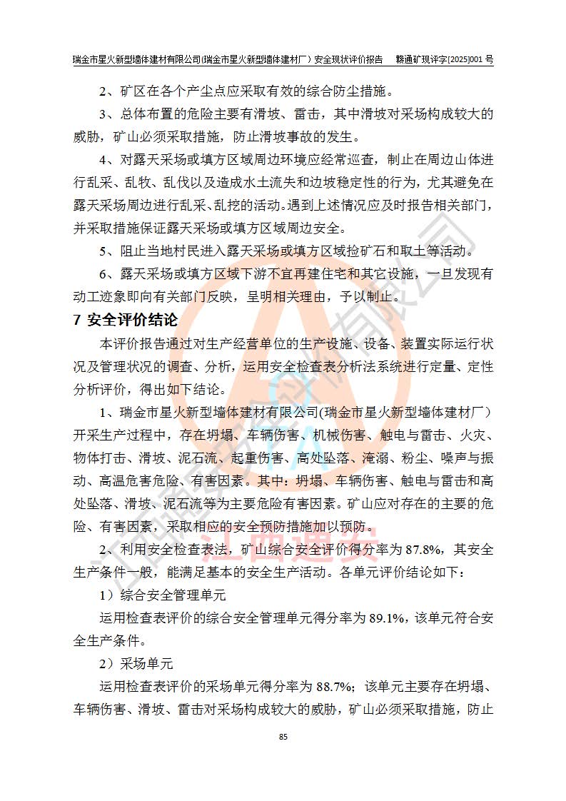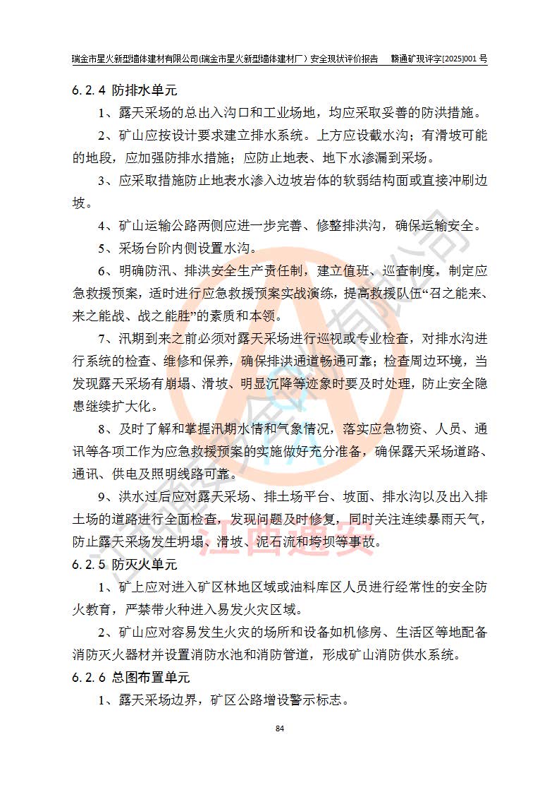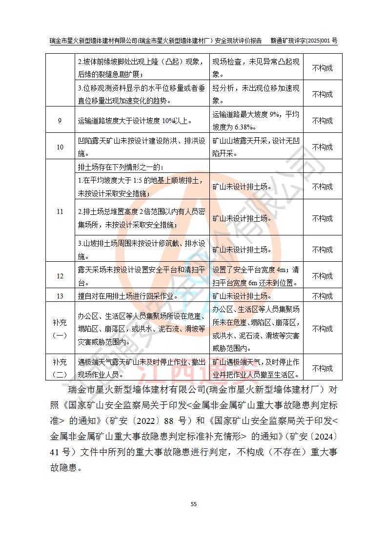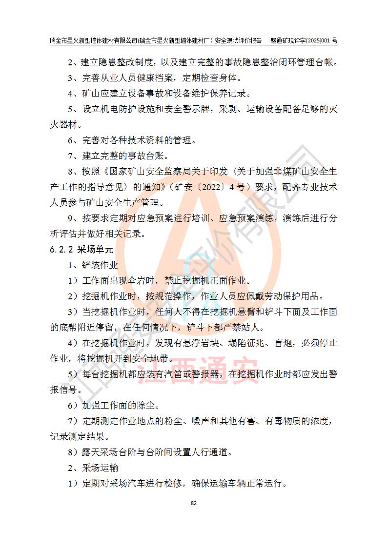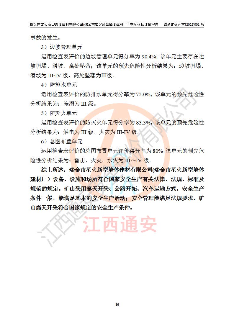 其它 | 瑞金市星火新型墻體建材有限公司(瑞金市星火新型墻體建材廠)設(shè)備、設(shè)施和場所基本符合**安全生產(chǎn)有關(guān)法律、法規(guī)、標(biāo)準(zhǔn)及規(guī)范的規(guī)定。礦山采用露天開采公路開拓汽車運(yùn)輸方式,安全生產(chǎn)條件良好,生產(chǎn)活動有安全保障;安全管理能滿足法規(guī)要求,礦山露天開采符合**規(guī)定的安全生產(chǎn)條件。 | ||||