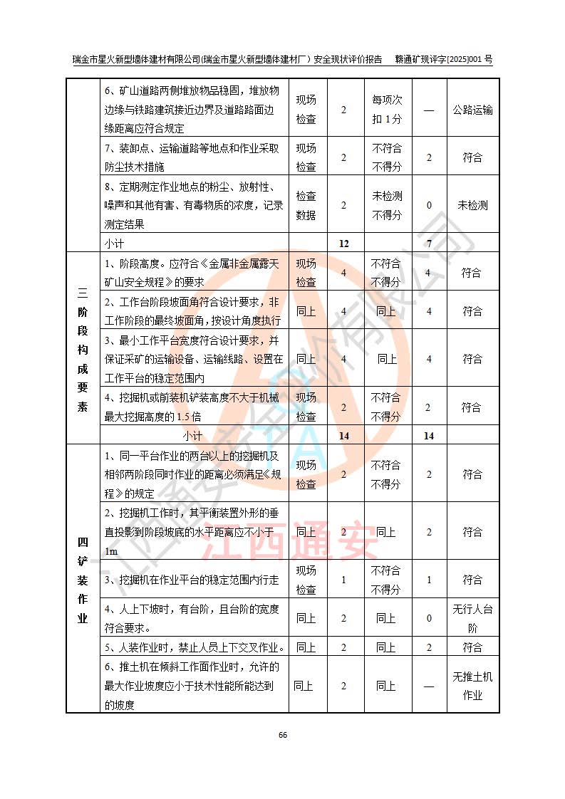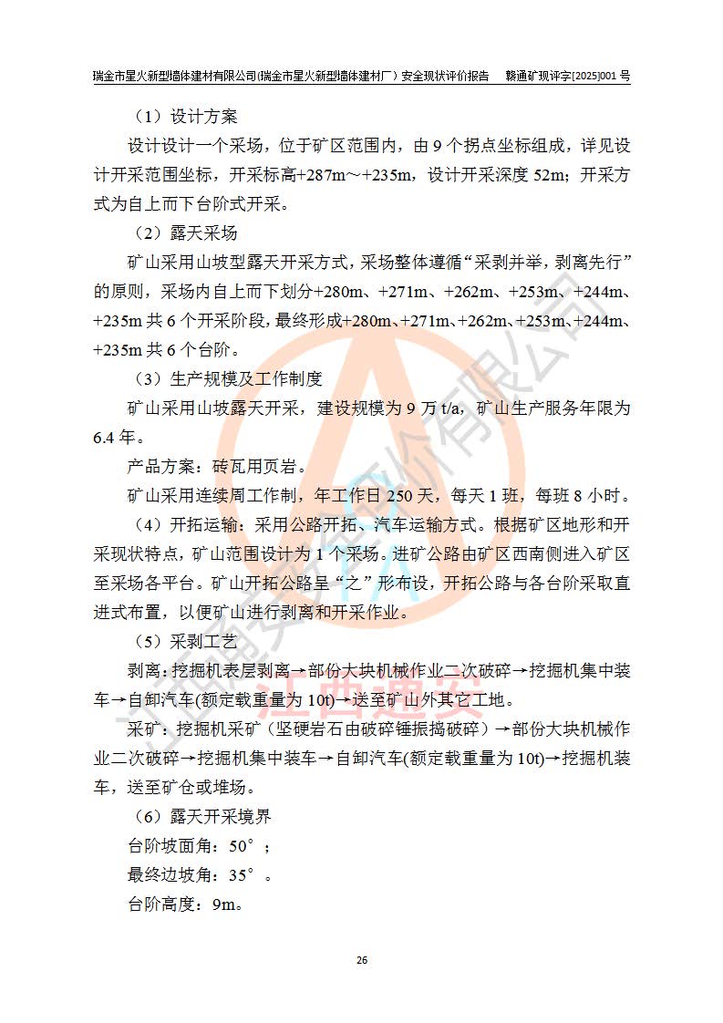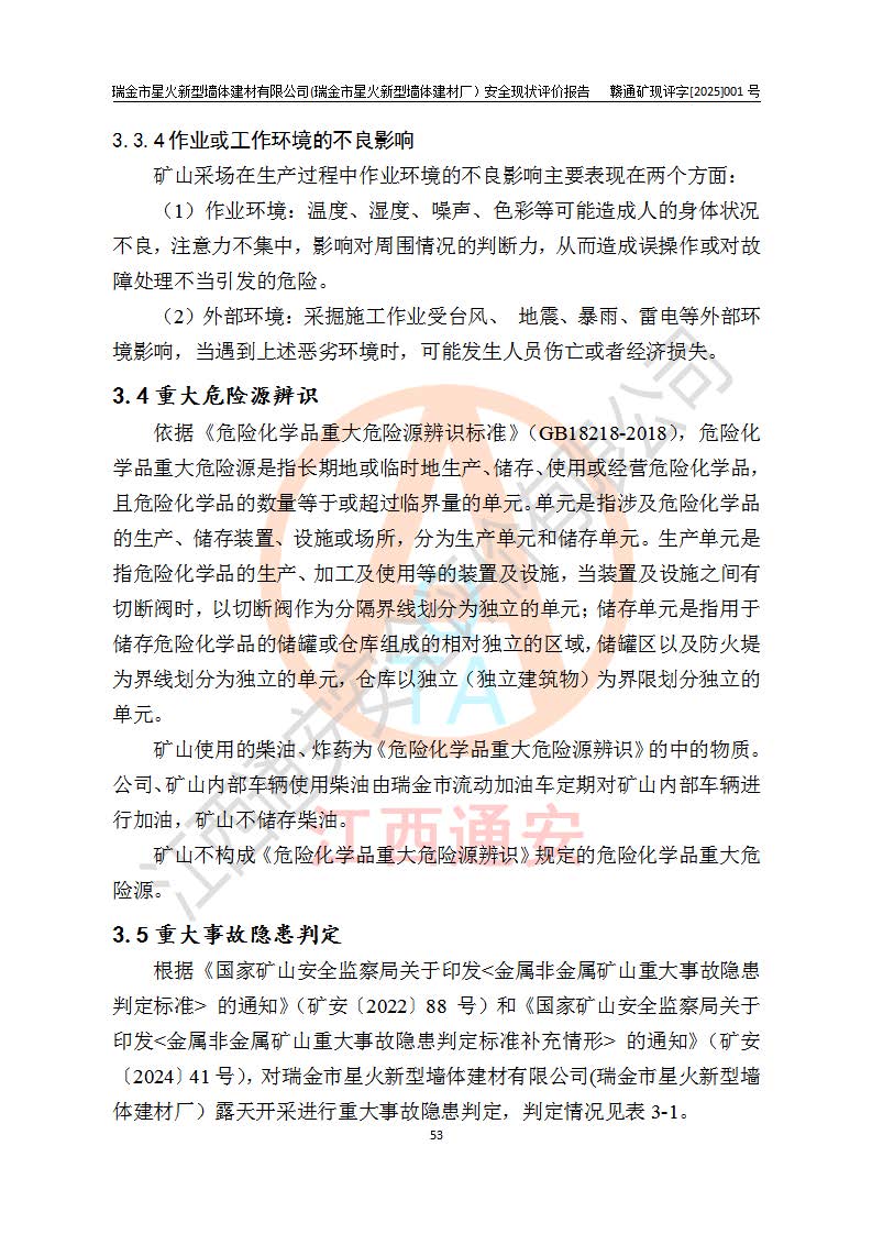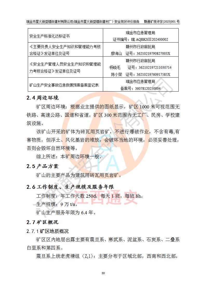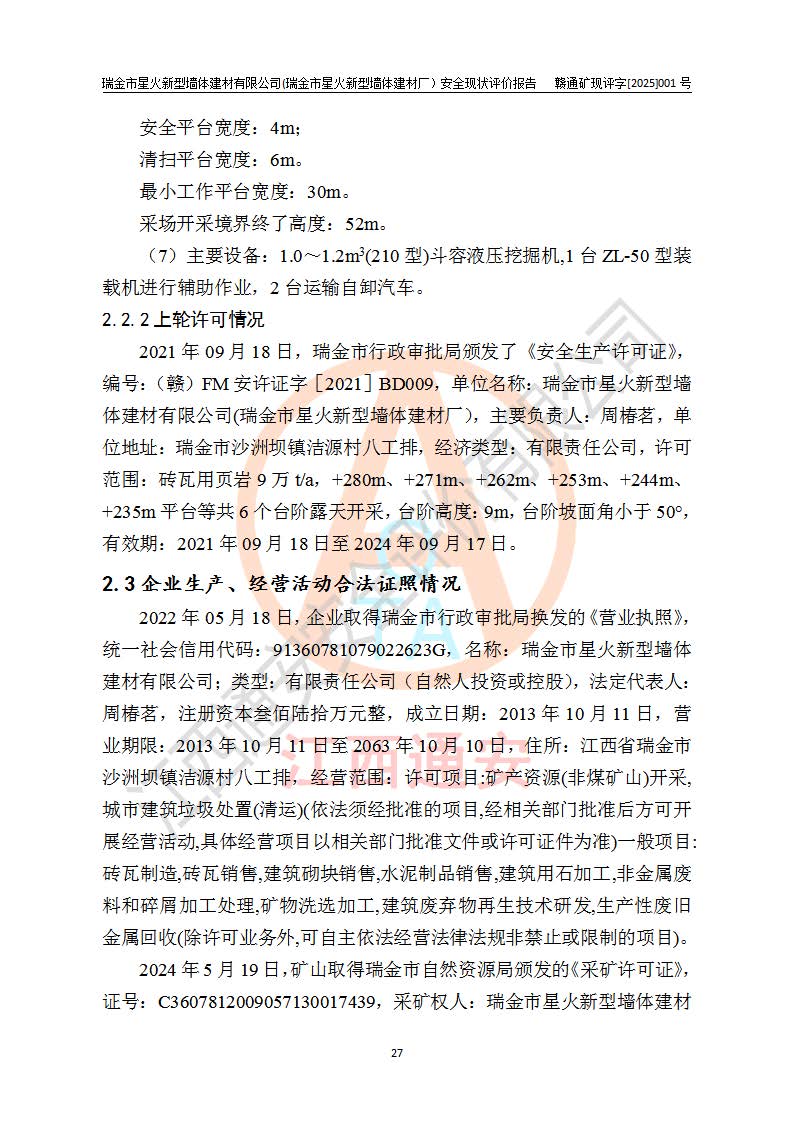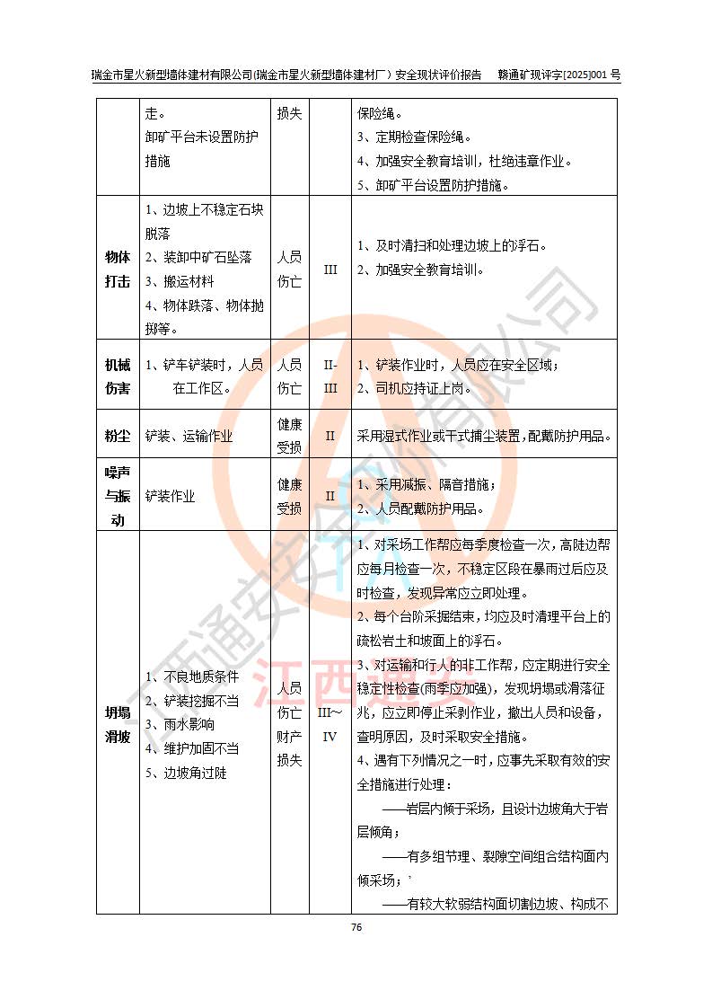 其它 | 瑞金市星火新型墻體建材有限公司(瑞金市星火新型墻體建材廠)設(shè)備、設(shè)施和場所基本符合**安全生產(chǎn)有關(guān)法律、法規(guī)、標(biāo)準(zhǔn)及規(guī)范的規(guī)定。礦山采用露天開采公路開拓汽車運(yùn)輸方式,安全生產(chǎn)條件良好,生產(chǎn)活動有安全保障;安全管理能滿足法規(guī)要求,礦山露天開采符合**規(guī)定的安全生產(chǎn)條件。 | ||||