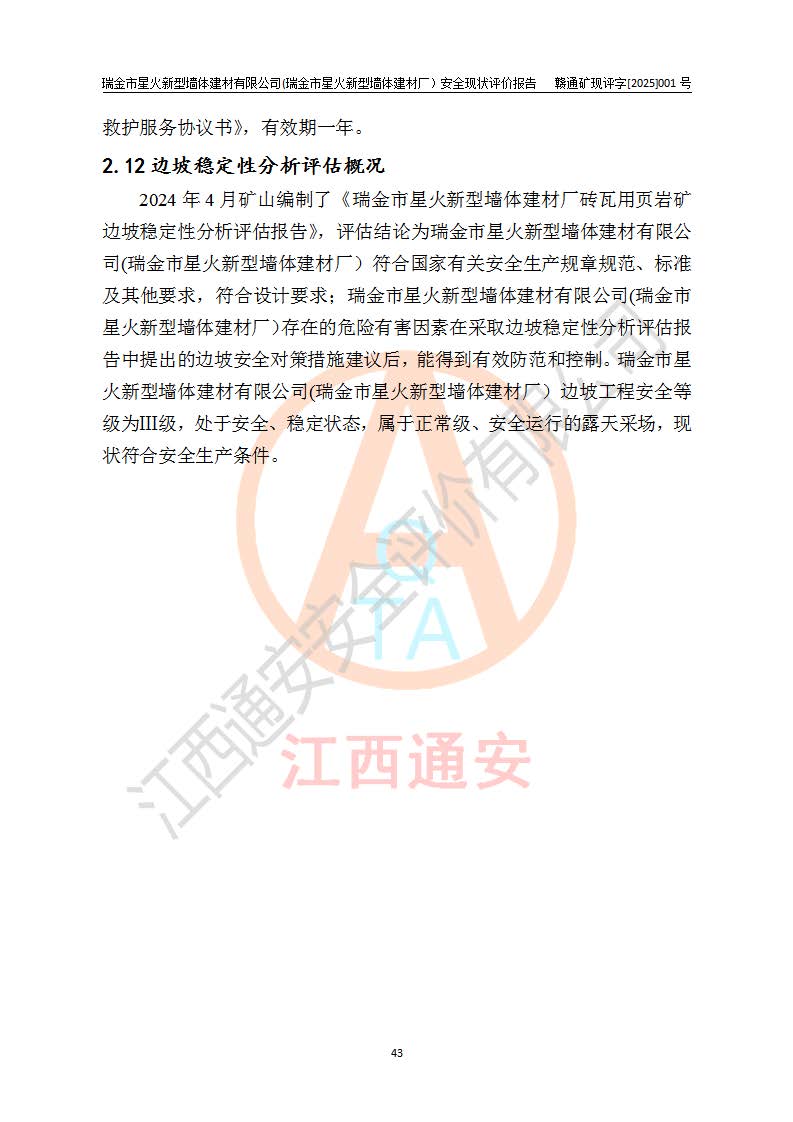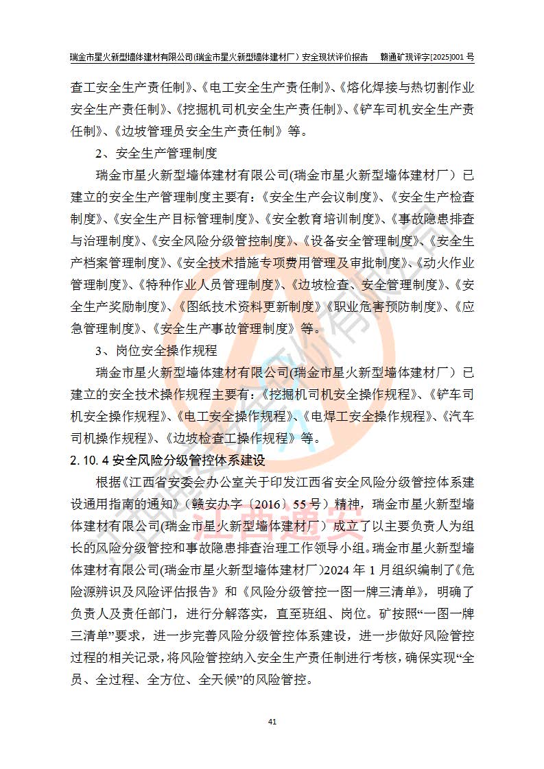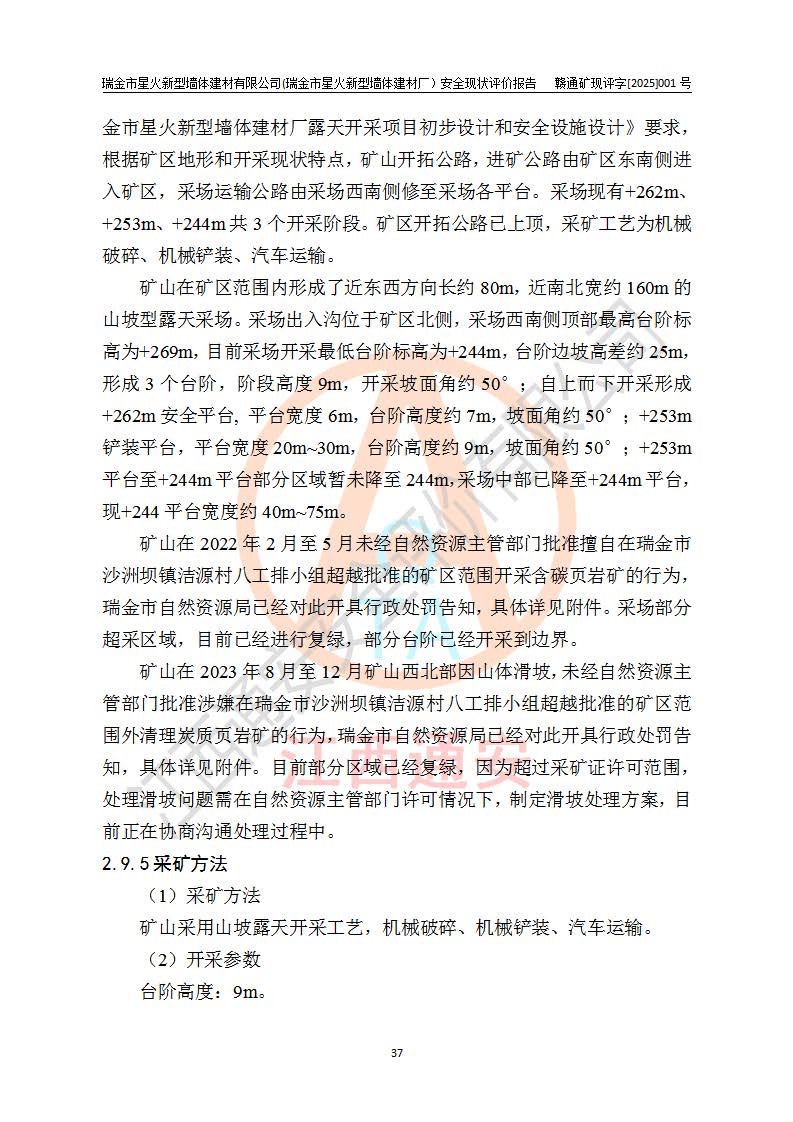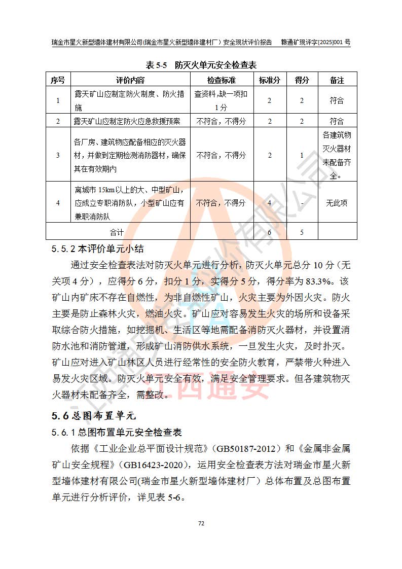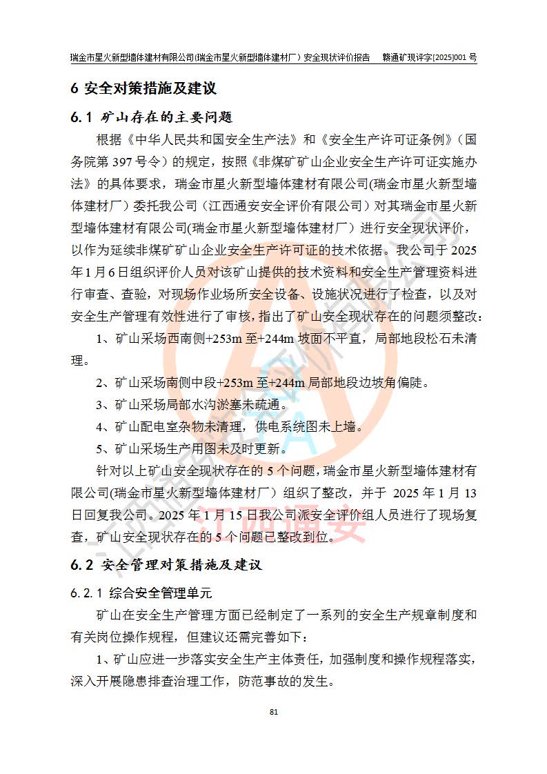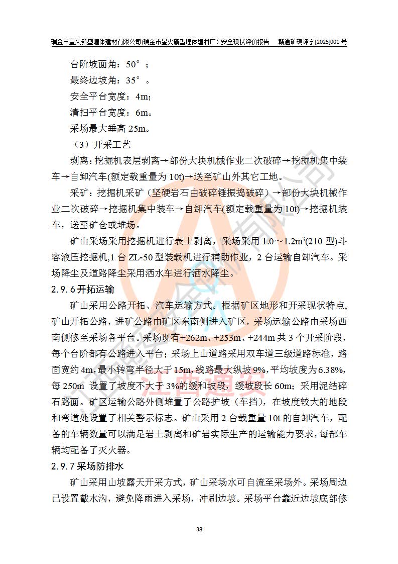 其它 | 瑞金市星火新型墻體建材有限公司(瑞金市星火新型墻體建材廠)設(shè)備、設(shè)施和場所基本符合**安全生產(chǎn)有關(guān)法律、法規(guī)、標(biāo)準(zhǔn)及規(guī)范的規(guī)定。礦山采用露天開采公路開拓汽車運(yùn)輸方式,安全生產(chǎn)條件良好,生產(chǎn)活動有安全保障;安全管理能滿足法規(guī)要求,礦山露天開采符合**規(guī)定的安全生產(chǎn)條件。 | ||||