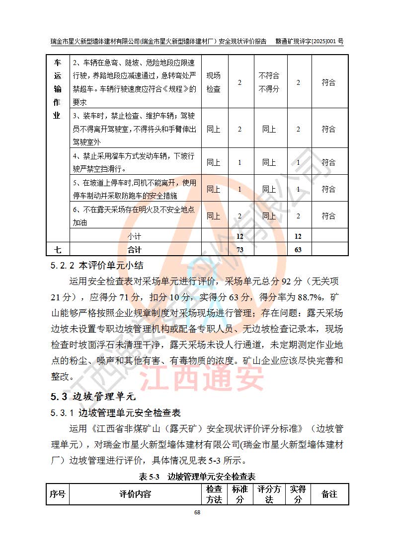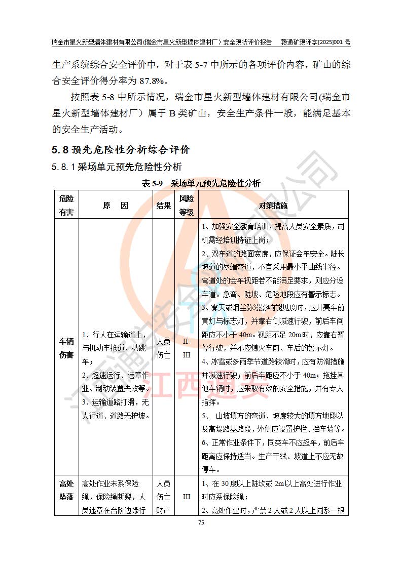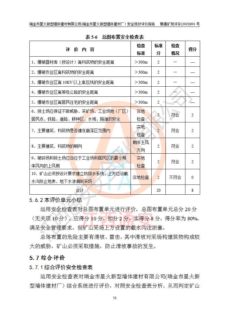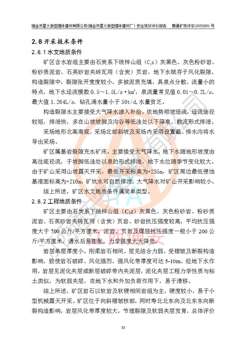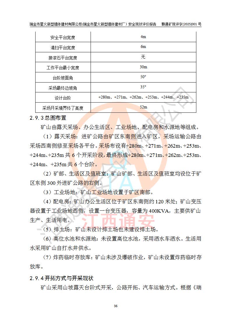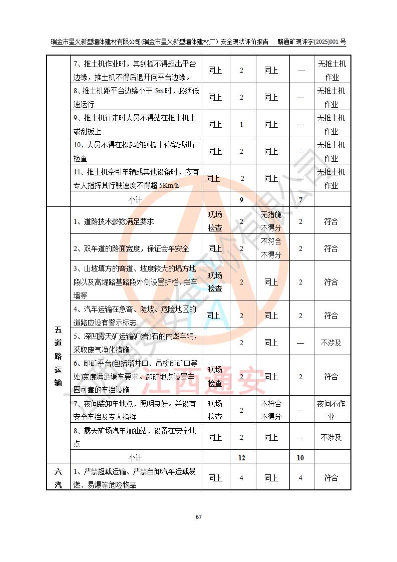 其它 | 瑞金市星火新型墻體建材有限公司(瑞金市星火新型墻體建材廠)設(shè)備、設(shè)施和場所基本符合**安全生產(chǎn)有關(guān)法律、法規(guī)、標(biāo)準(zhǔn)及規(guī)范的規(guī)定。礦山采用露天開采公路開拓汽車運(yùn)輸方式,安全生產(chǎn)條件良好,生產(chǎn)活動有安全保障;安全管理能滿足法規(guī)要求,礦山露天開采符合**規(guī)定的安全生產(chǎn)條件。 | ||||