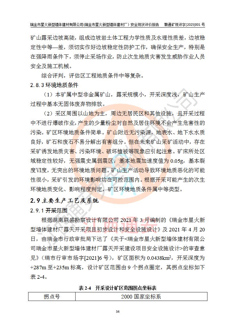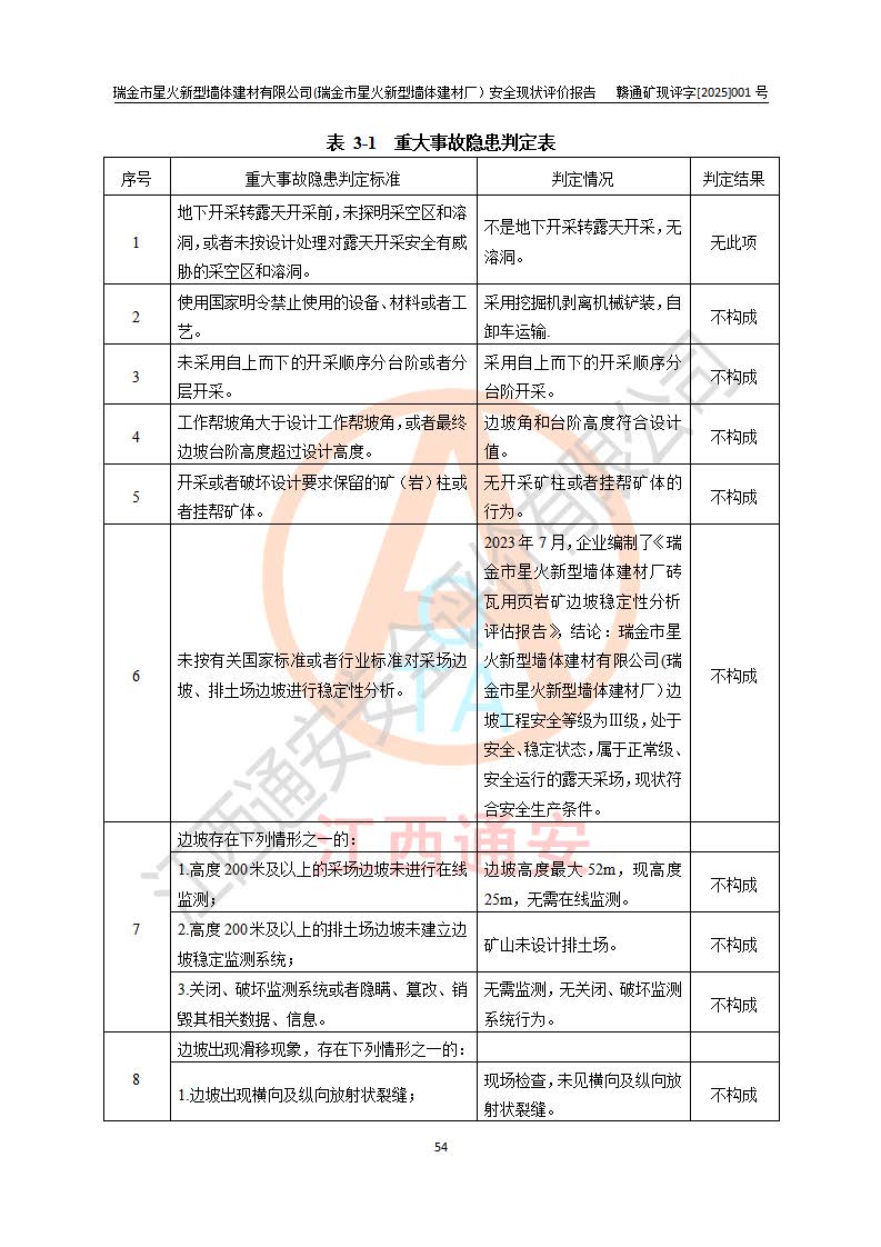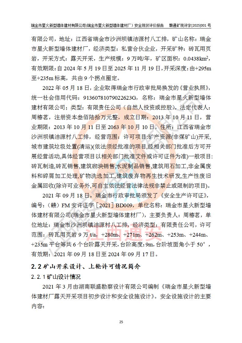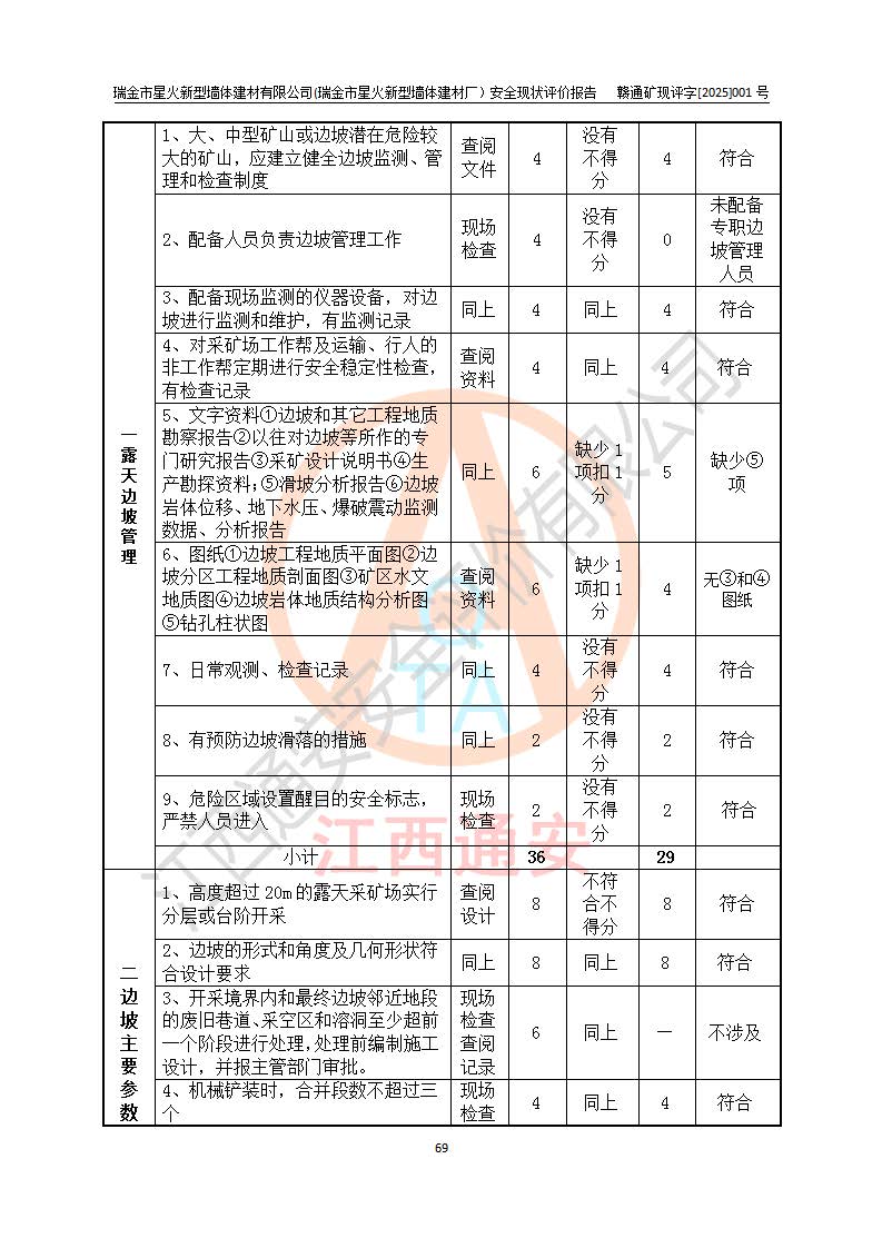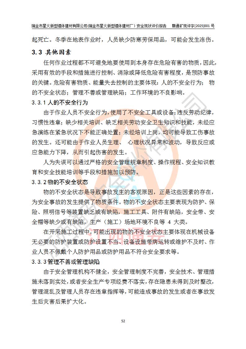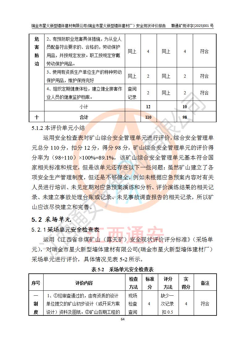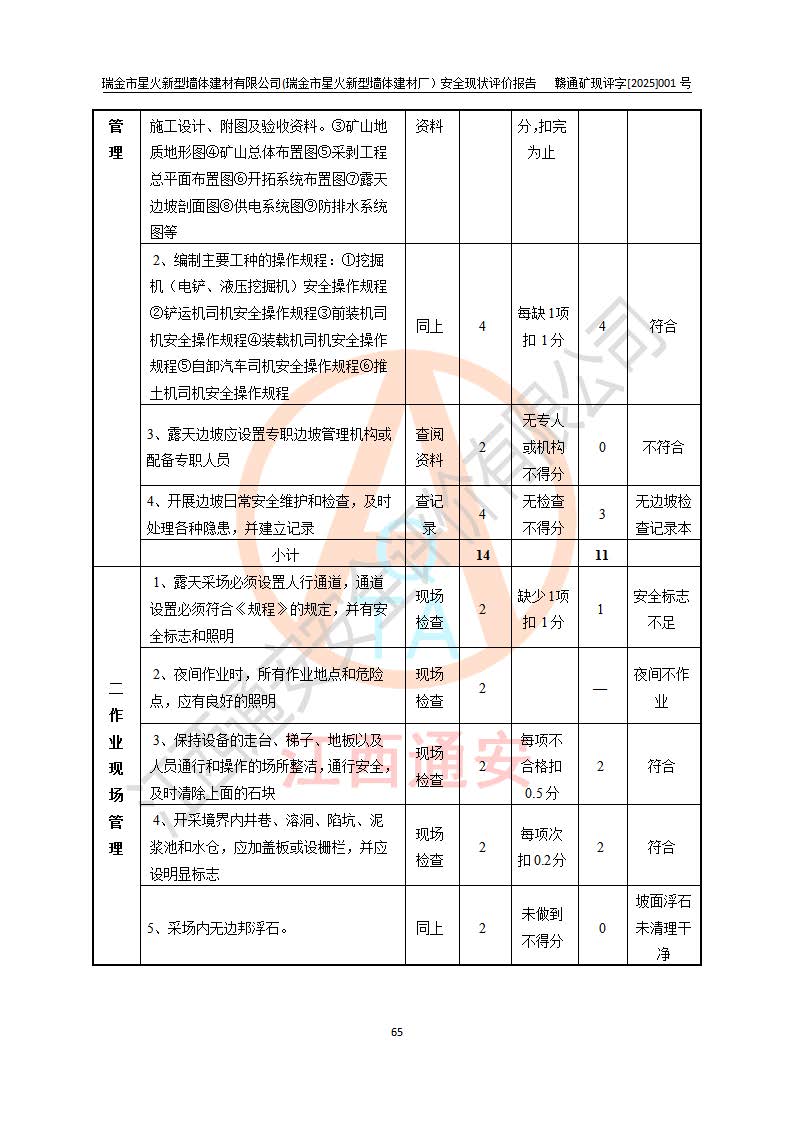 其它 | 瑞金市星火新型墻體建材有限公司(瑞金市星火新型墻體建材廠)設(shè)備、設(shè)施和場所基本符合**安全生產(chǎn)有關(guān)法律、法規(guī)、標(biāo)準(zhǔn)及規(guī)范的規(guī)定。礦山采用露天開采公路開拓汽車運(yùn)輸方式,安全生產(chǎn)條件良好,生產(chǎn)活動有安全保障;安全管理能滿足法規(guī)要求,礦山露天開采符合**規(guī)定的安全生產(chǎn)條件。 | ||||