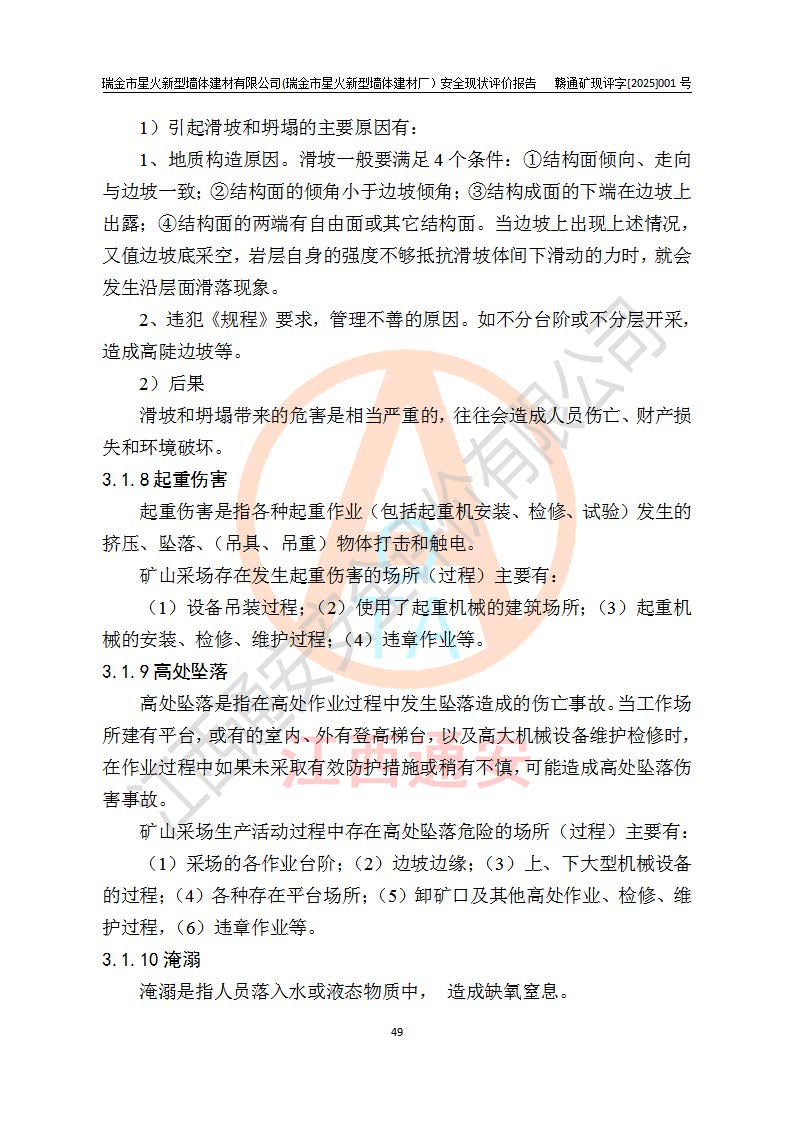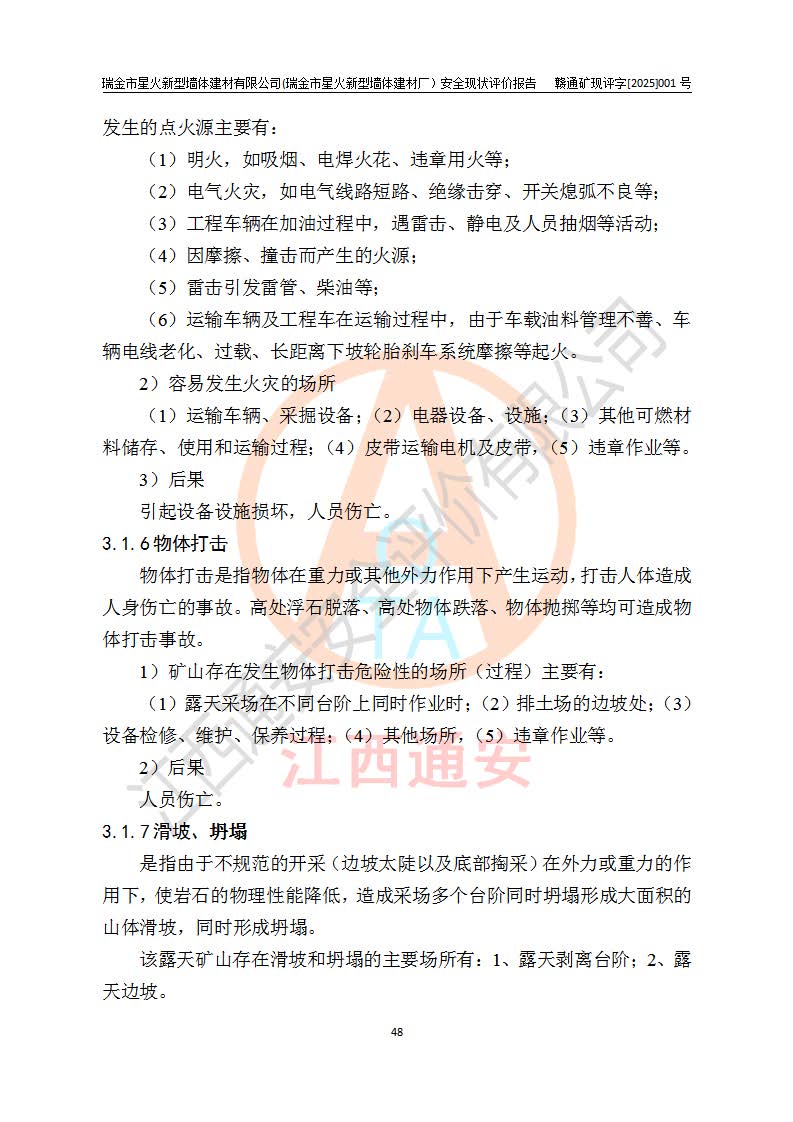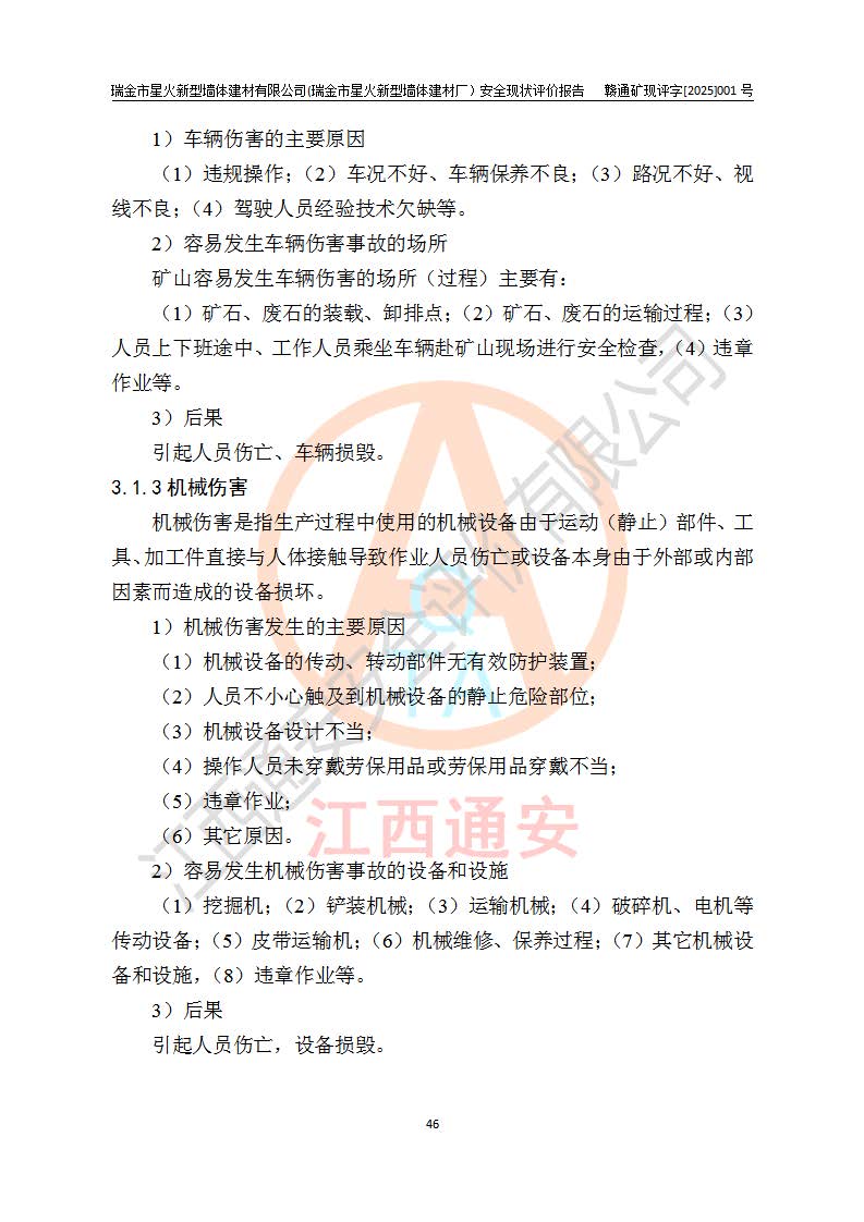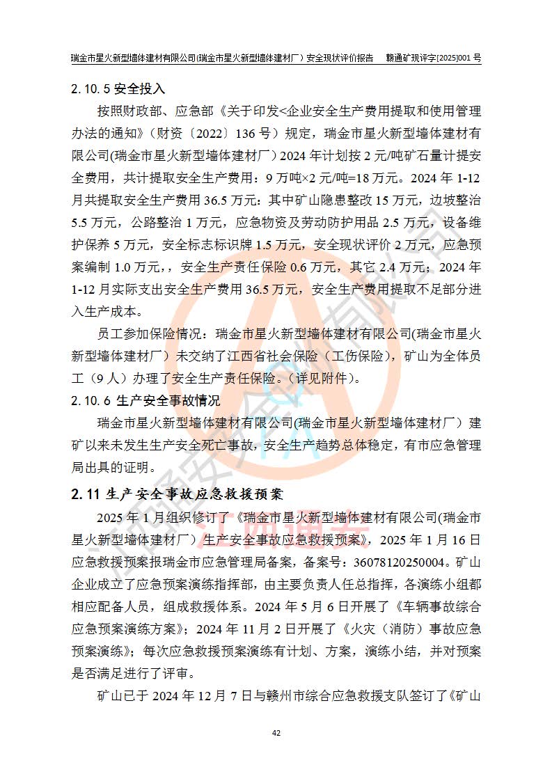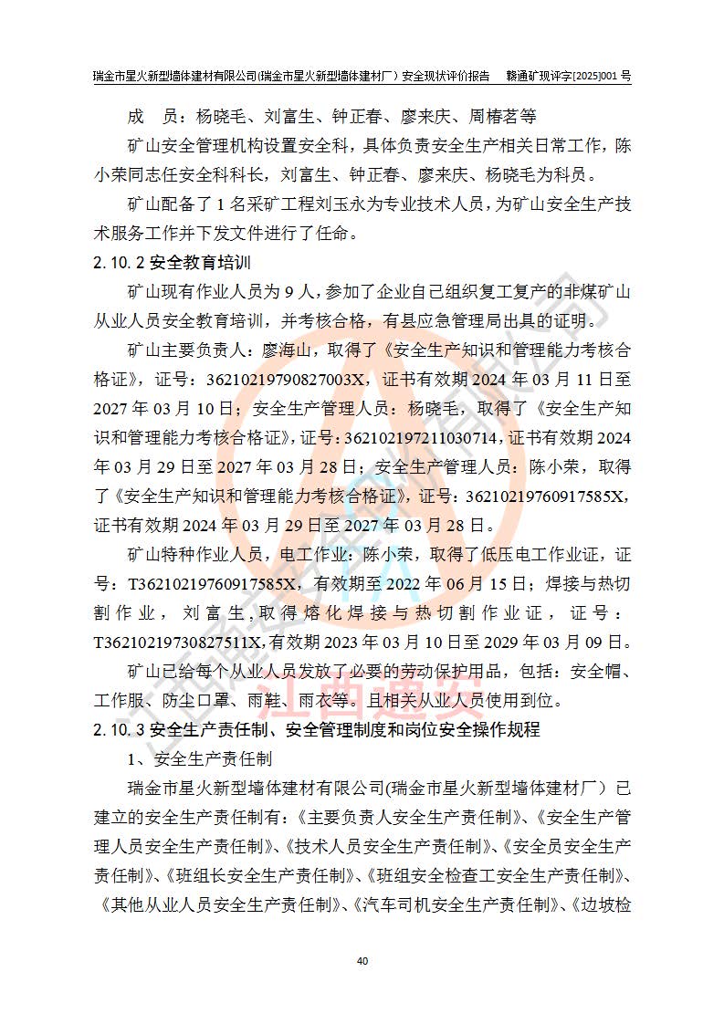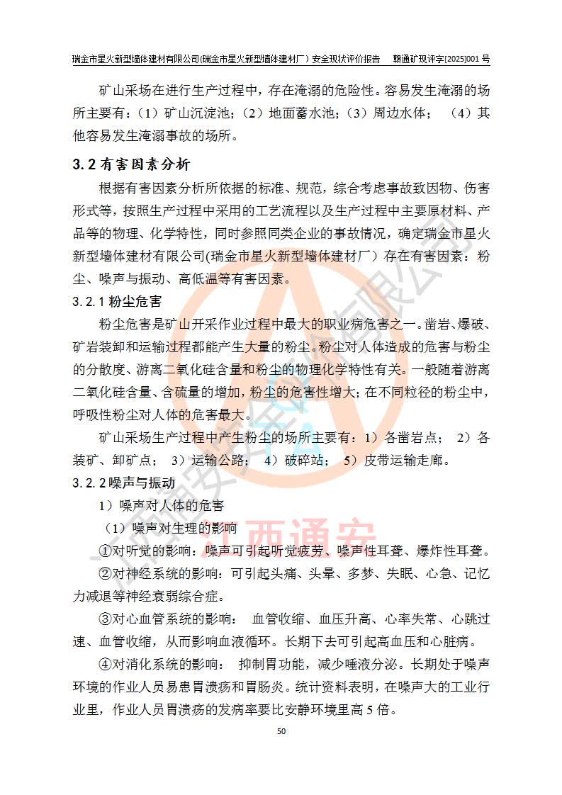 其它 | 瑞金市星火新型墻體建材有限公司(瑞金市星火新型墻體建材廠)設(shè)備、設(shè)施和場所基本符合**安全生產(chǎn)有關(guān)法律、法規(guī)、標(biāo)準(zhǔn)及規(guī)范的規(guī)定。礦山采用露天開采公路開拓汽車運(yùn)輸方式,安全生產(chǎn)條件良好,生產(chǎn)活動有安全保障;安全管理能滿足法規(guī)要求,礦山露天開采符合**規(guī)定的安全生產(chǎn)條件。 | ||||