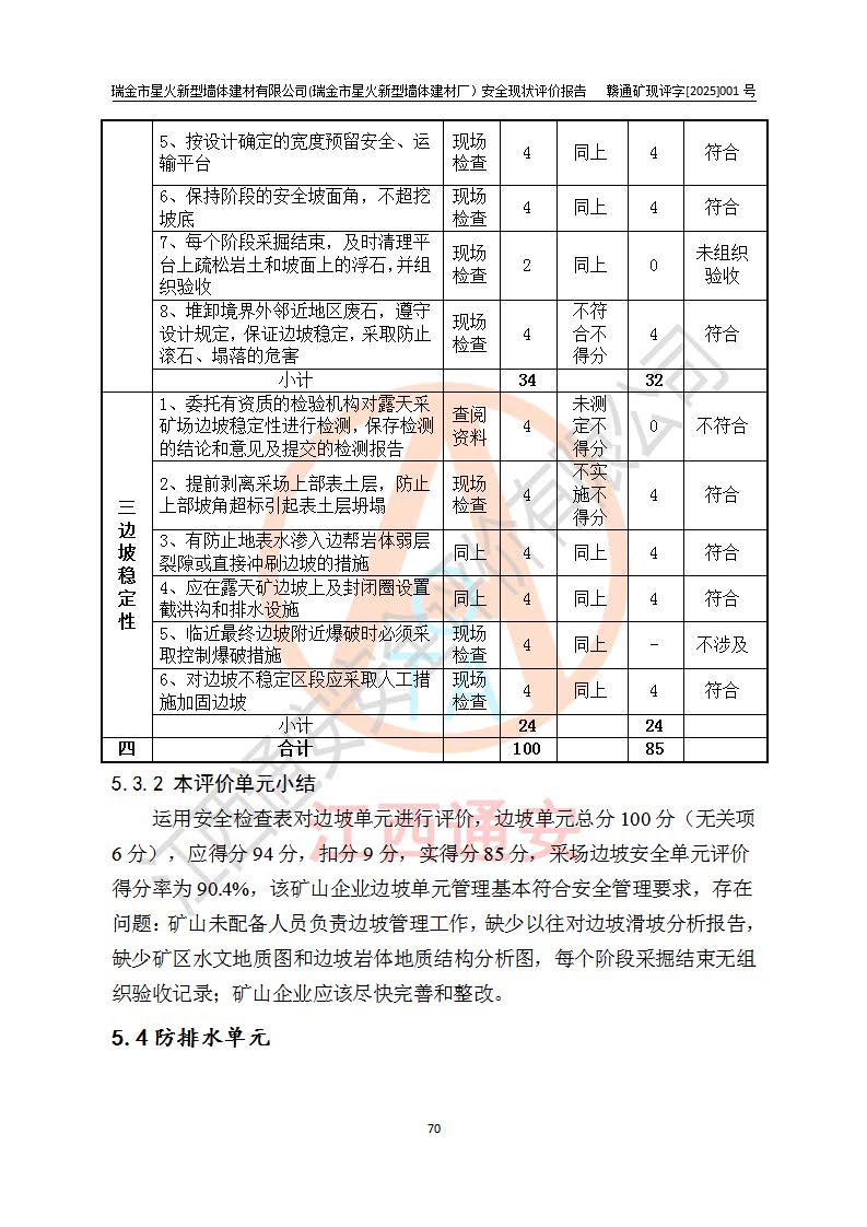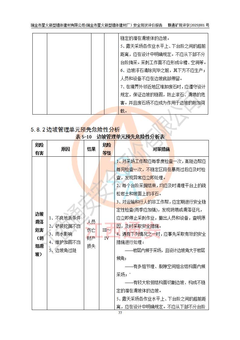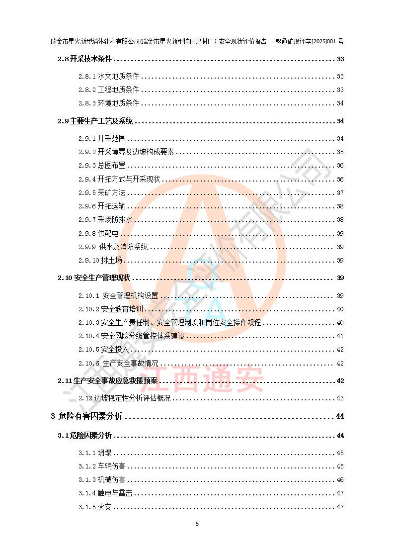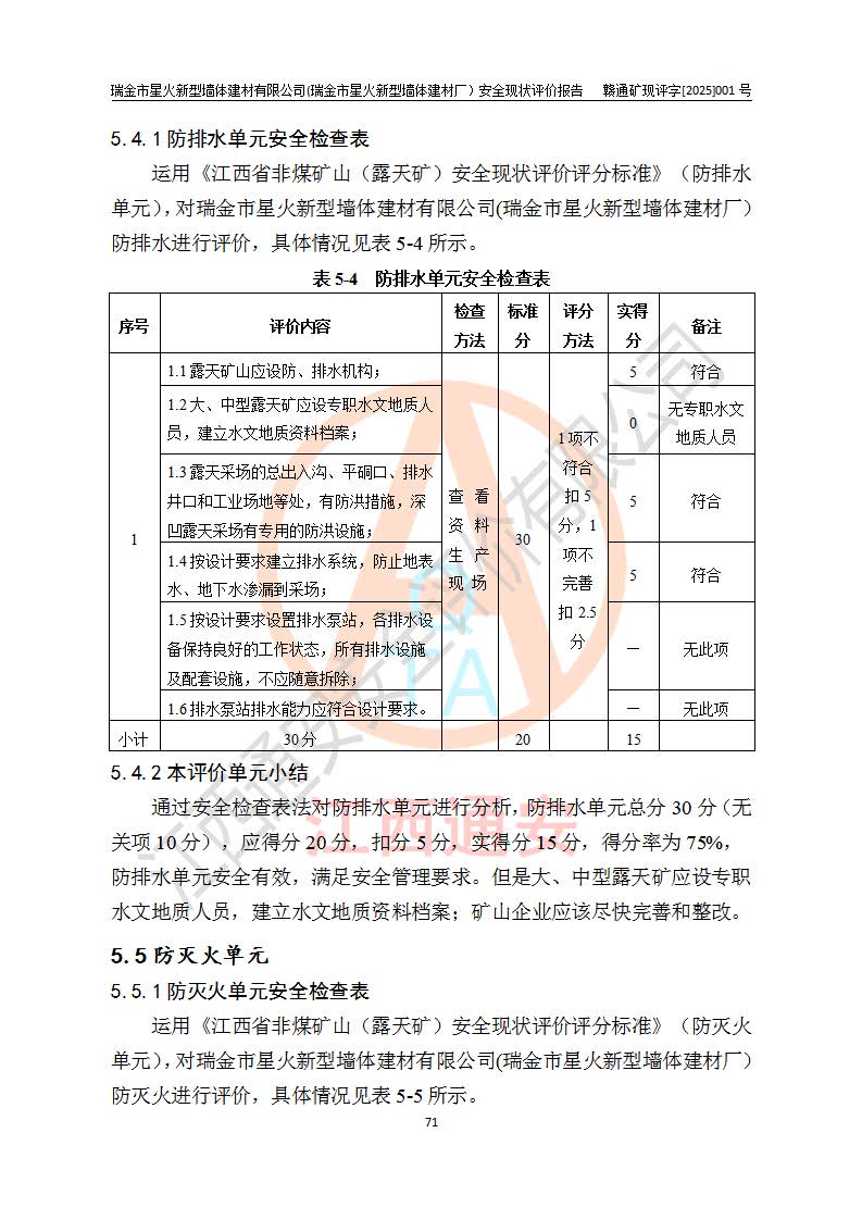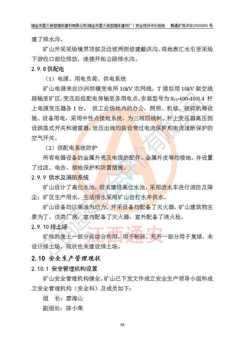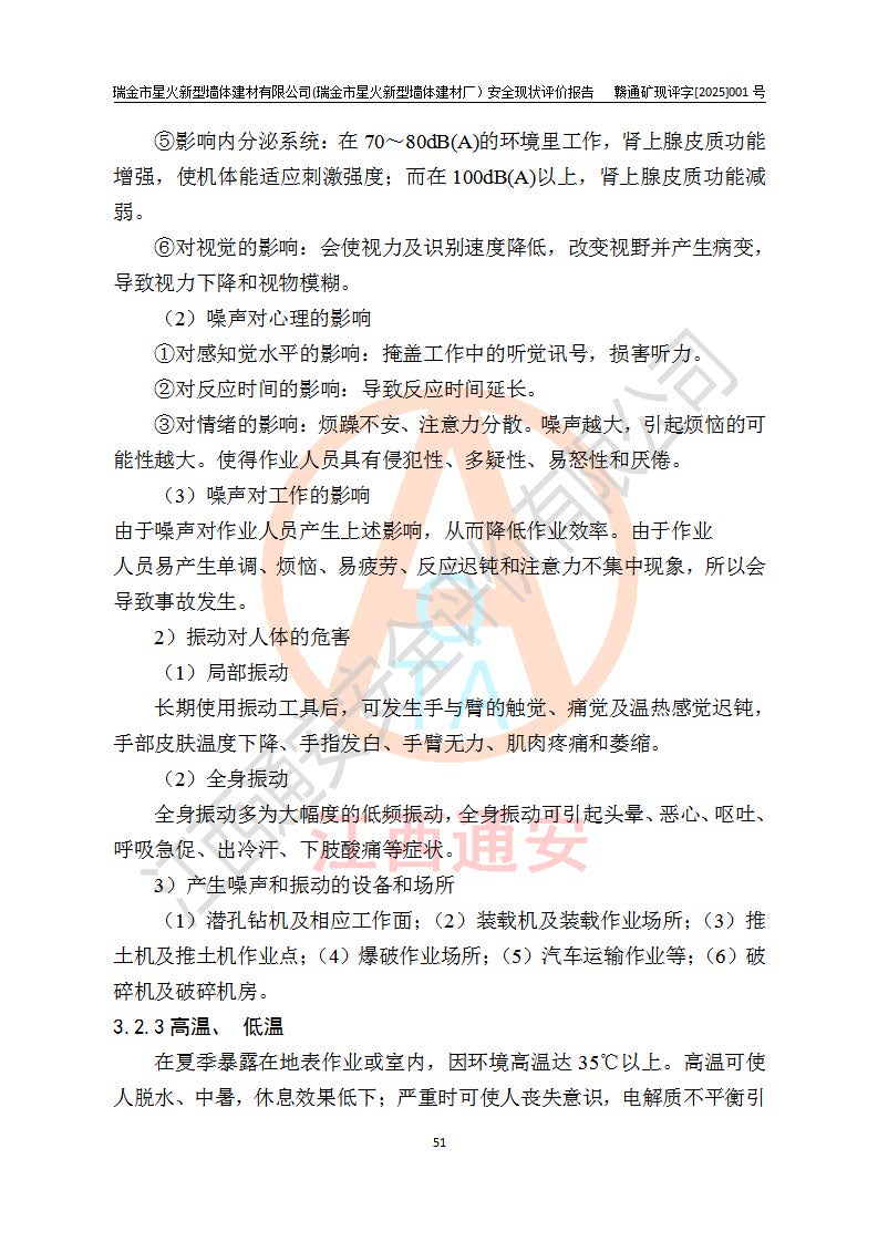 其它 | 瑞金市星火新型墻體建材有限公司(瑞金市星火新型墻體建材廠)設(shè)備、設(shè)施和場所基本符合**安全生產(chǎn)有關(guān)法律、法規(guī)、標(biāo)準(zhǔn)及規(guī)范的規(guī)定。礦山采用露天開采公路開拓汽車運(yùn)輸方式,安全生產(chǎn)條件良好,生產(chǎn)活動有安全保障;安全管理能滿足法規(guī)要求,礦山露天開采符合**規(guī)定的安全生產(chǎn)條件。 | ||||
