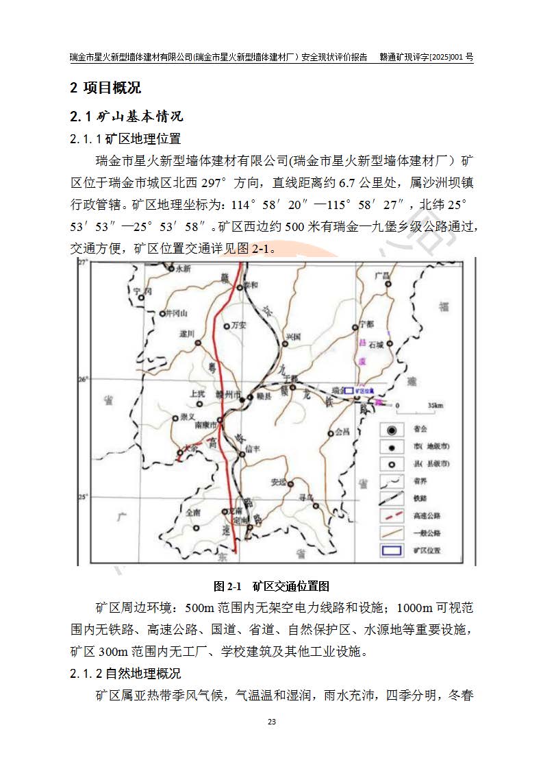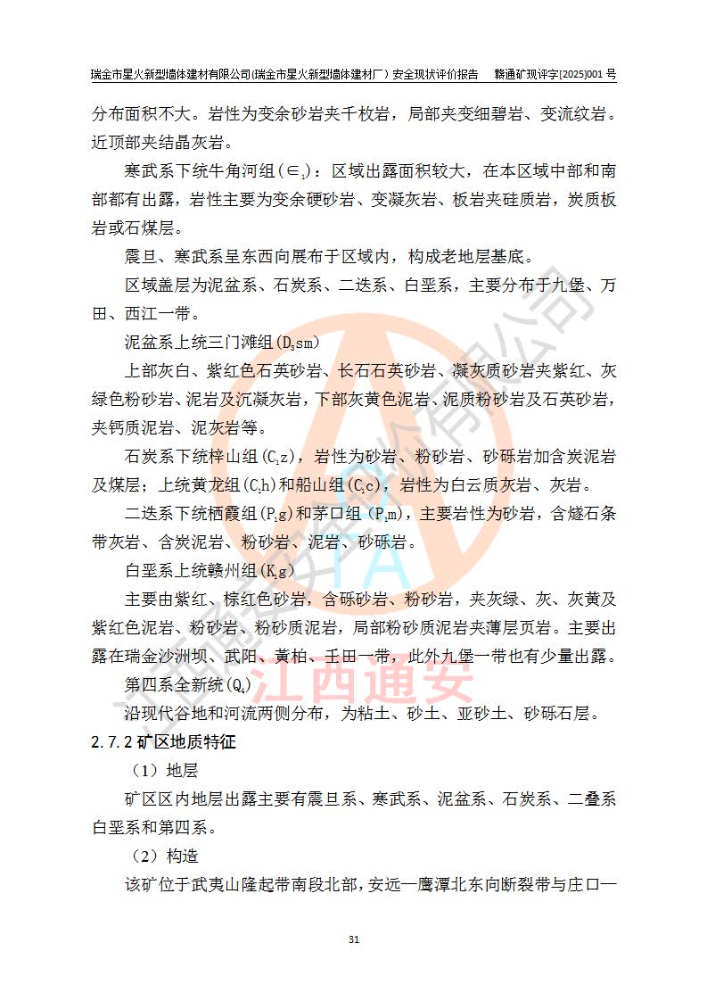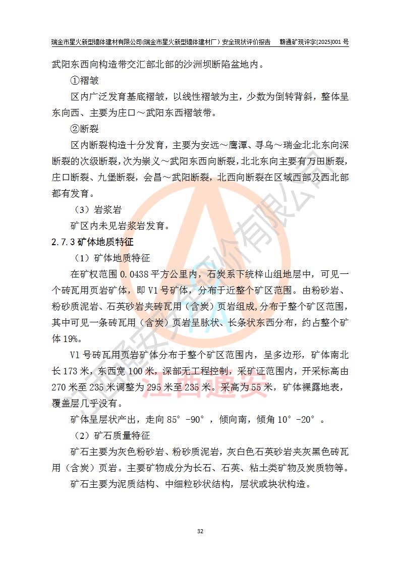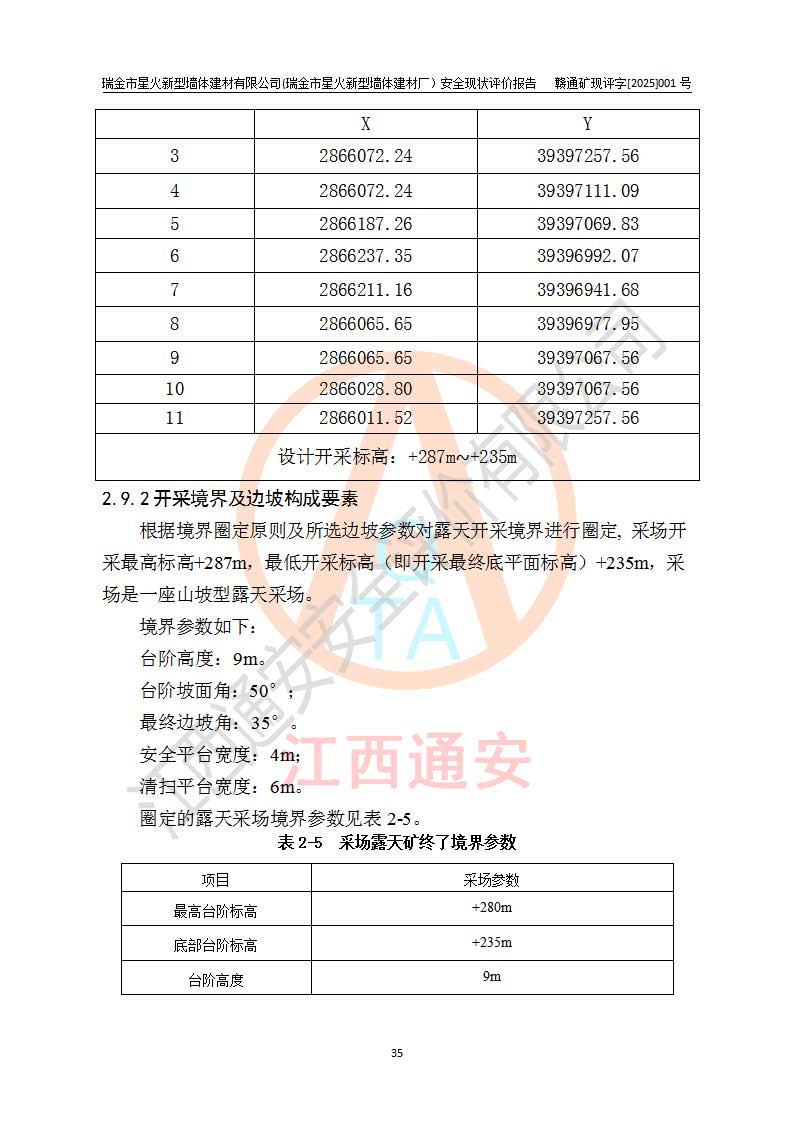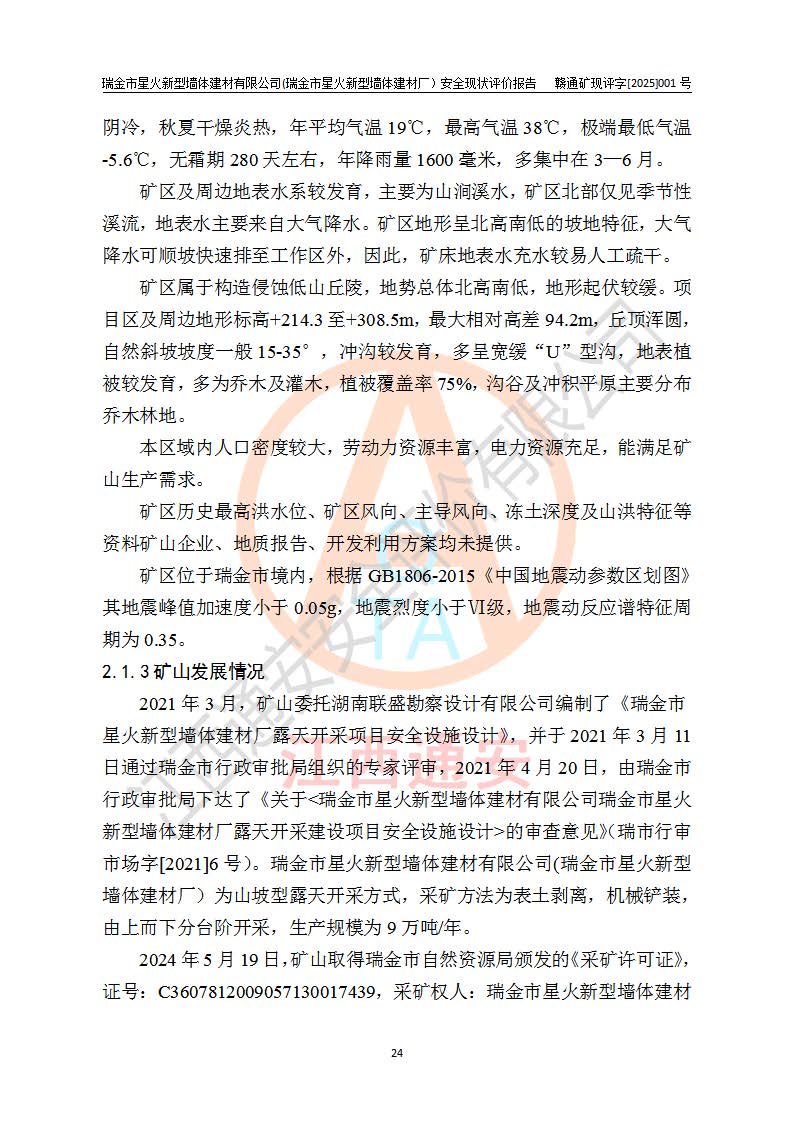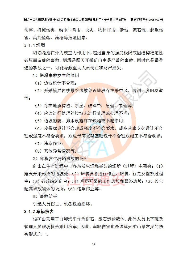 其它 | 瑞金市星火新型墻體建材有限公司(瑞金市星火新型墻體建材廠)設(shè)備、設(shè)施和場所基本符合**安全生產(chǎn)有關(guān)法律、法規(guī)、標(biāo)準(zhǔn)及規(guī)范的規(guī)定。礦山采用露天開采公路開拓汽車運(yùn)輸方式,安全生產(chǎn)條件良好,生產(chǎn)活動有安全保障;安全管理能滿足法規(guī)要求,礦山露天開采符合**規(guī)定的安全生產(chǎn)條件。 | ||||